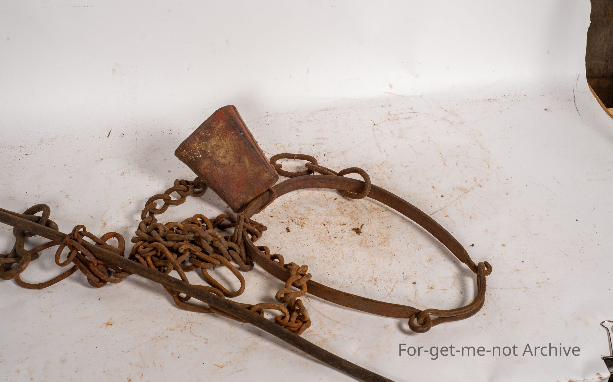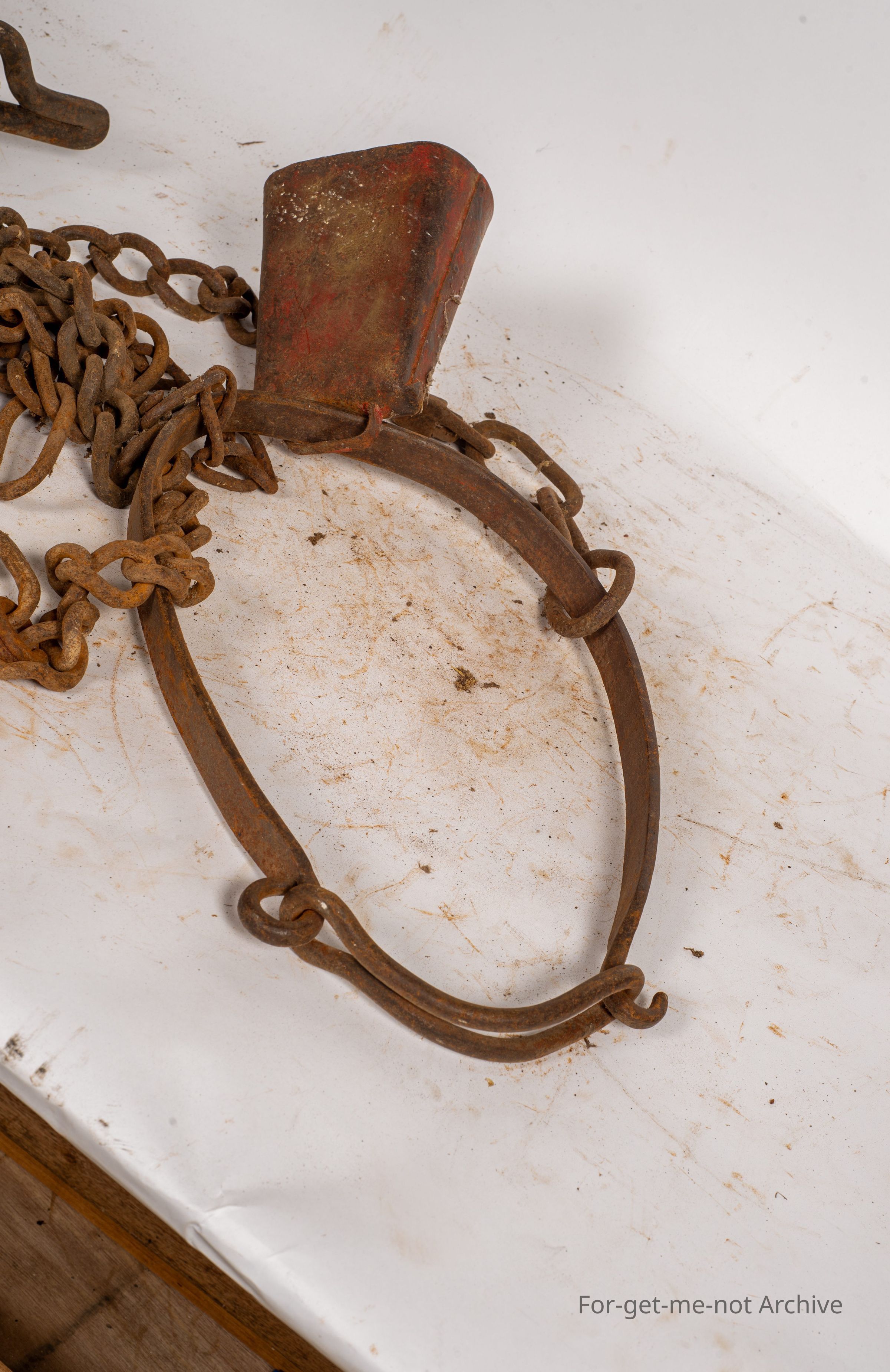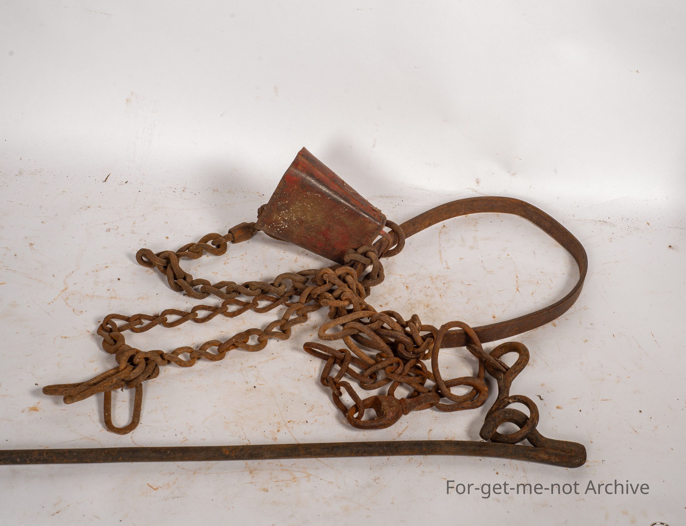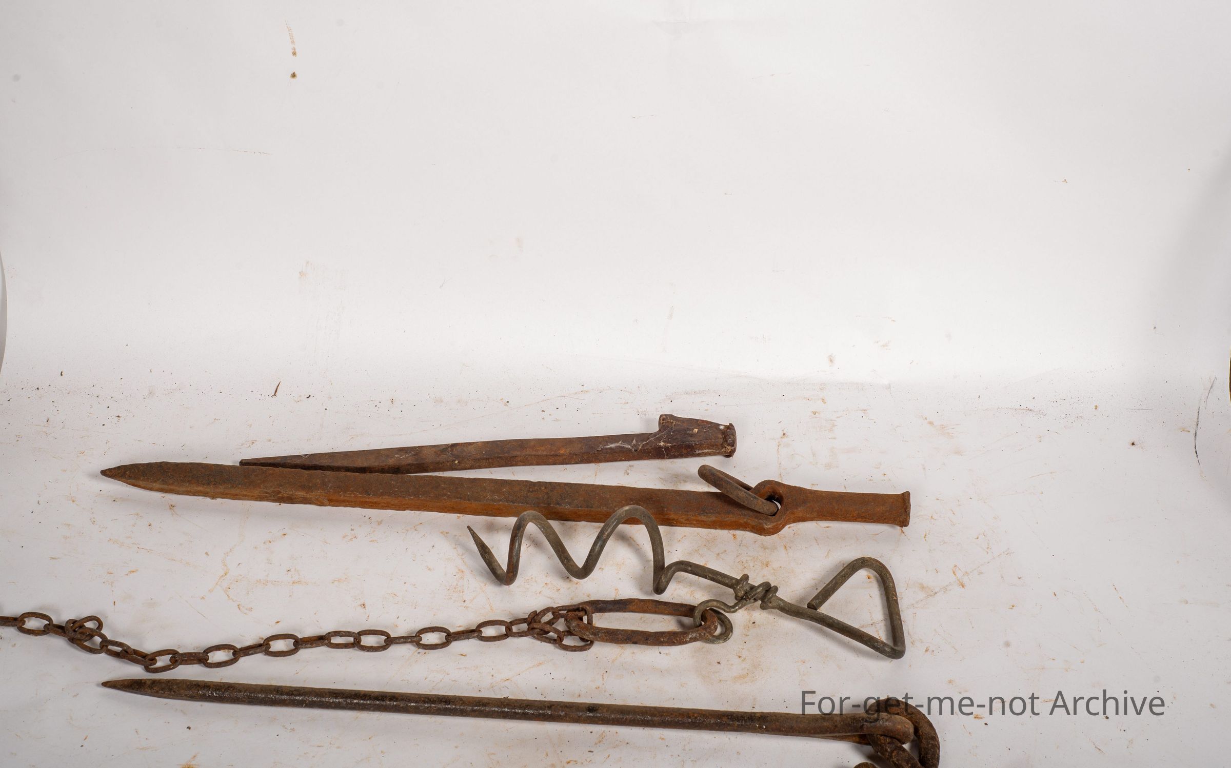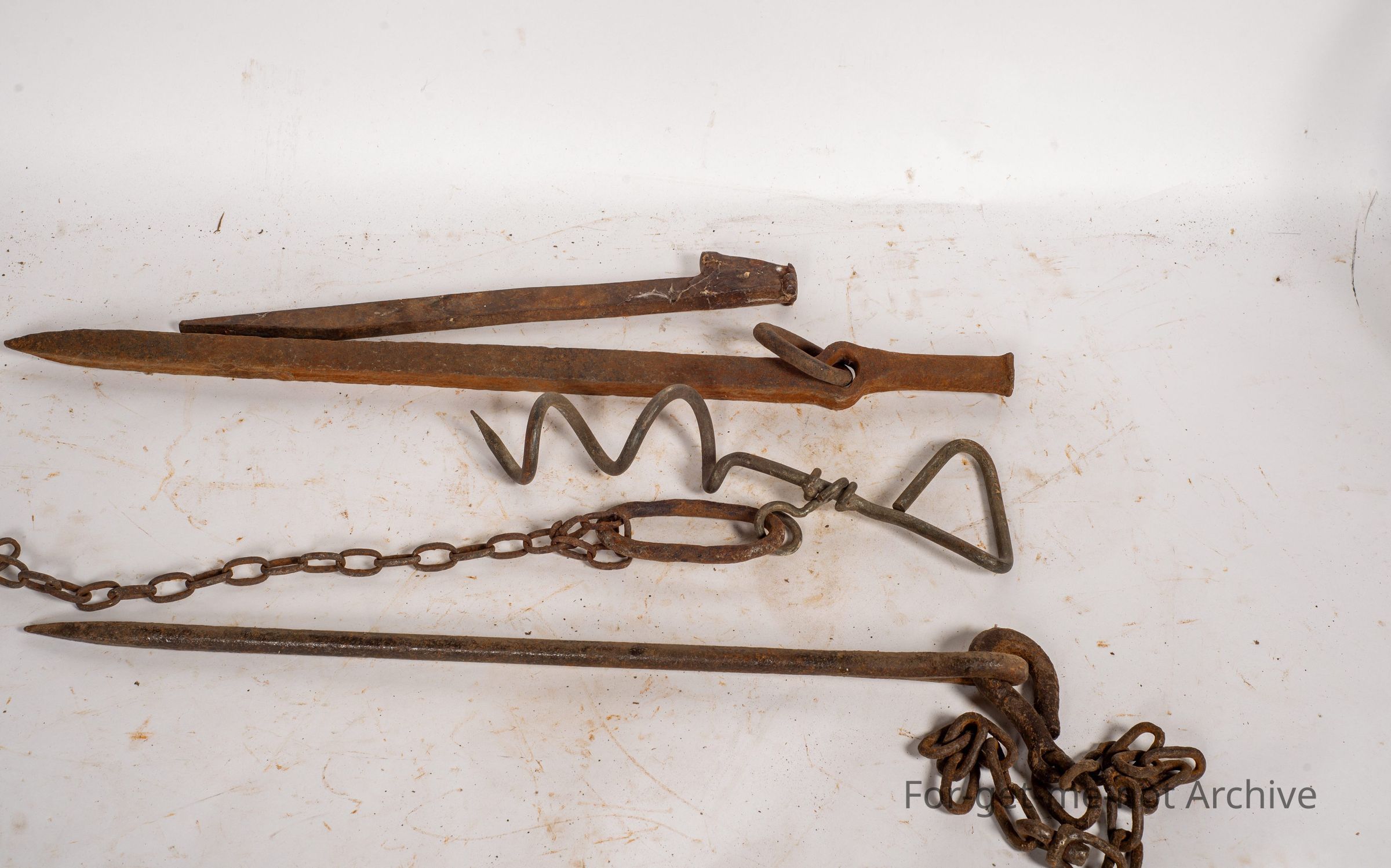 These are known as tether pins. They have the, shape to hammer them in and then be able to hammer them out. These were used in the period of tethering house cows, sheep or goats, which was a very common practice, for many, many years. They were usually tethered on the roadside, with people that didn't own a property. The group with the tether pins is a iron loop that looped around the neck of a cow with a bell. Also had a chain. These loops were sold by Lasseter's through Lasseter's catalogues as the loop to put around a cow's neck to have a cowbell on the neck.Collection