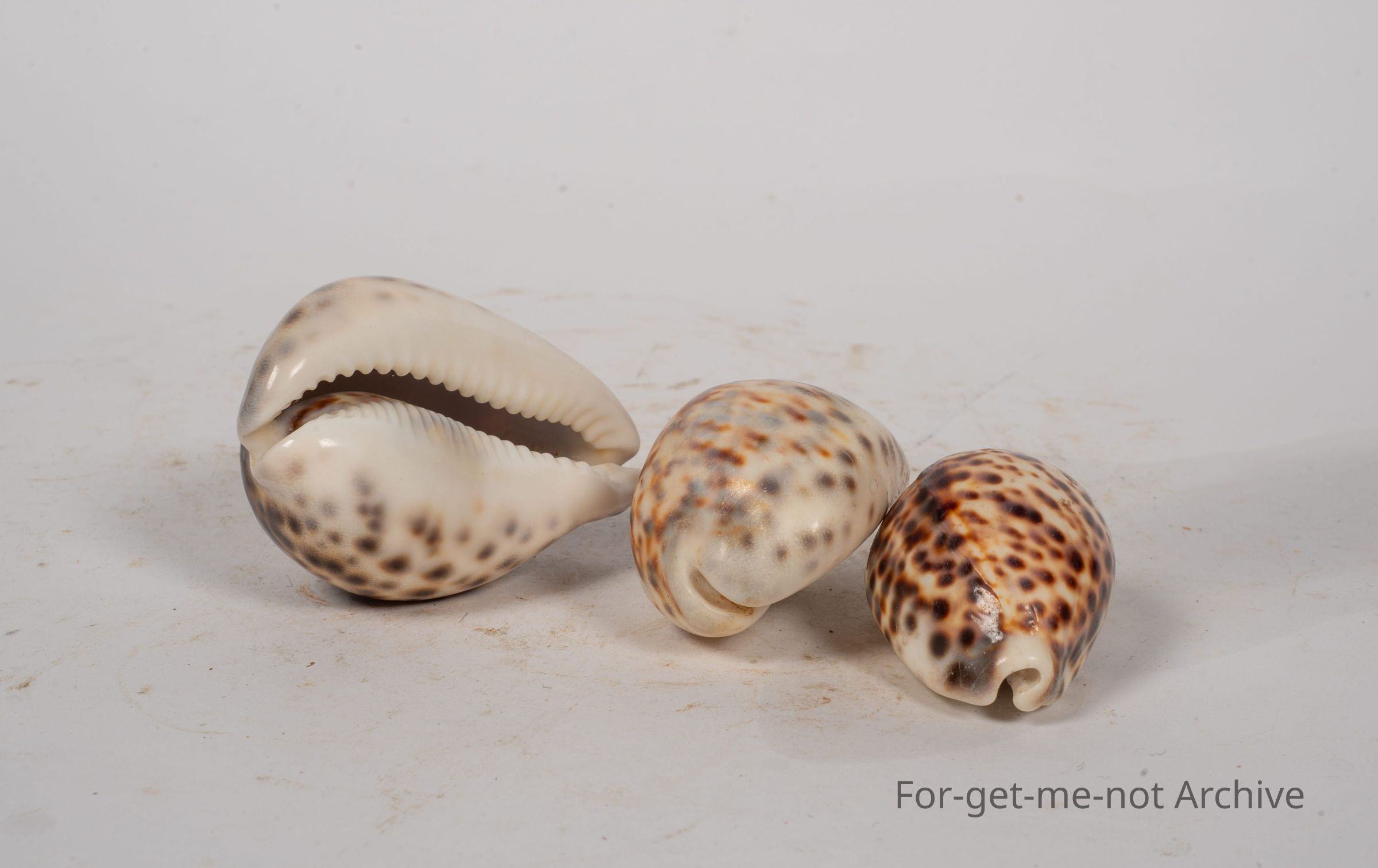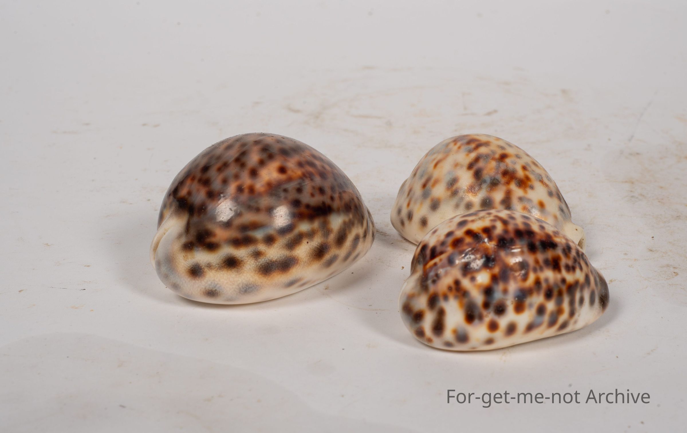 A group of 3 cowrie shells. These are quite a beautiful shell, mottled surfaces, and very smooth and delightful to handle.
