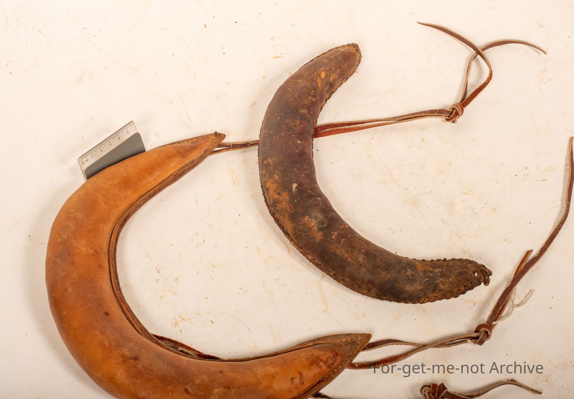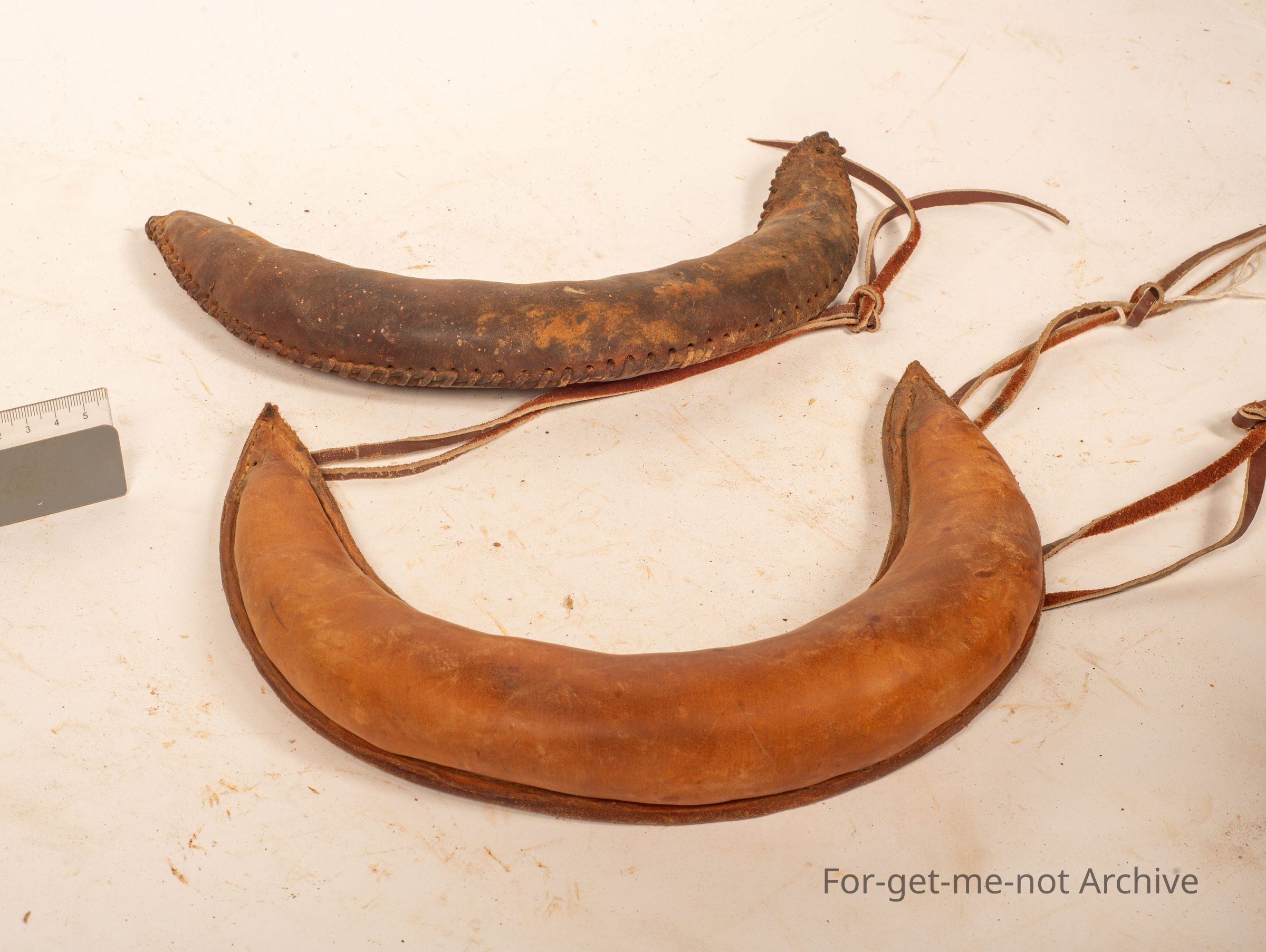 ,These are possibly crackers, used under the tail of a horse or harness horse to prevent the harness from slipping forward or the respective saddle. One's been used, one hasn't. Quite a an unusual thing to find. They're mainly discarded.Collection