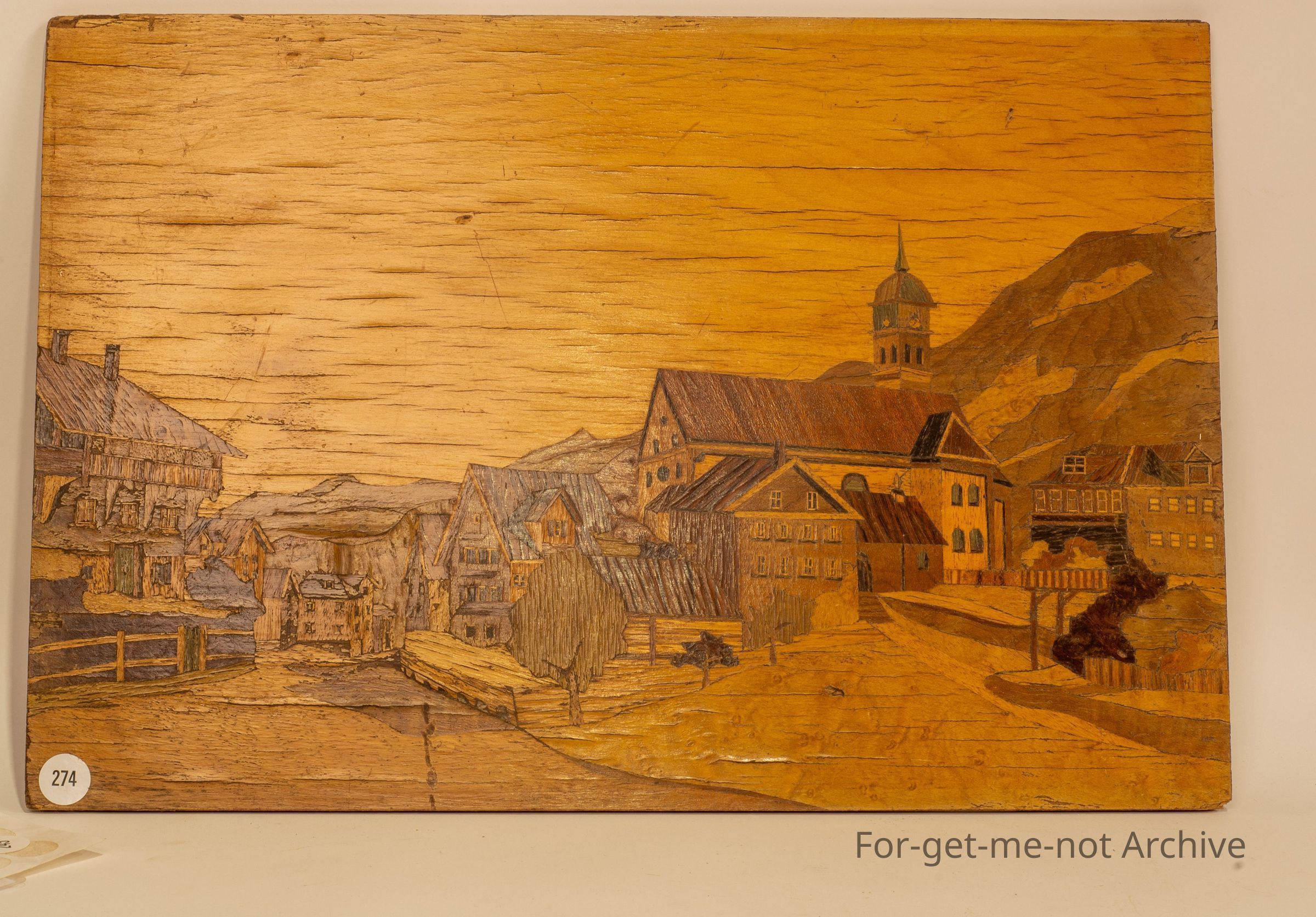 painting of town scene, constructed entirely of small pieces of wood- probably european