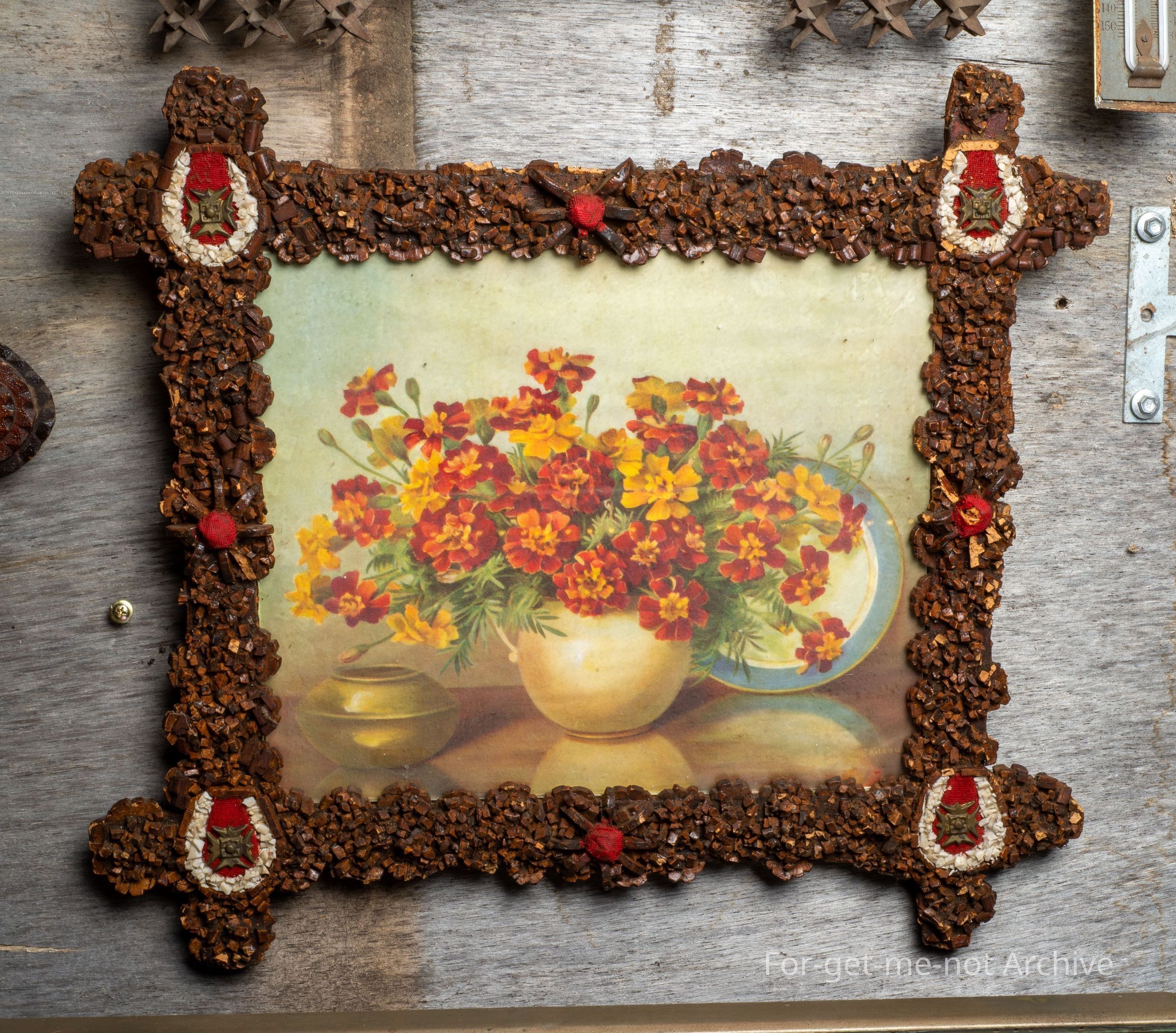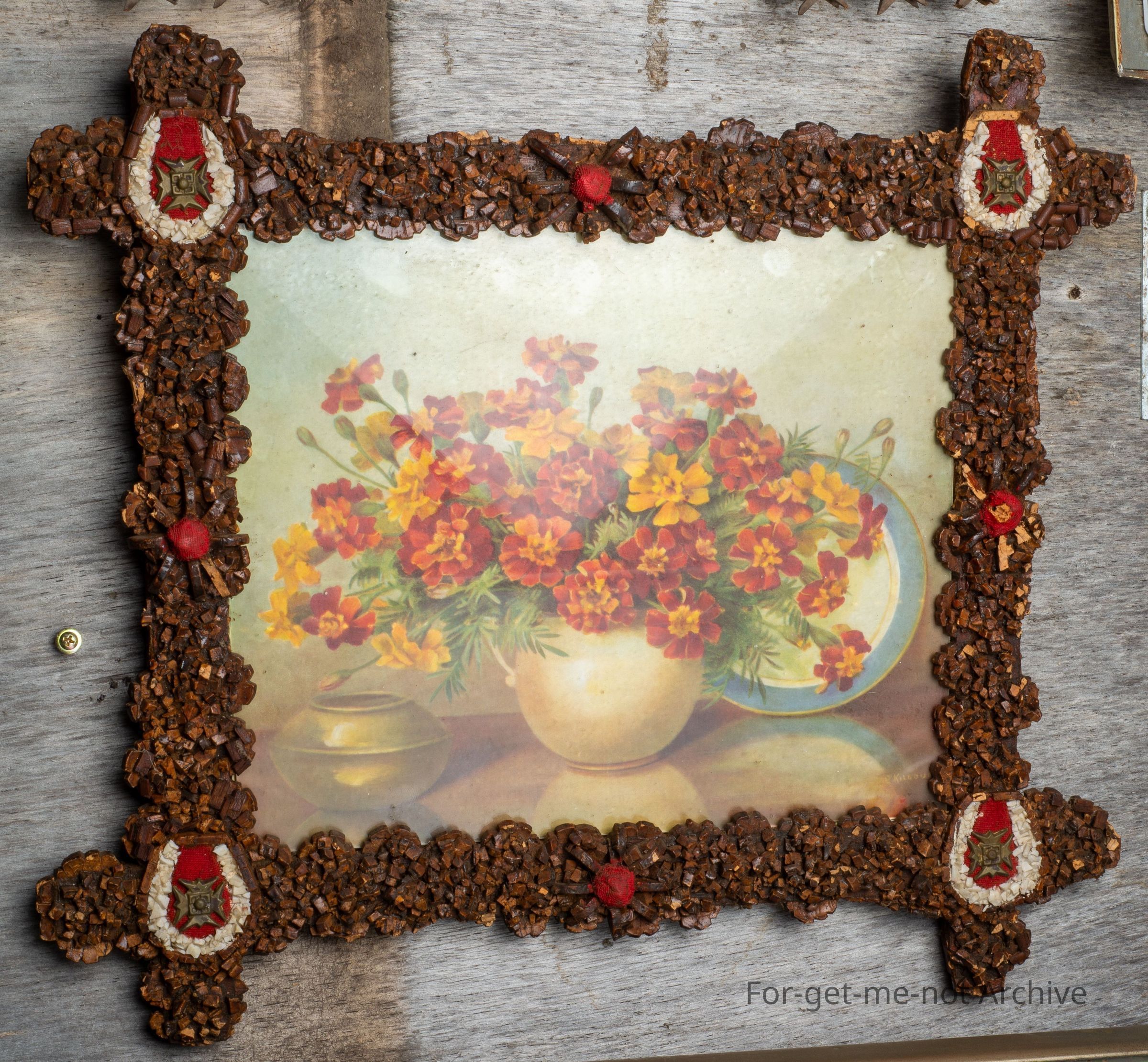 Hand crafted picture frame made with cork chips and coated with a varnish finish. Symbols representing military and good luck with up turned horseshoes