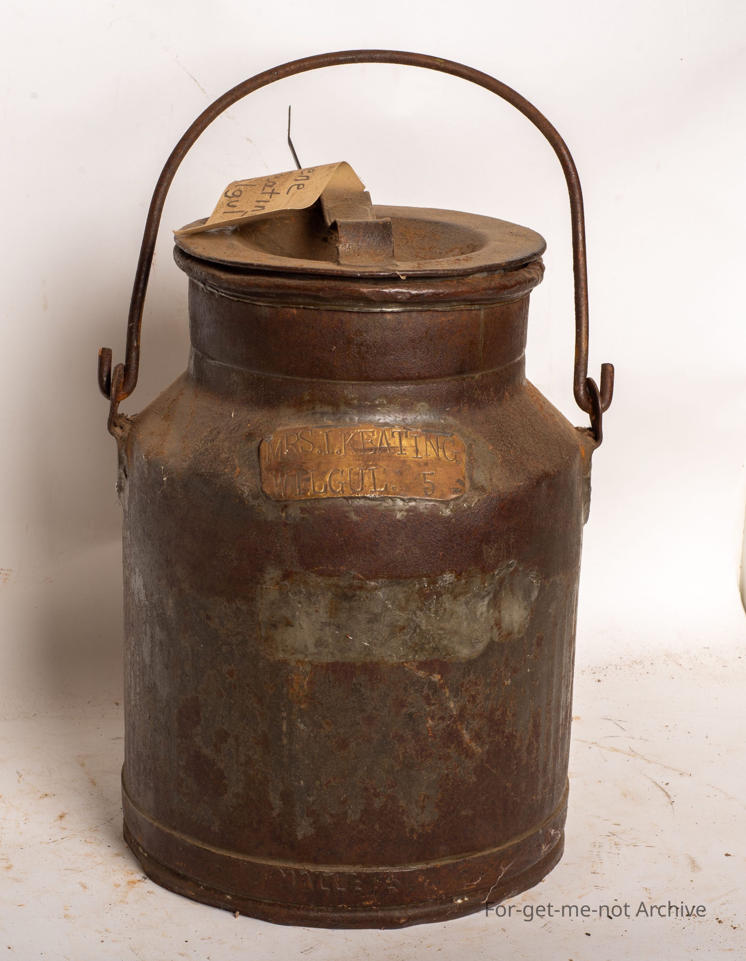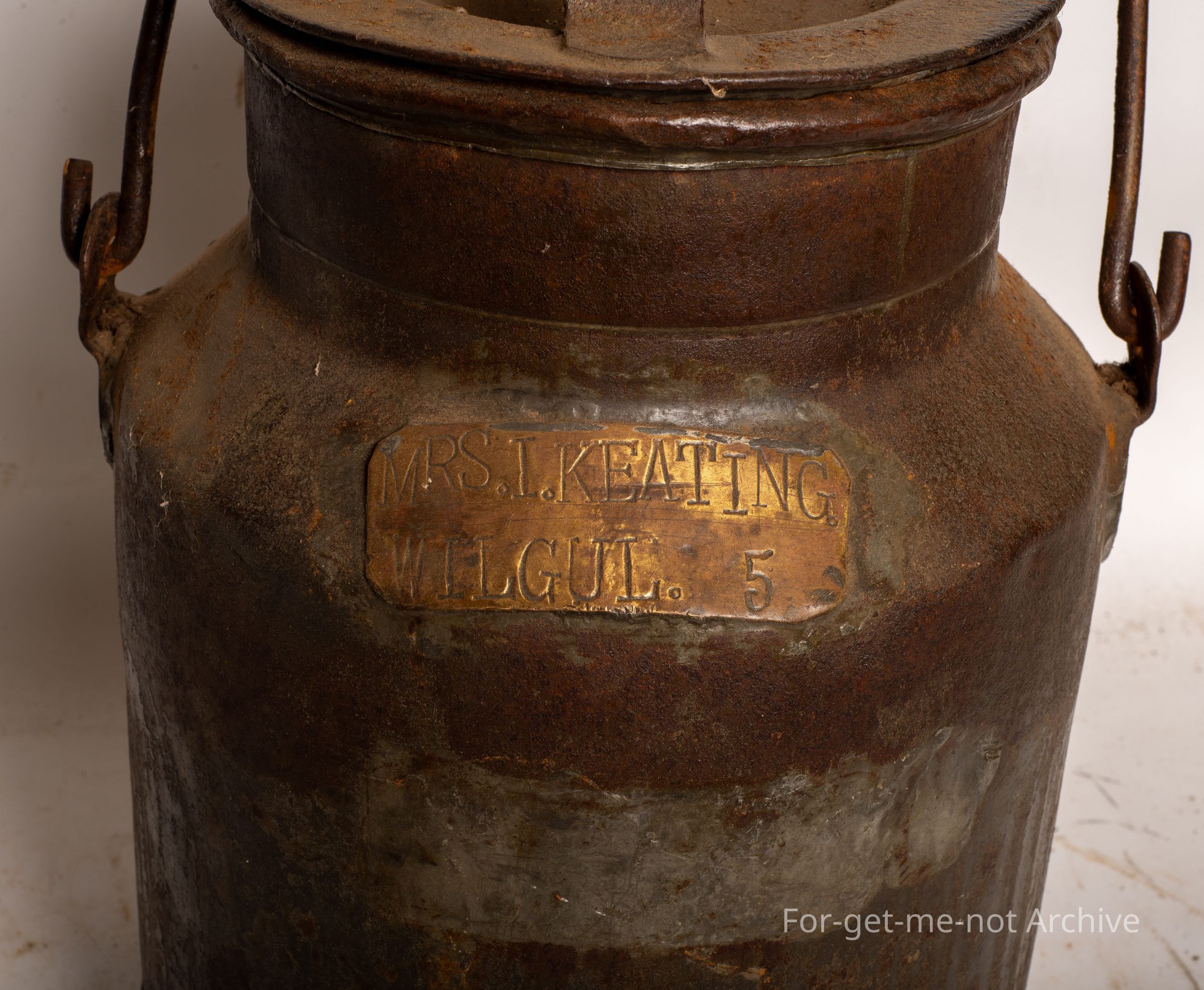 This is a small cream can with lid handle. A lovely spot, unusual size. This cream can, it has a brass plaque from Irene Keating, Wilgul