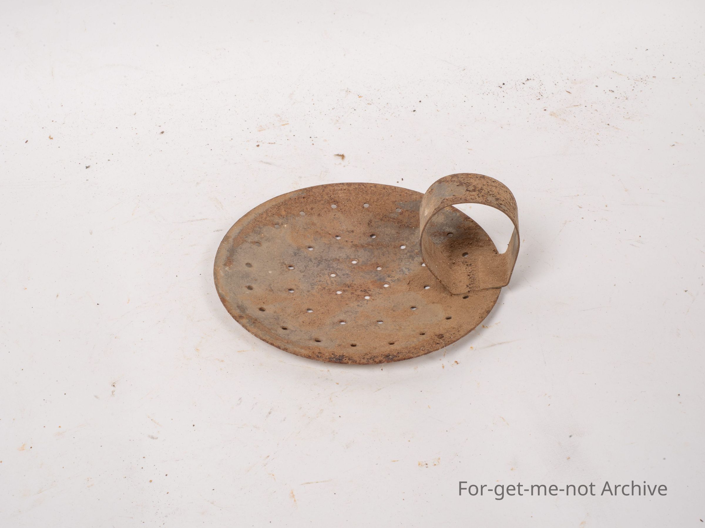 Is a small, cream scoop, perforated base, with a little tin handle. This is a homemade piece from the depression era. These were used for skimming cream from cold milk.