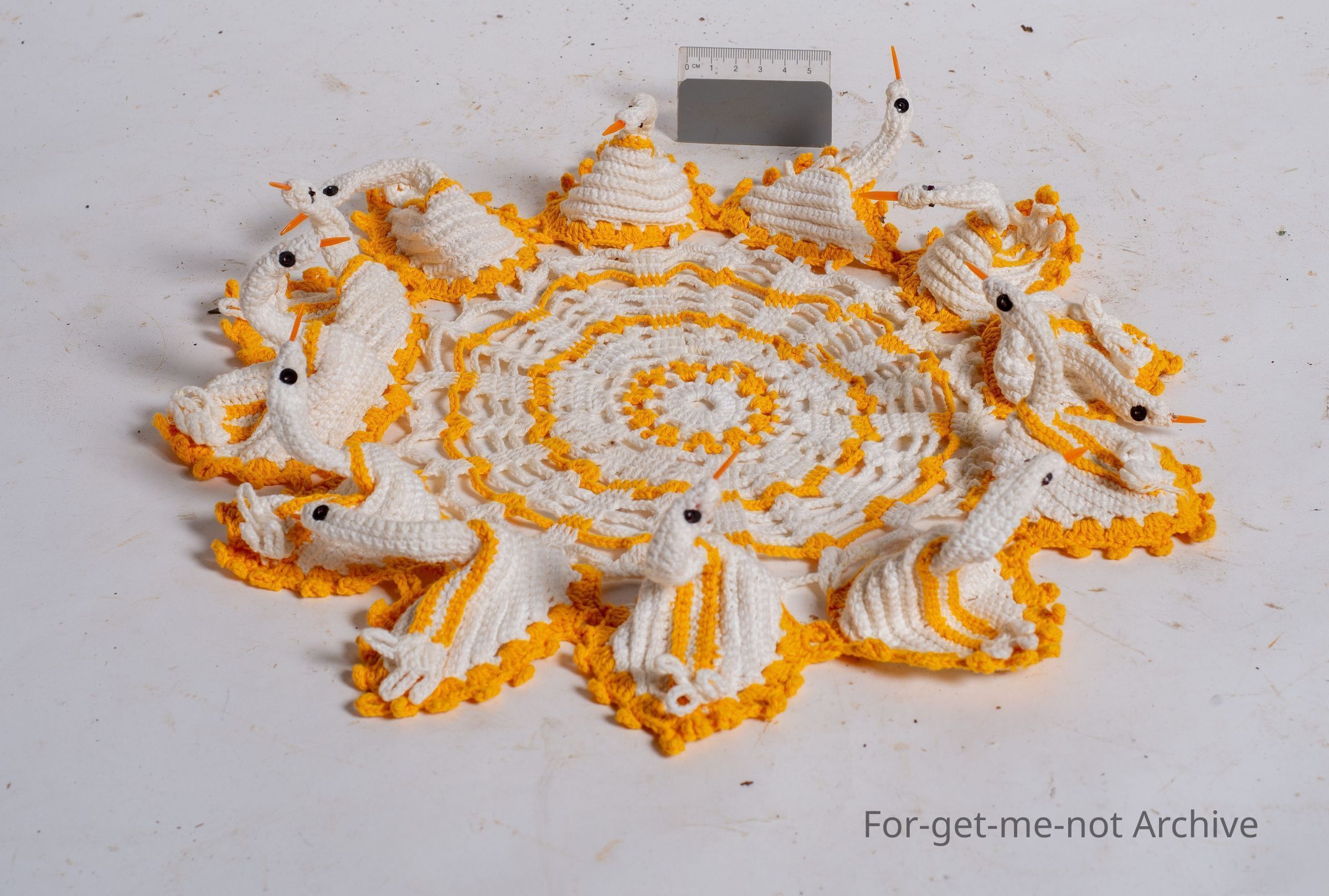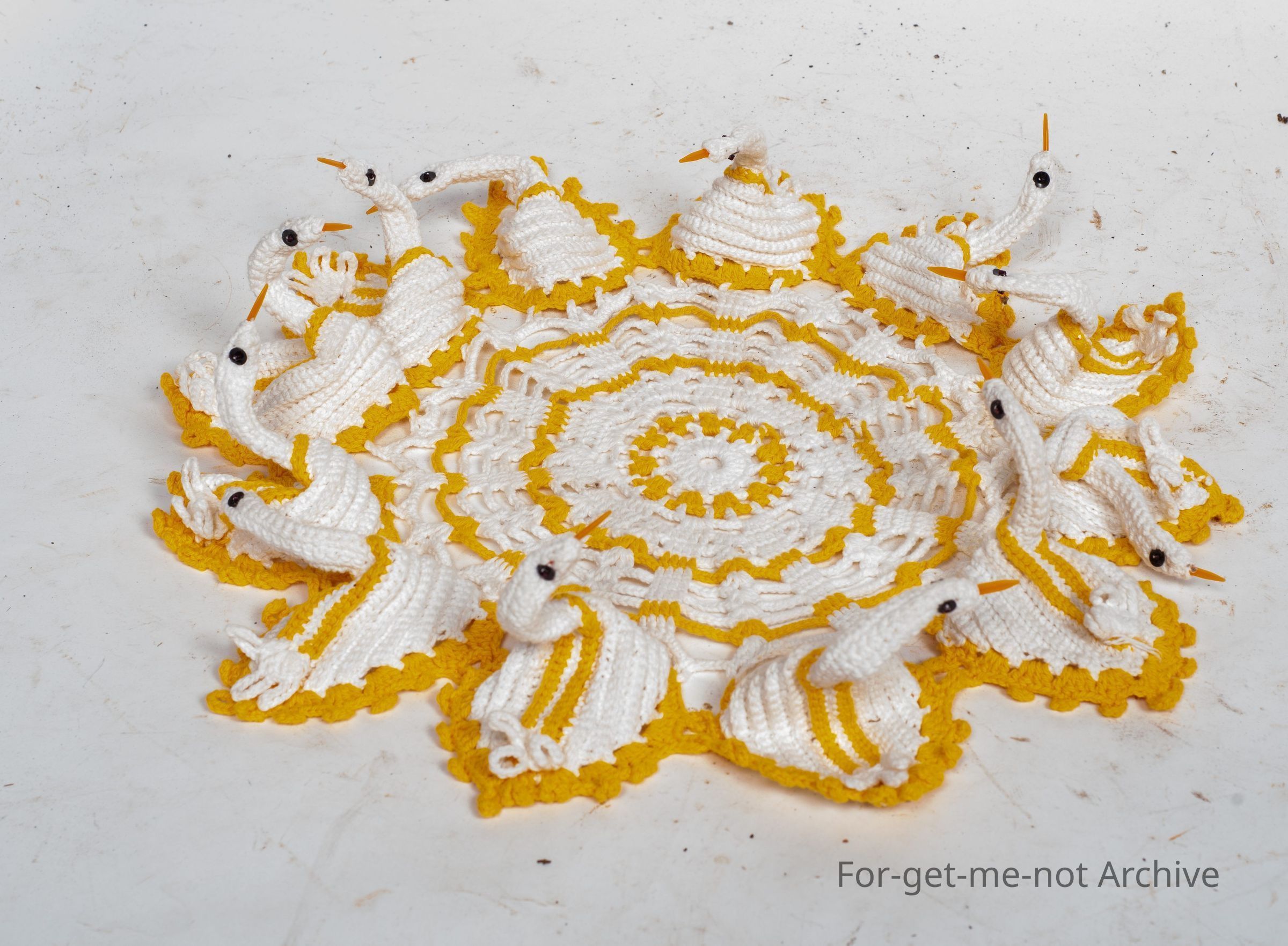 This is a craft piece of a crotchet doily. Quite beautifully done, in white and yellow in a circular fashion with 3D swans built into design
