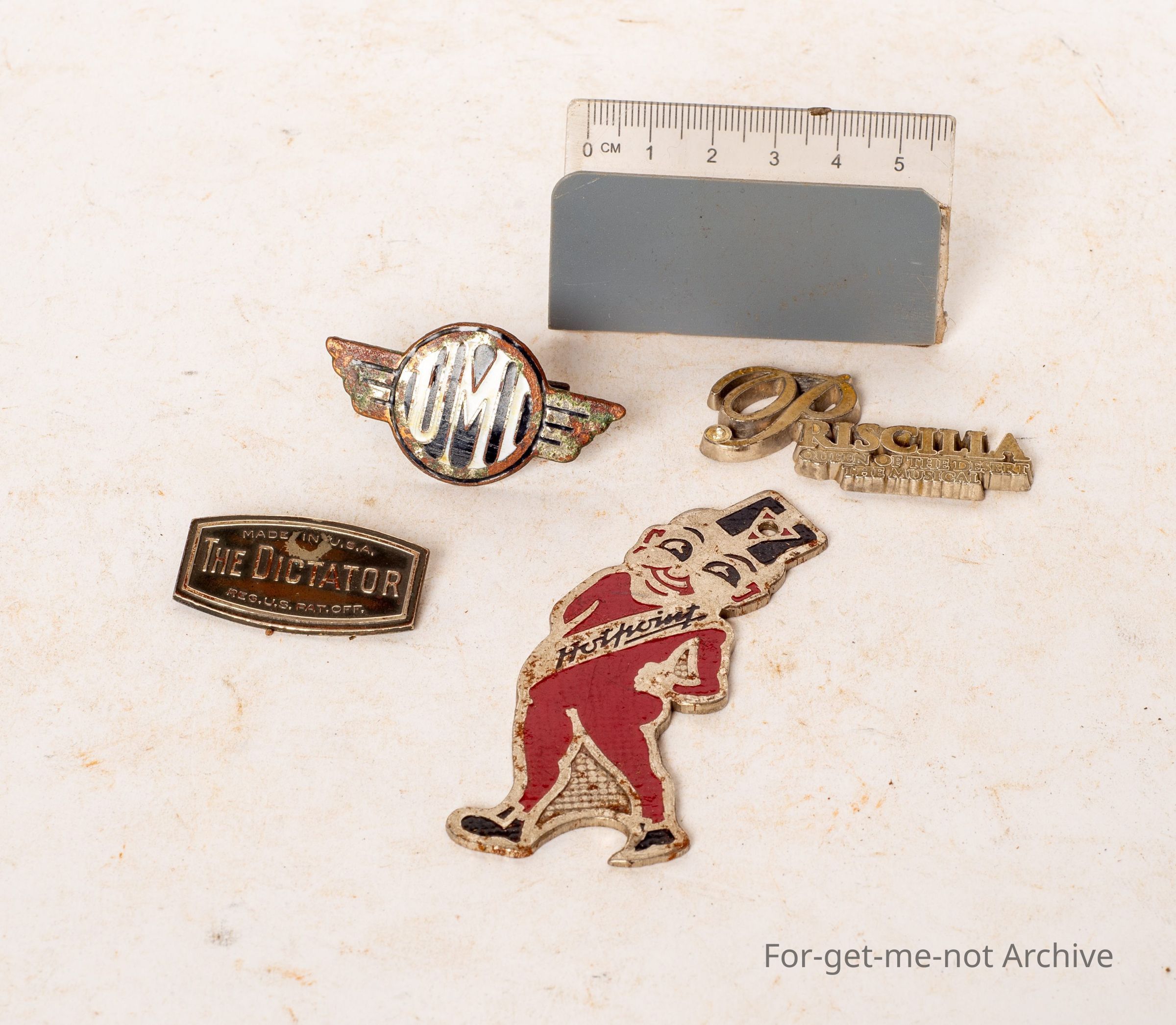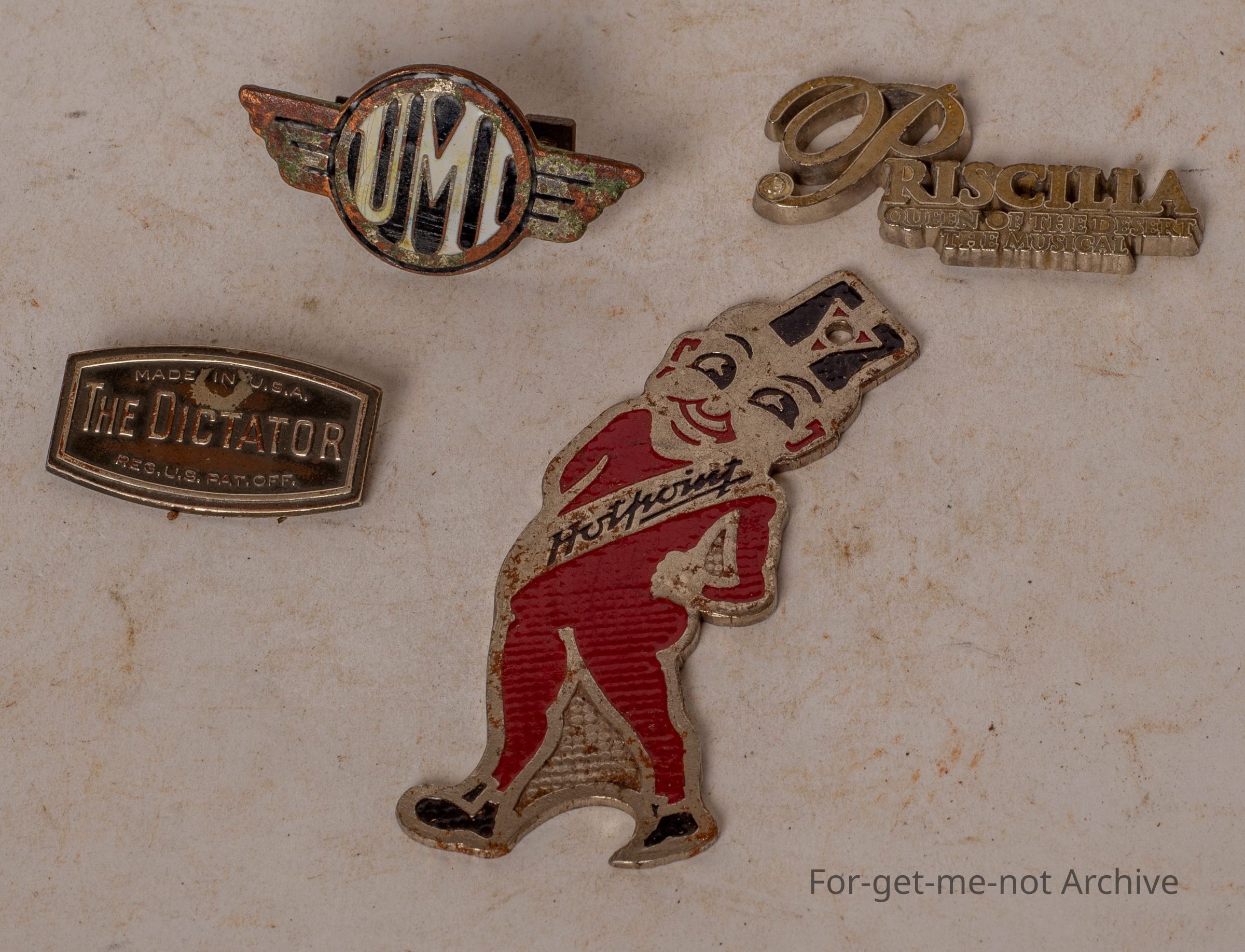 First one is a crown seal bottle opener, enamelled with hot point, with the image of a clown type figure. Lovely piece. Second one is UMI, a badge from probably an early radio. The third piece is the Dictator made in USA, not sure what that was from. 4th piece is from Priscilla, Queen of the Desert Musical. Wonderful film.Collection