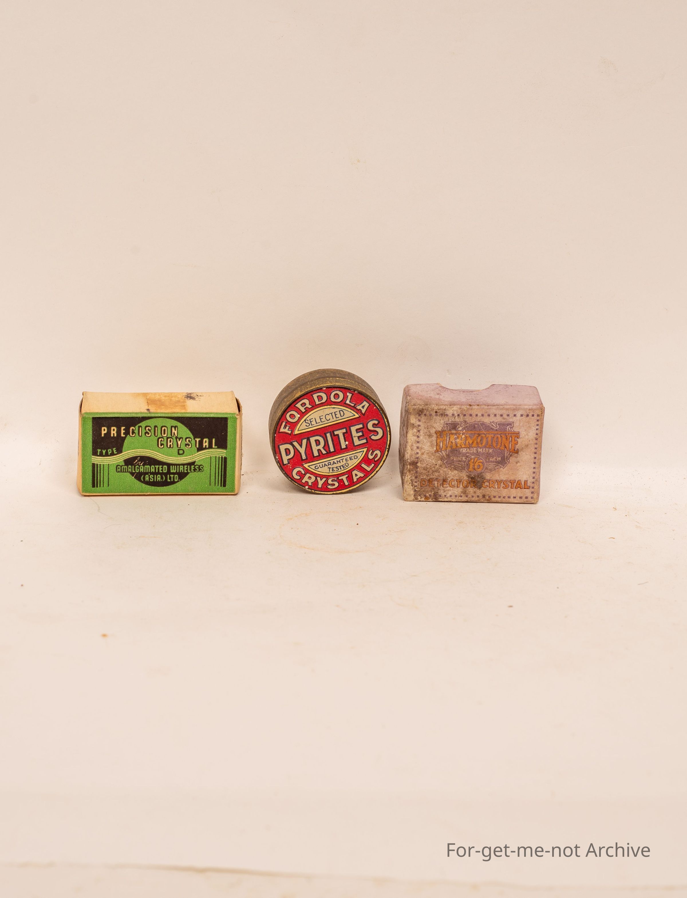 Another group of 3 radio crystal tins, 2 cardboard boxes, 1 tin, all held crystals