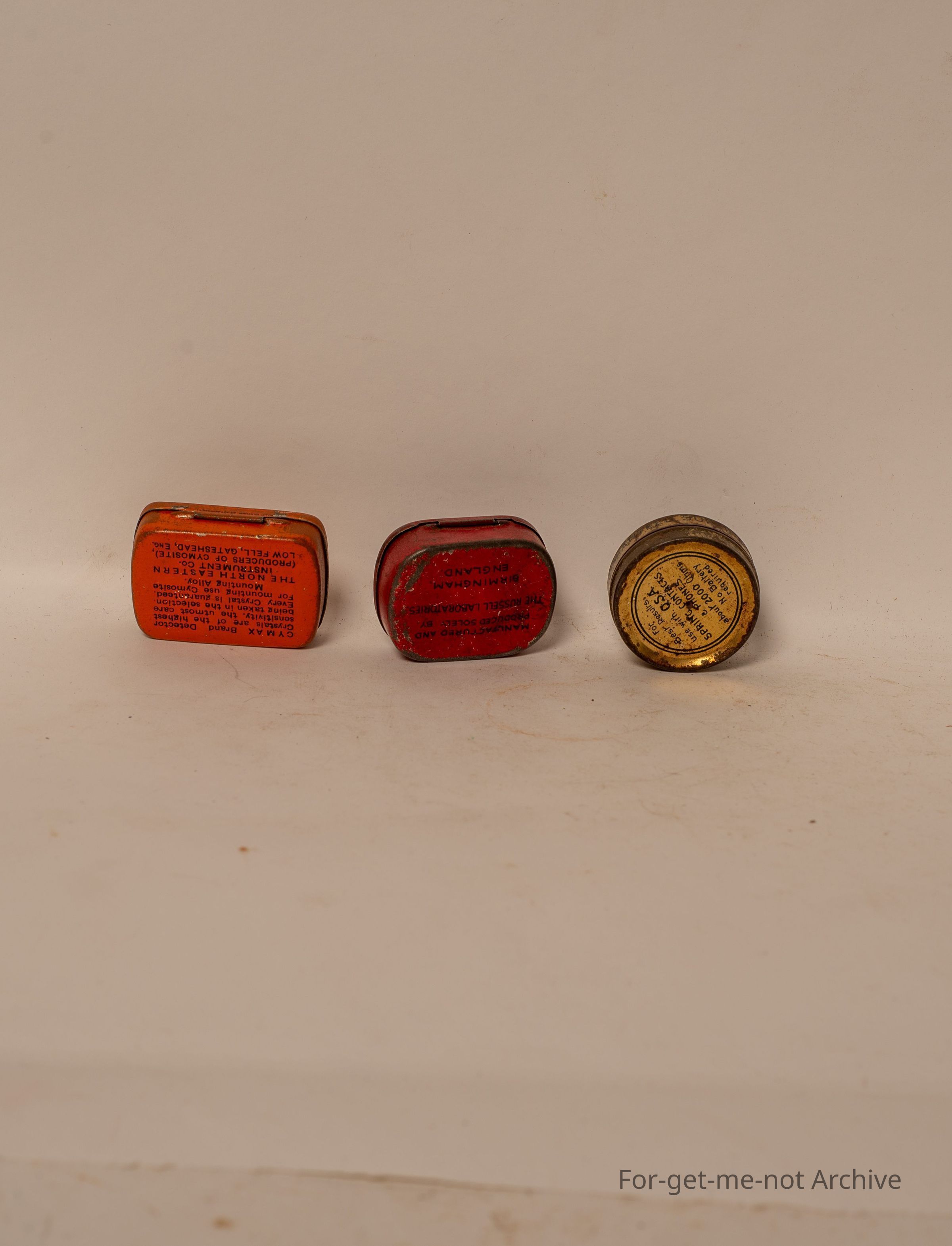 Yet another group of 3 different radio crystal tins that held the crystals for kids' crystal radios.