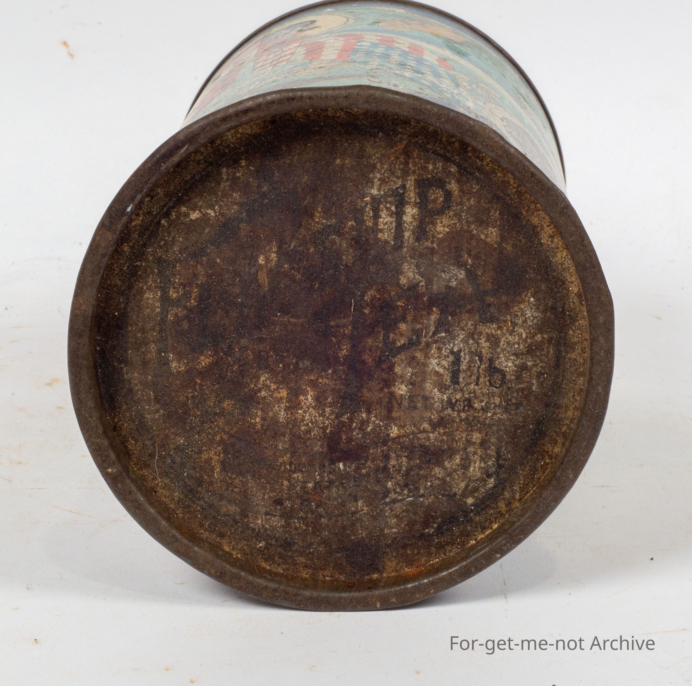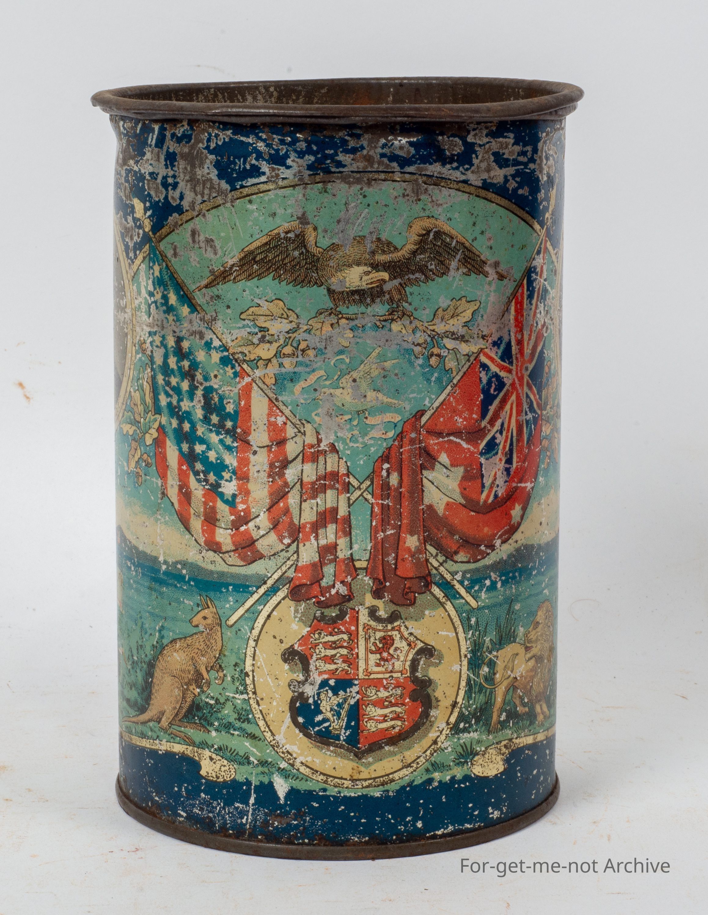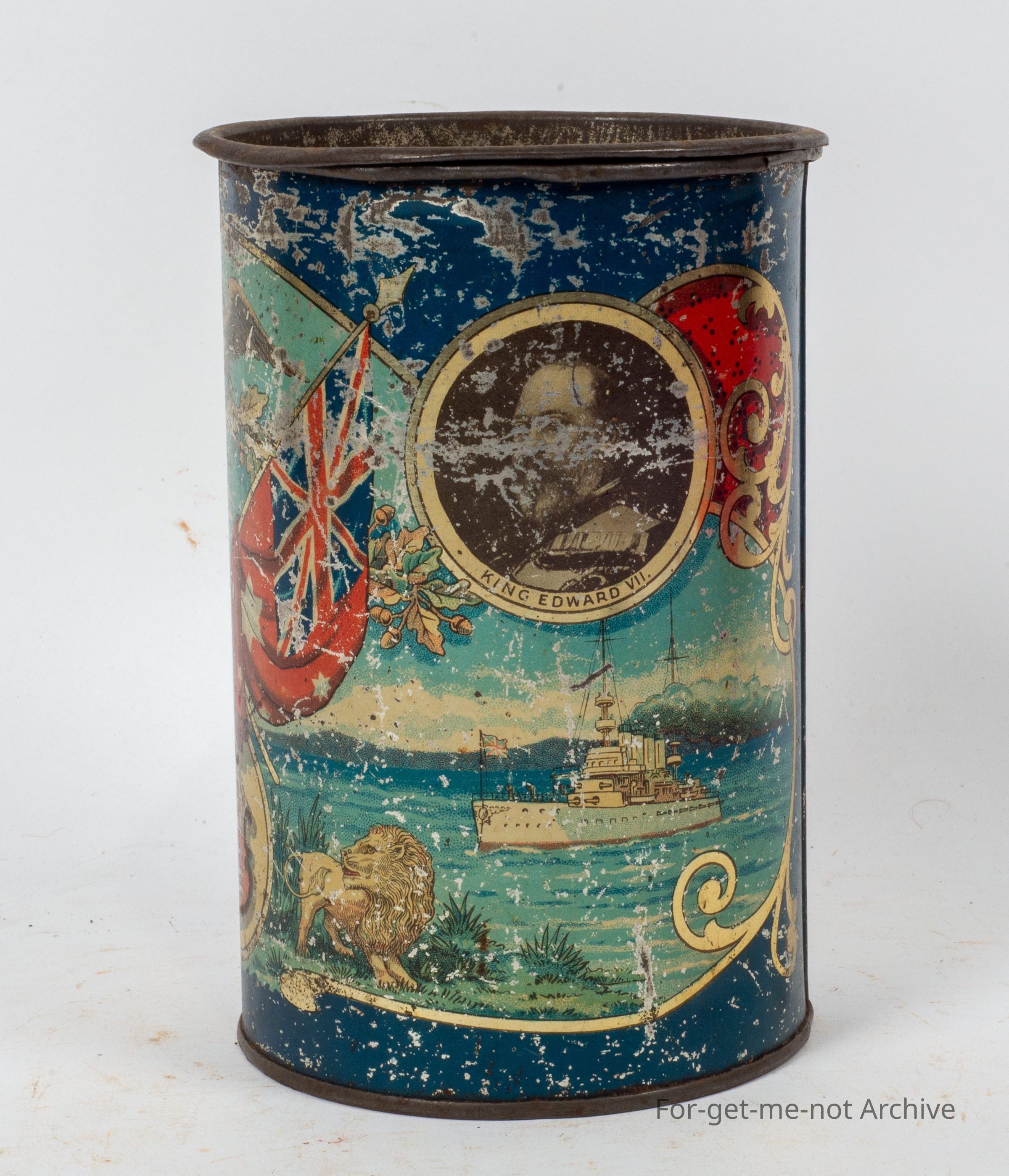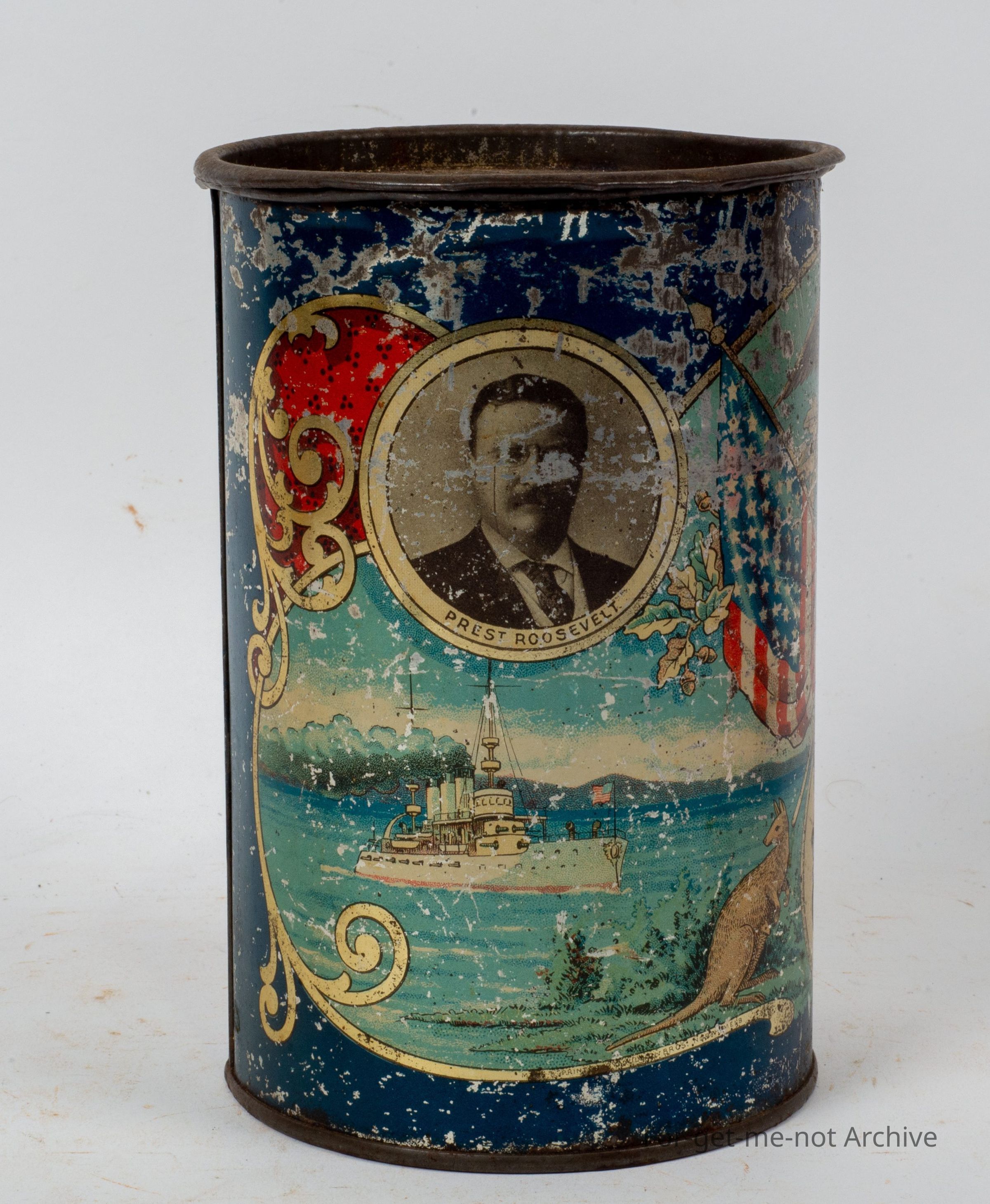 Cylindrical tin of flag ship te with marine scenes, down condition but intersting,one pound in size, jimage of President Roosevelt and King Edward