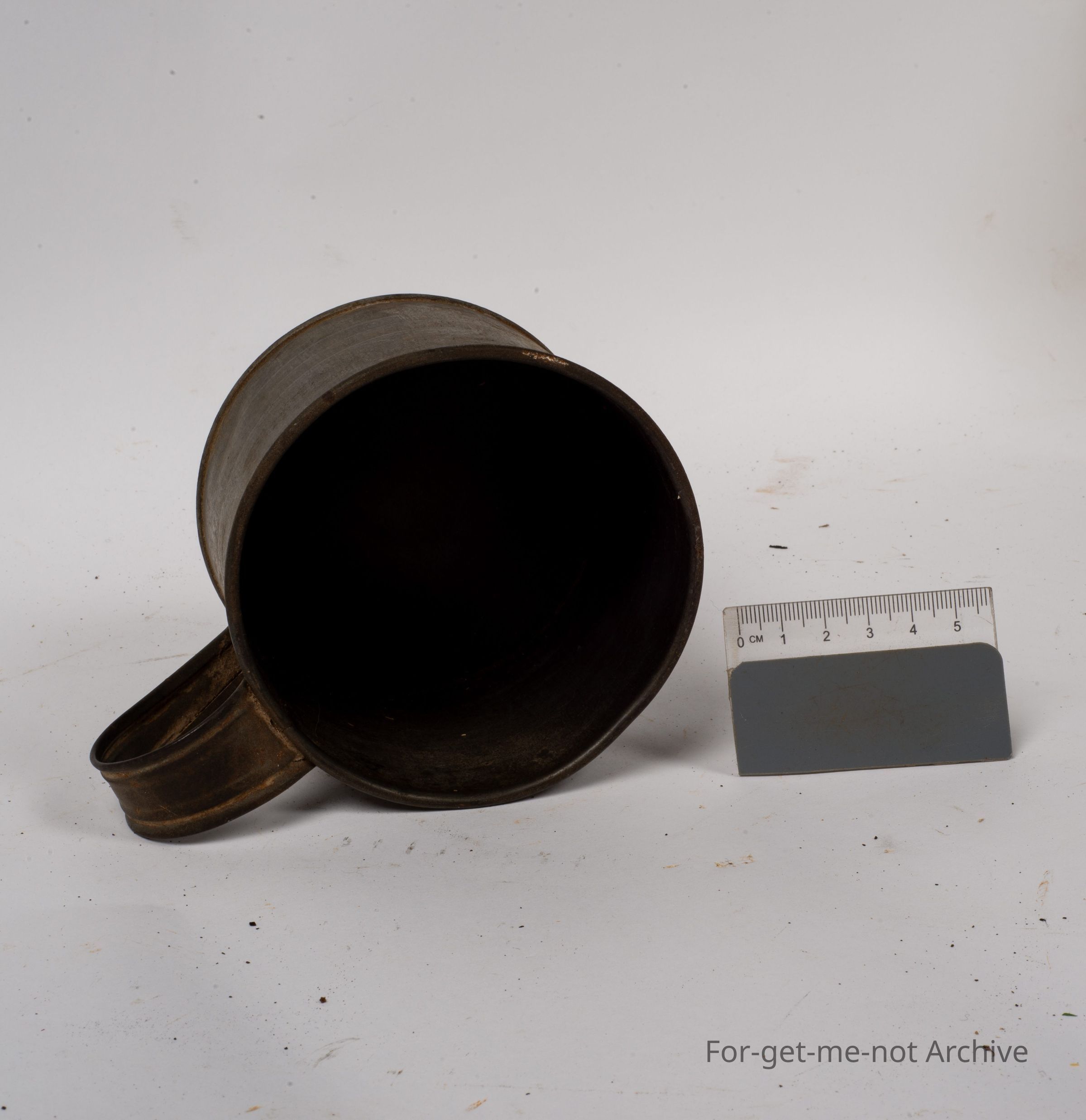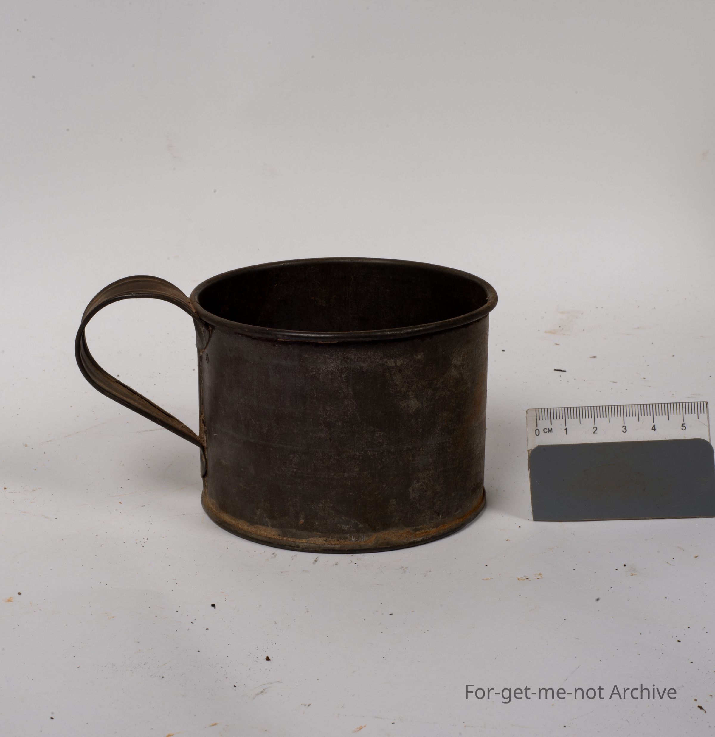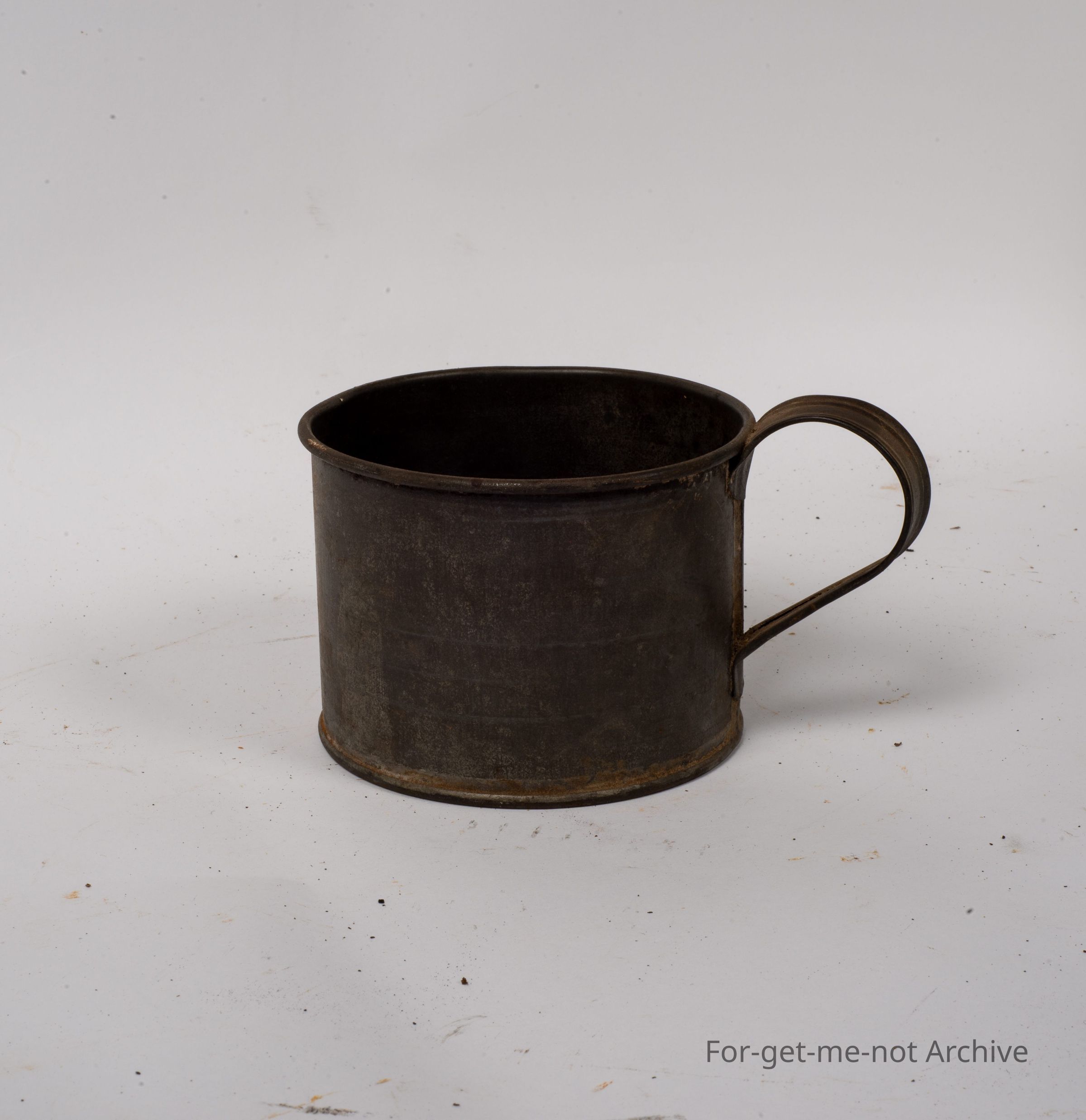Is a lovely homemade tin cup, a lovely handle. Whoever made this one had a fair bit of spill with soldering. This hasn't even got any rust, but a depression earpiece,