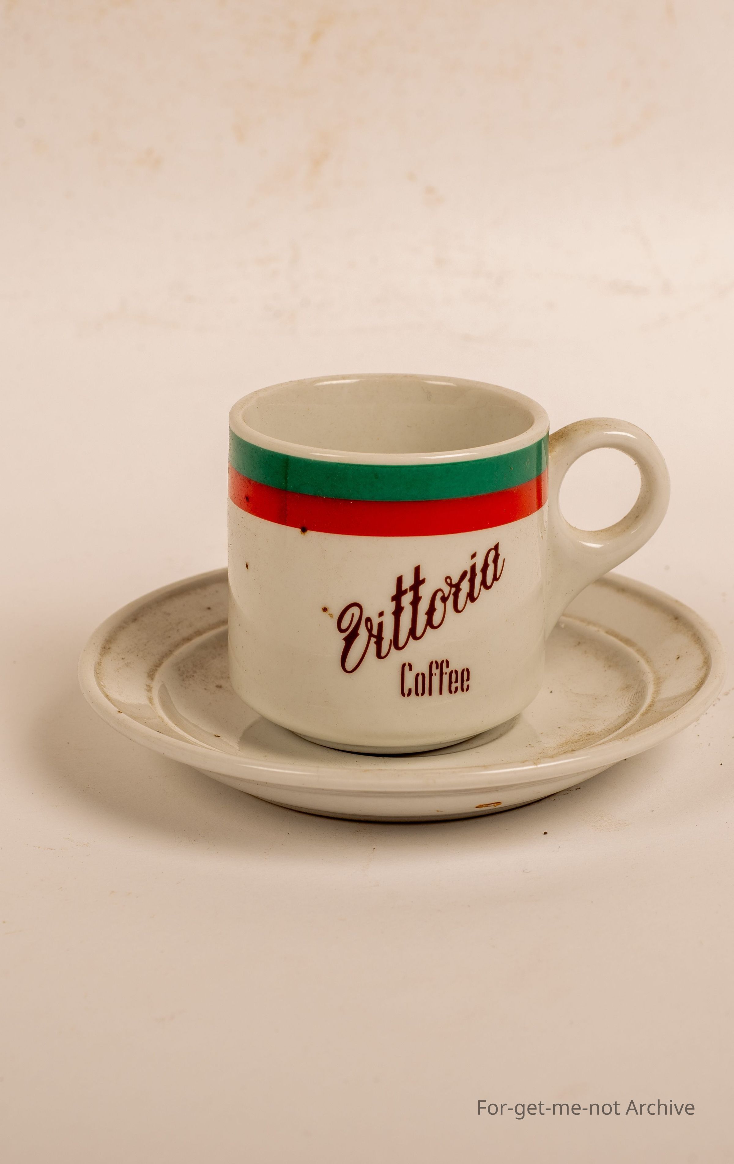 Cup and saucer ceramic advertising, Victoria coffee, in the sides for a short black.