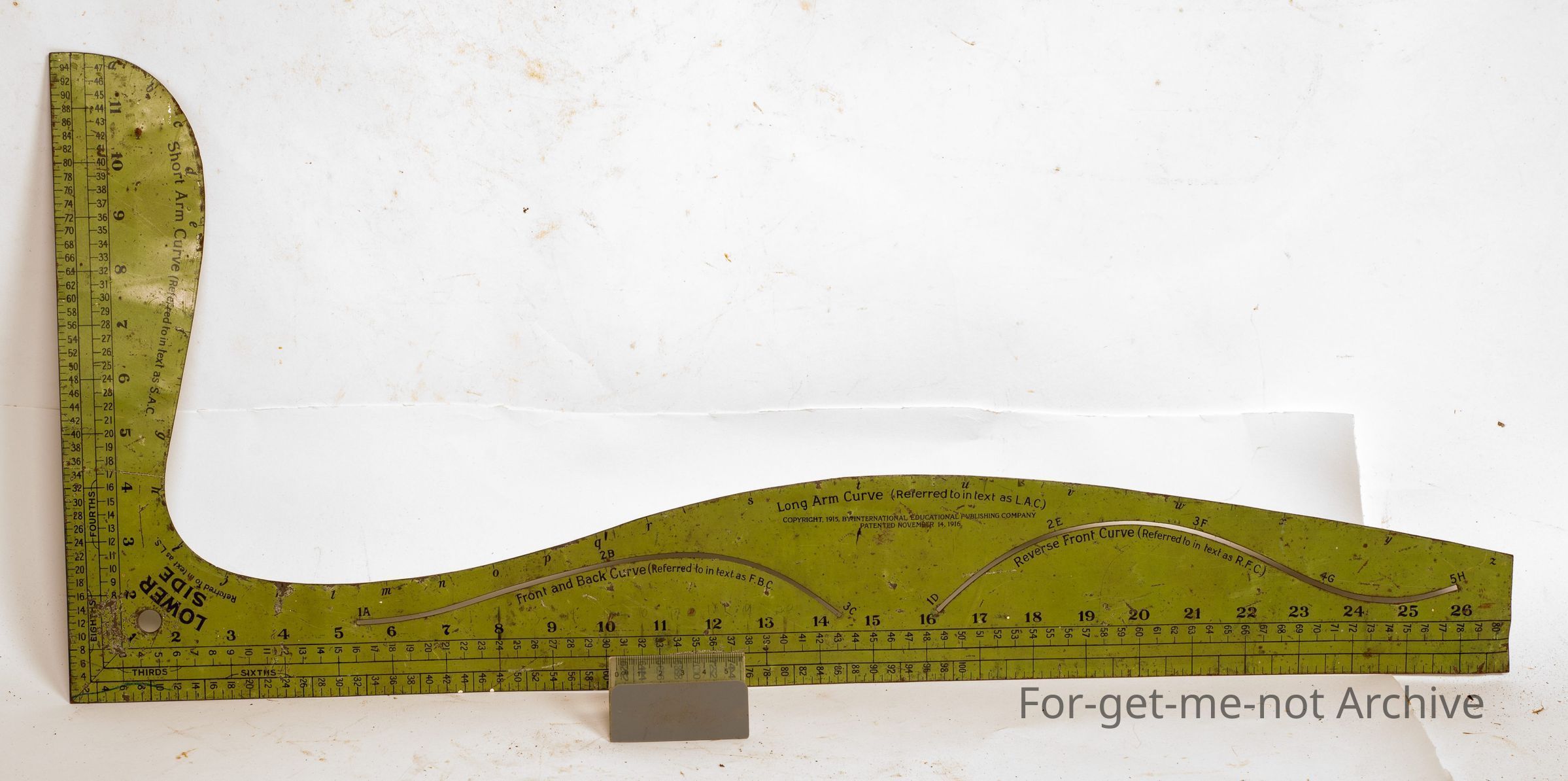 This is a tool called the Picken Square. The system of scales and curves designed for the use of dressmaking, the Women's Institute of Domestic Arts and Sciences. A very valuable tool for a dressmaker.Collection