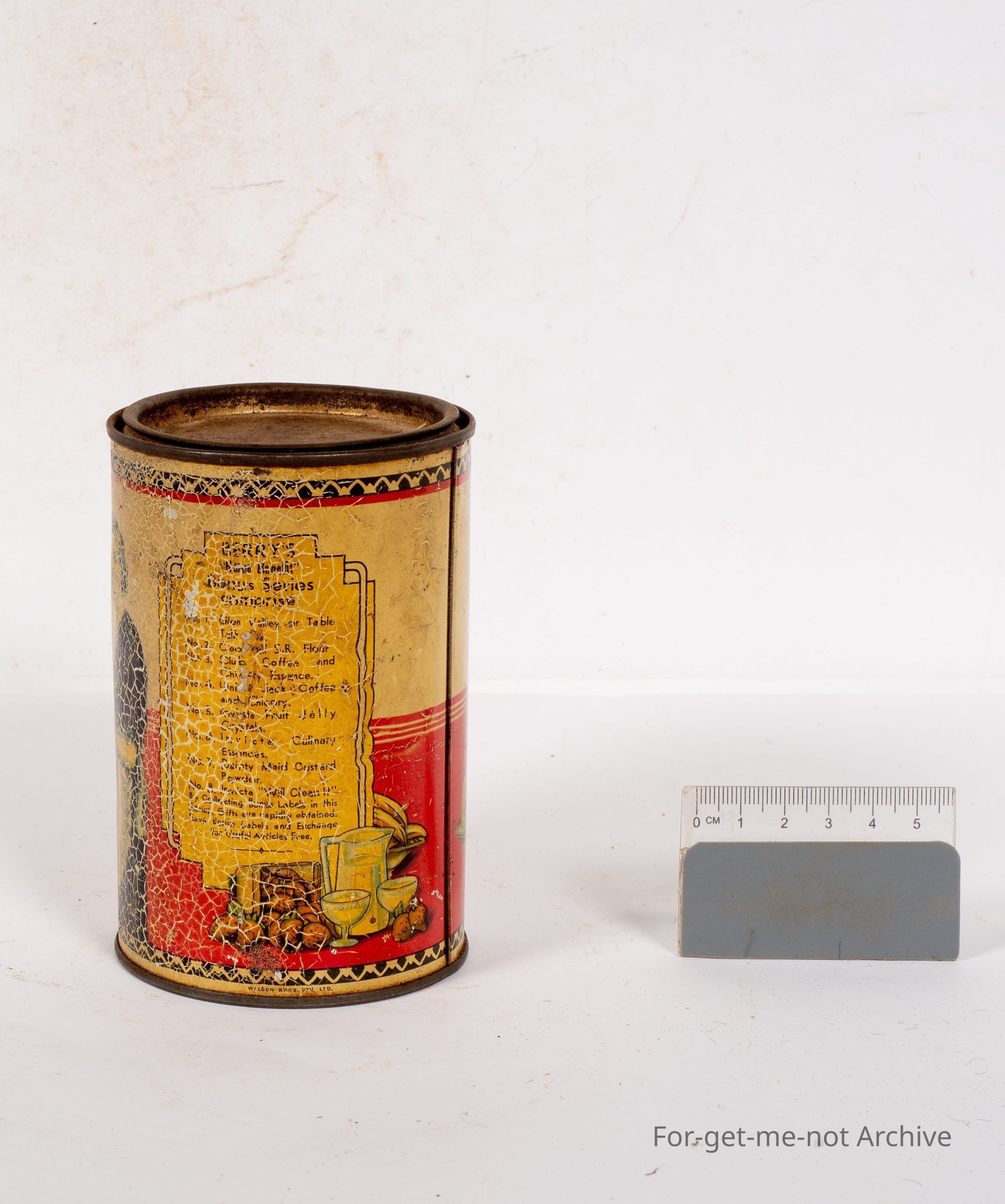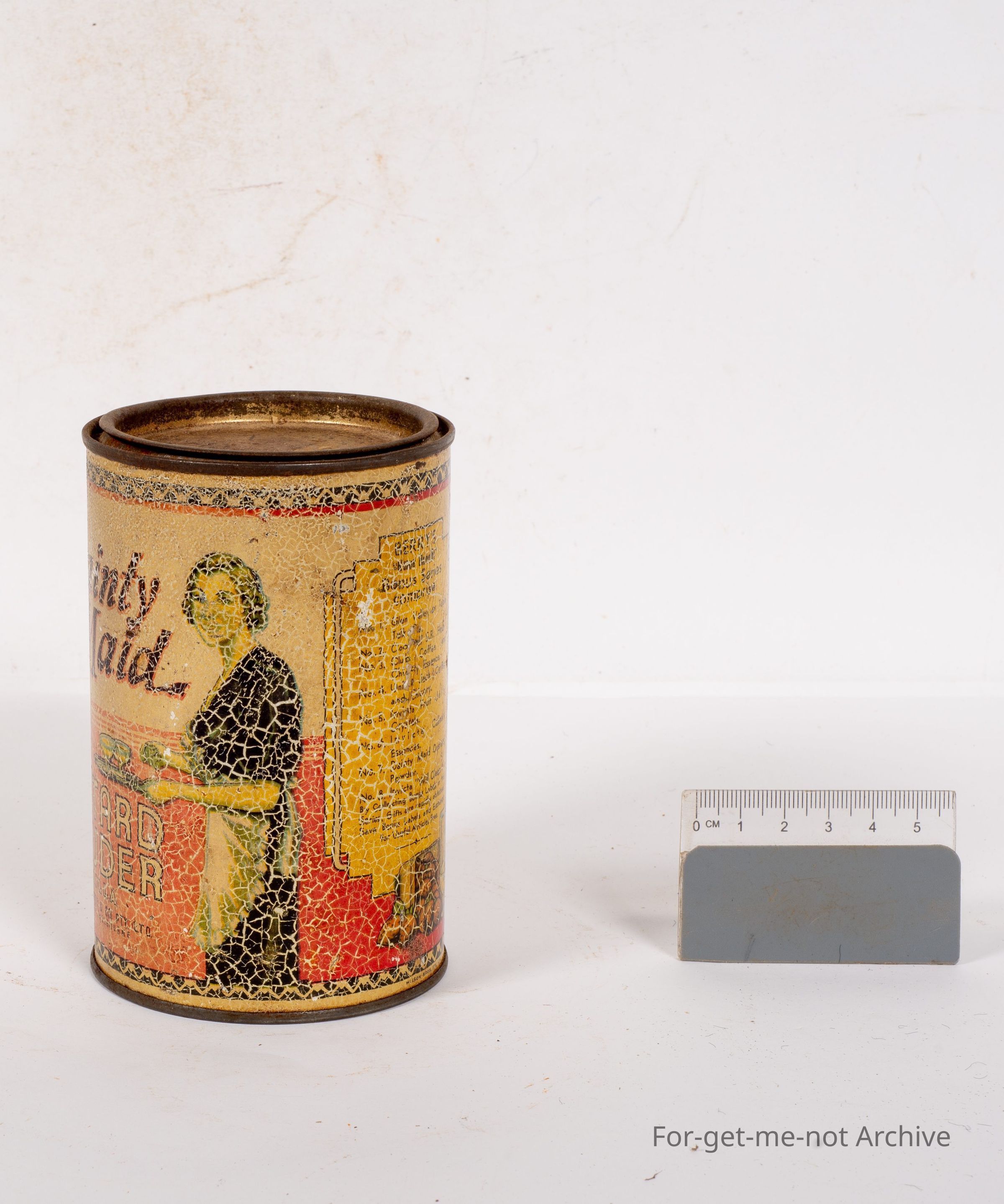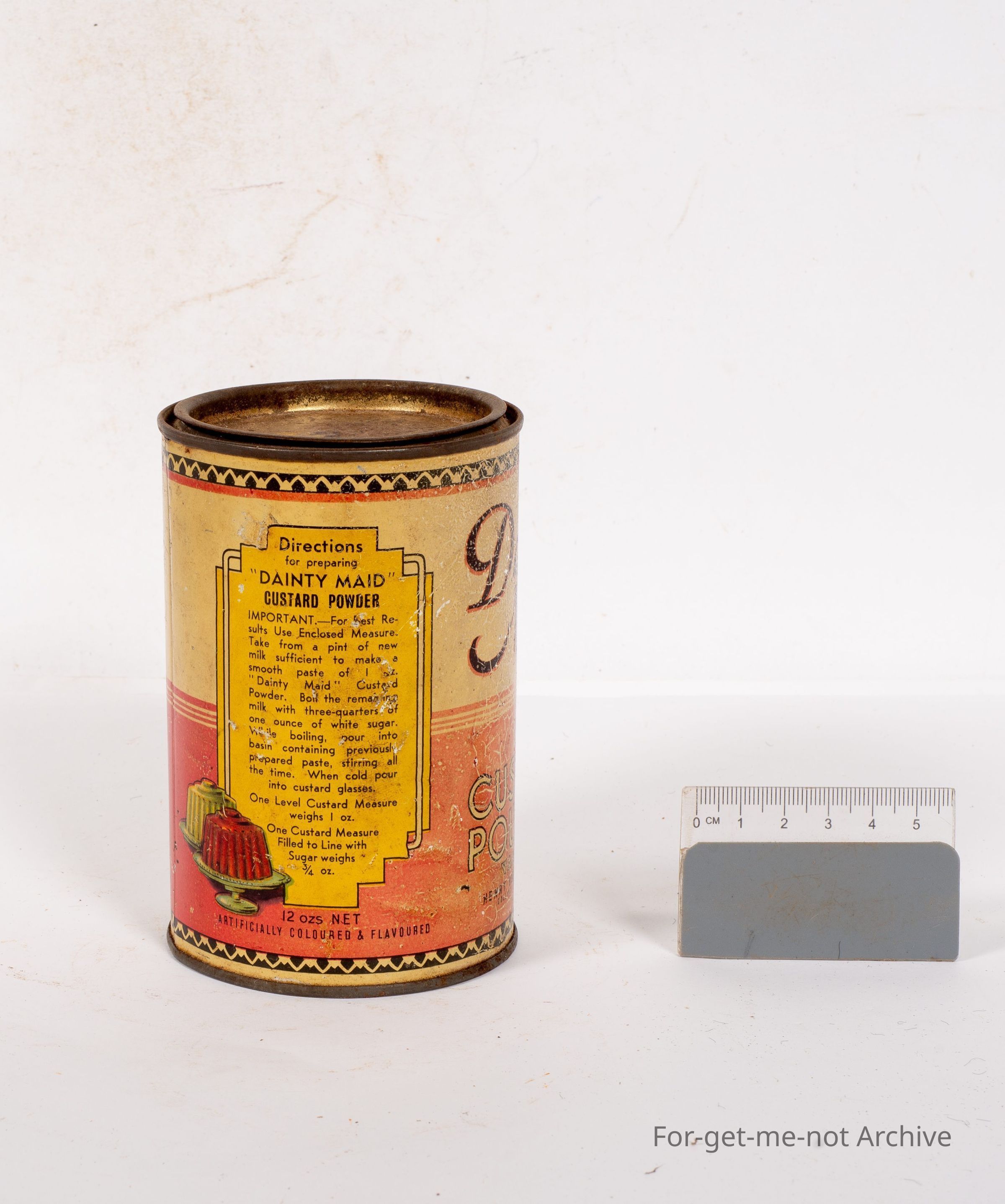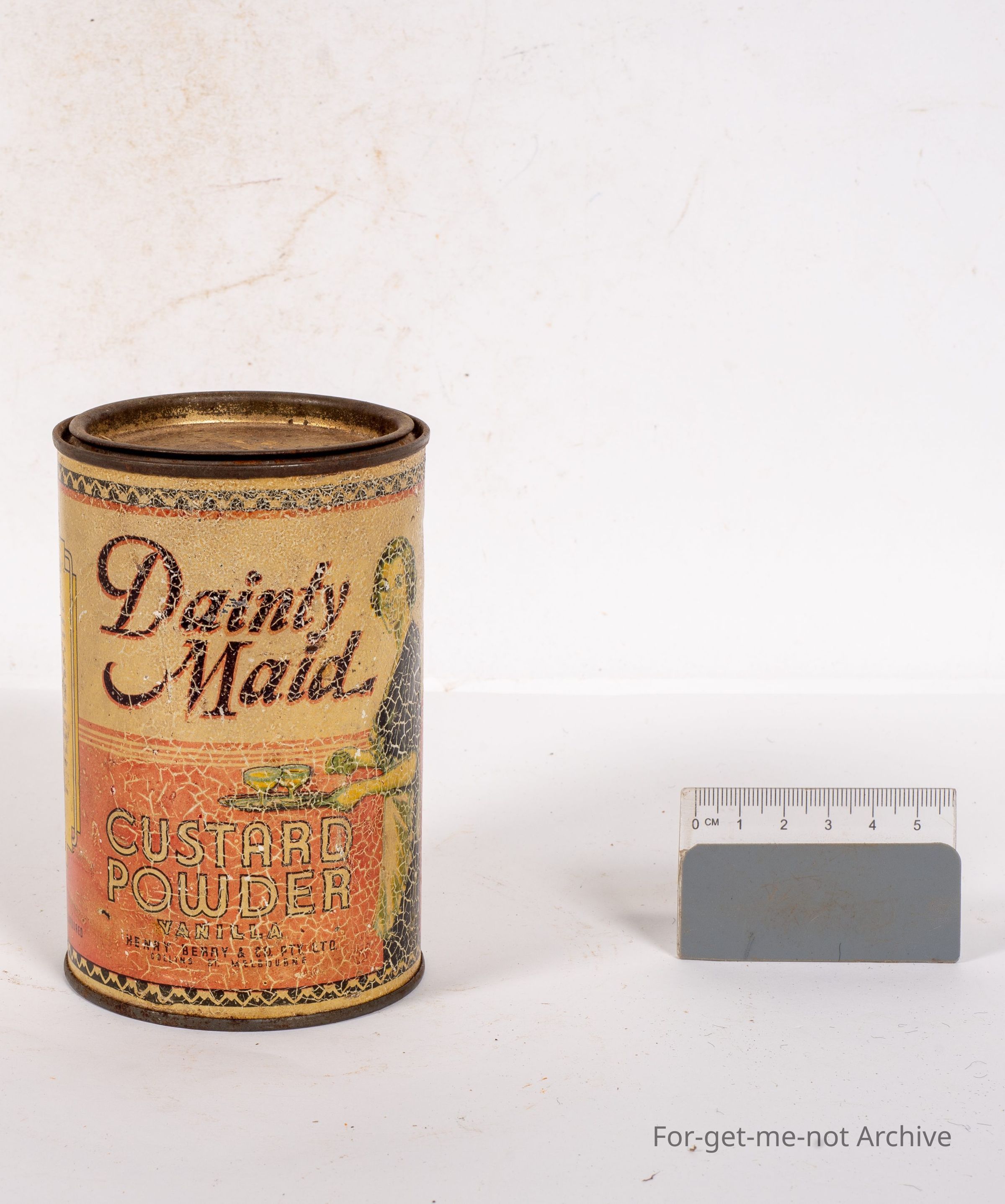 This is a tin of Dainty Maid -Custard powder. Vanilla flavour. This is produced by Henry Berry and Co, Melbourne. The image, it has crazed of a lady with 3 small containers of custard, but it is a nice interesting Melbourne tinCollection