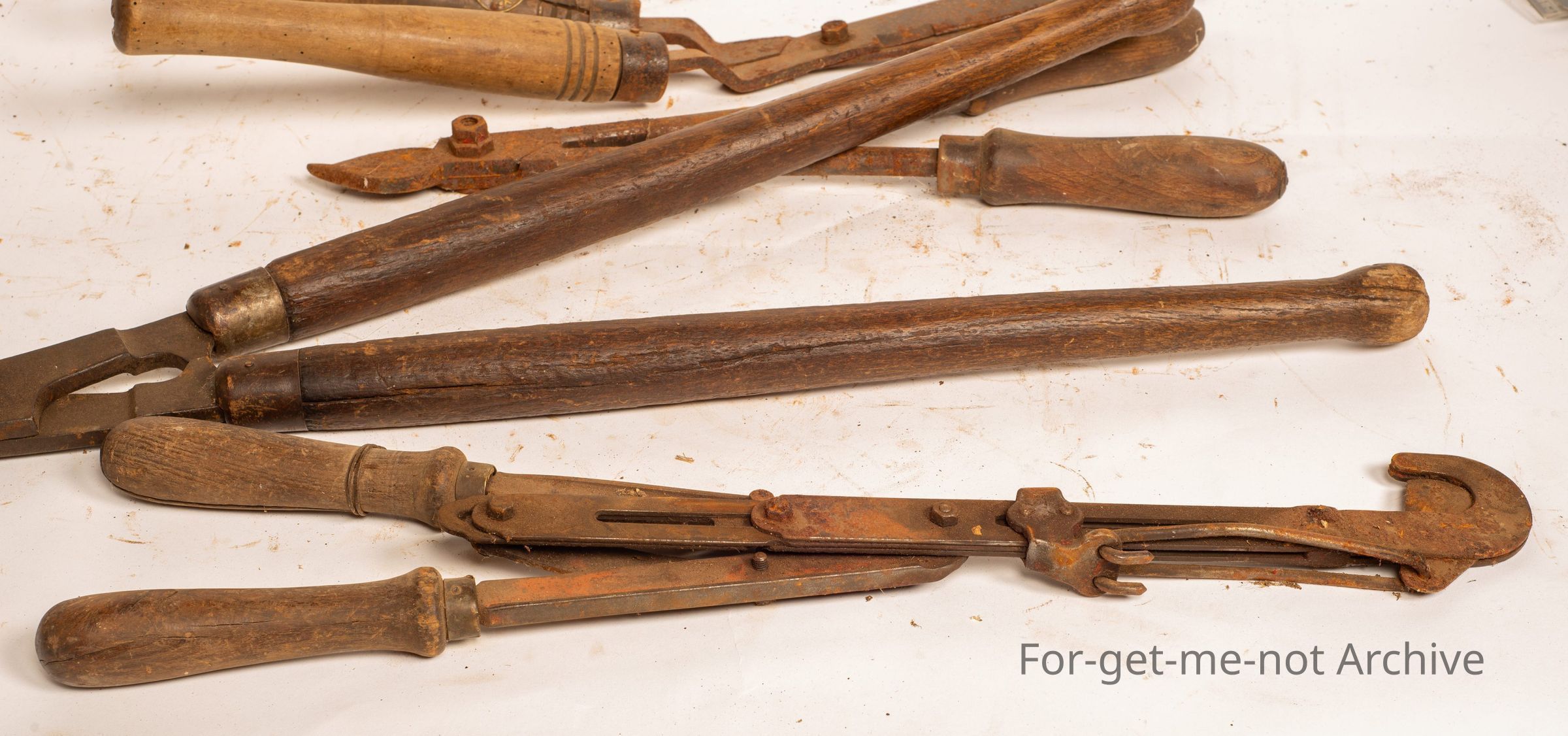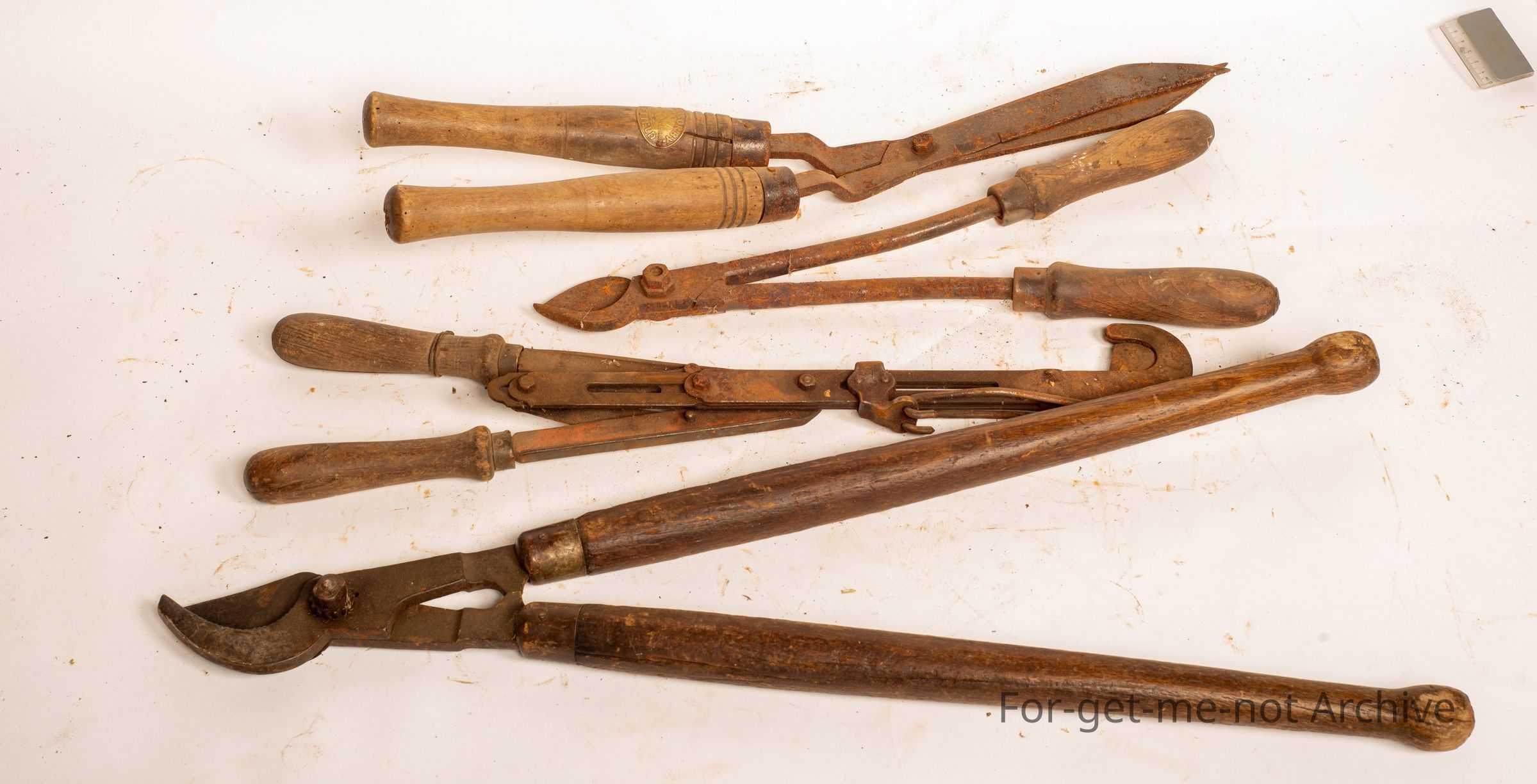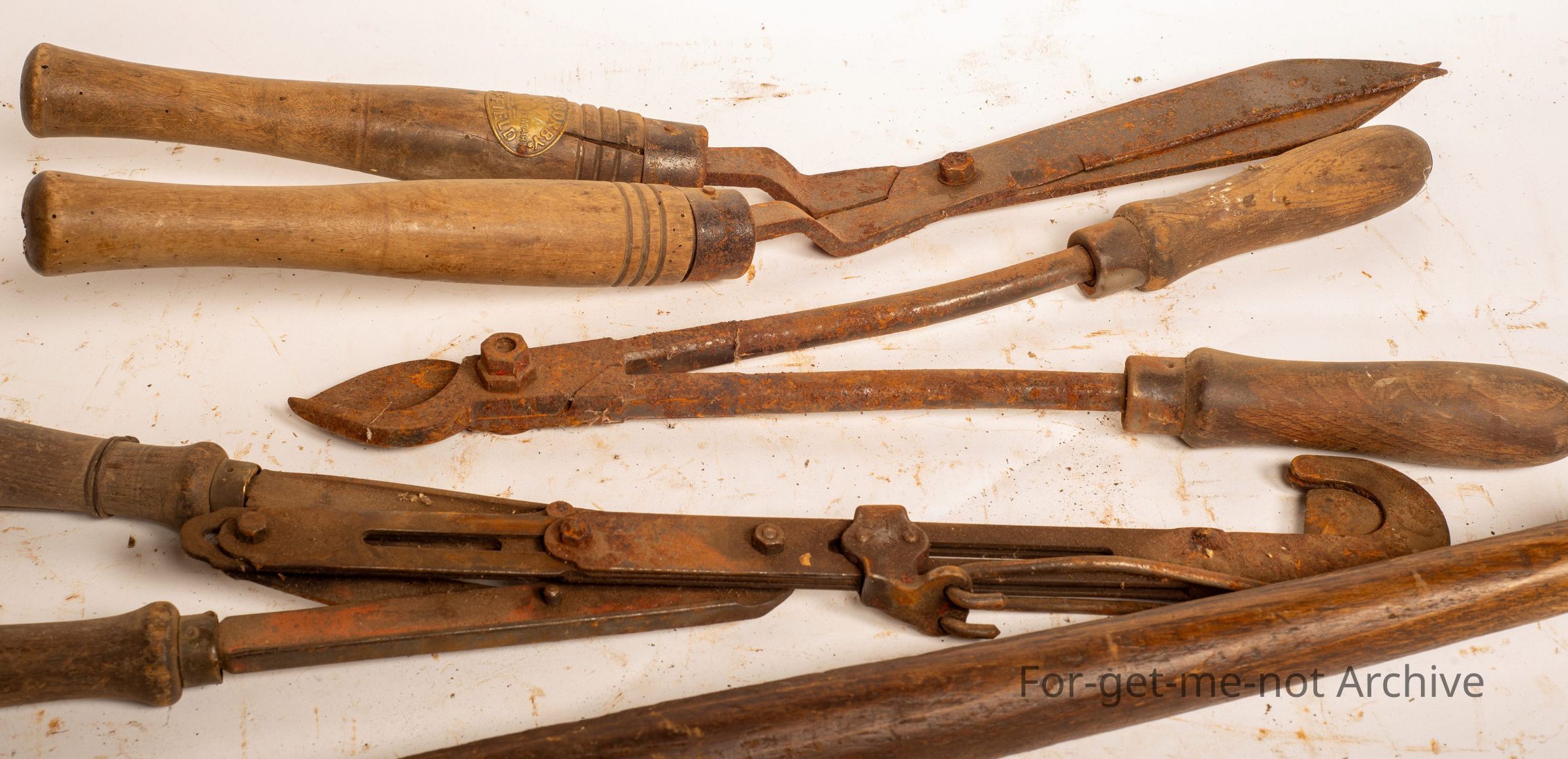 This is a group of handheld cutting tools from garden shears, pruning shears, horn cutting, shears. All wooden handled, all hand operated, group of 4,