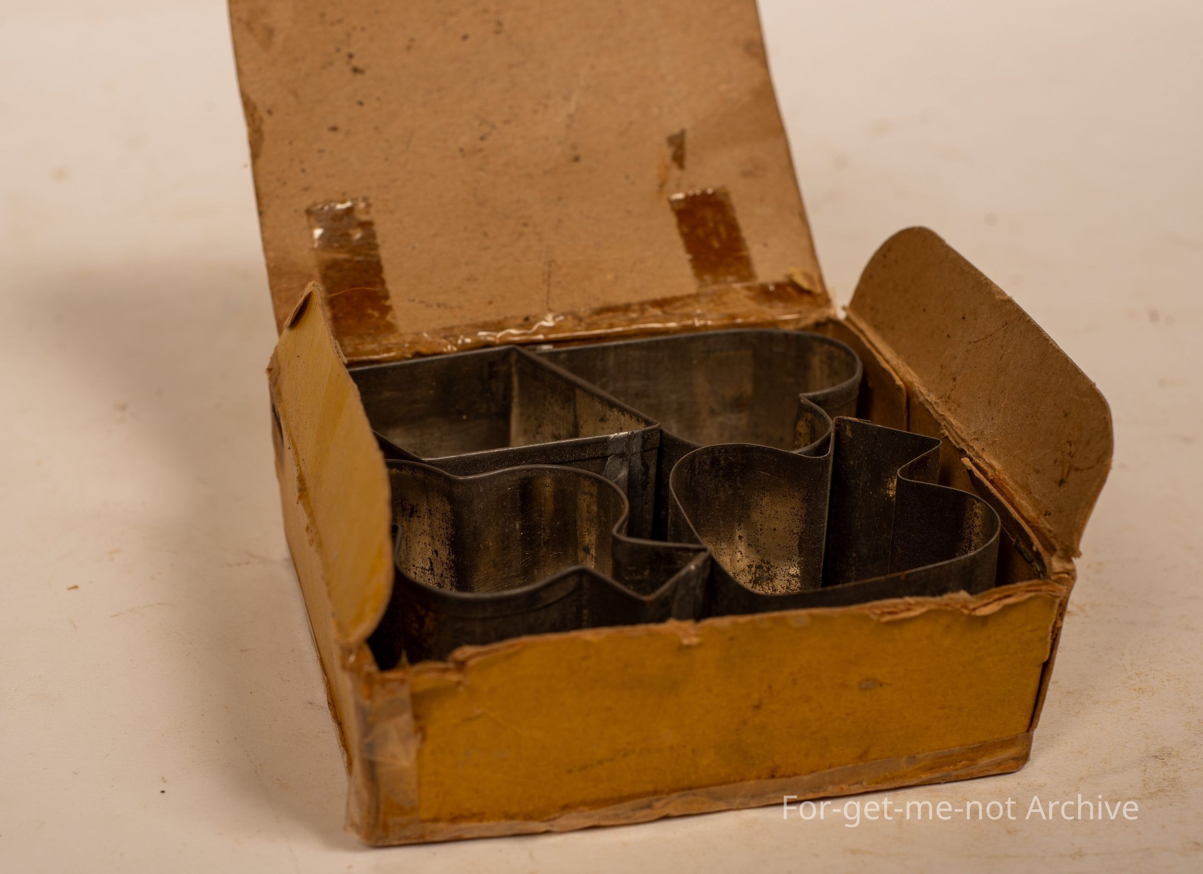 Is a cardboard box of Willow Biscuit and Pastry Cutters with contents. Box is a bit worn.