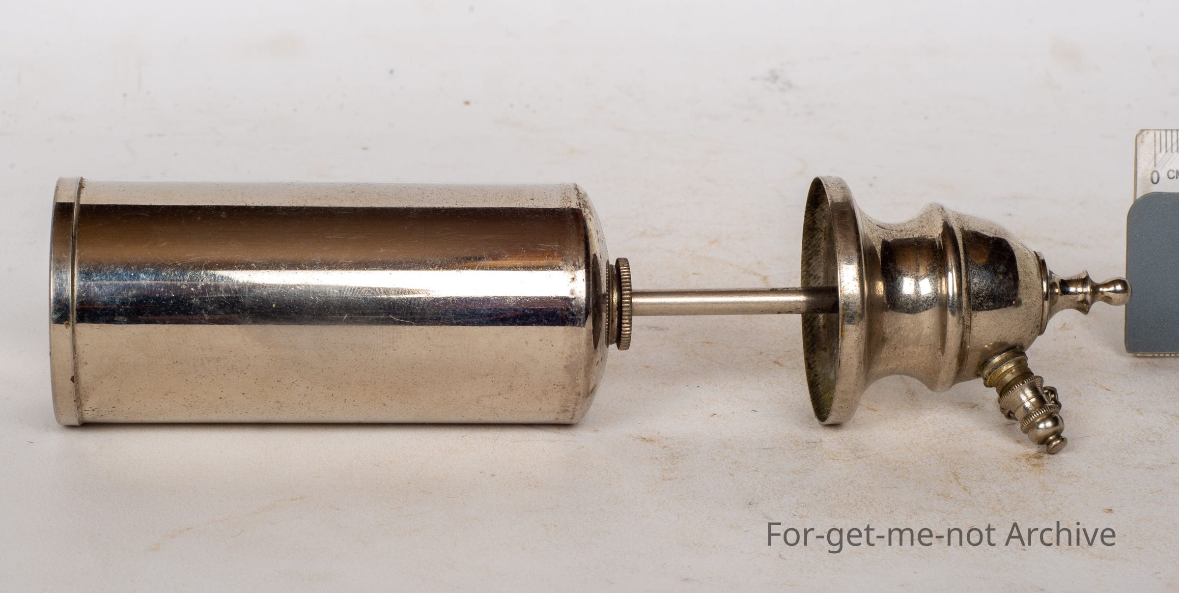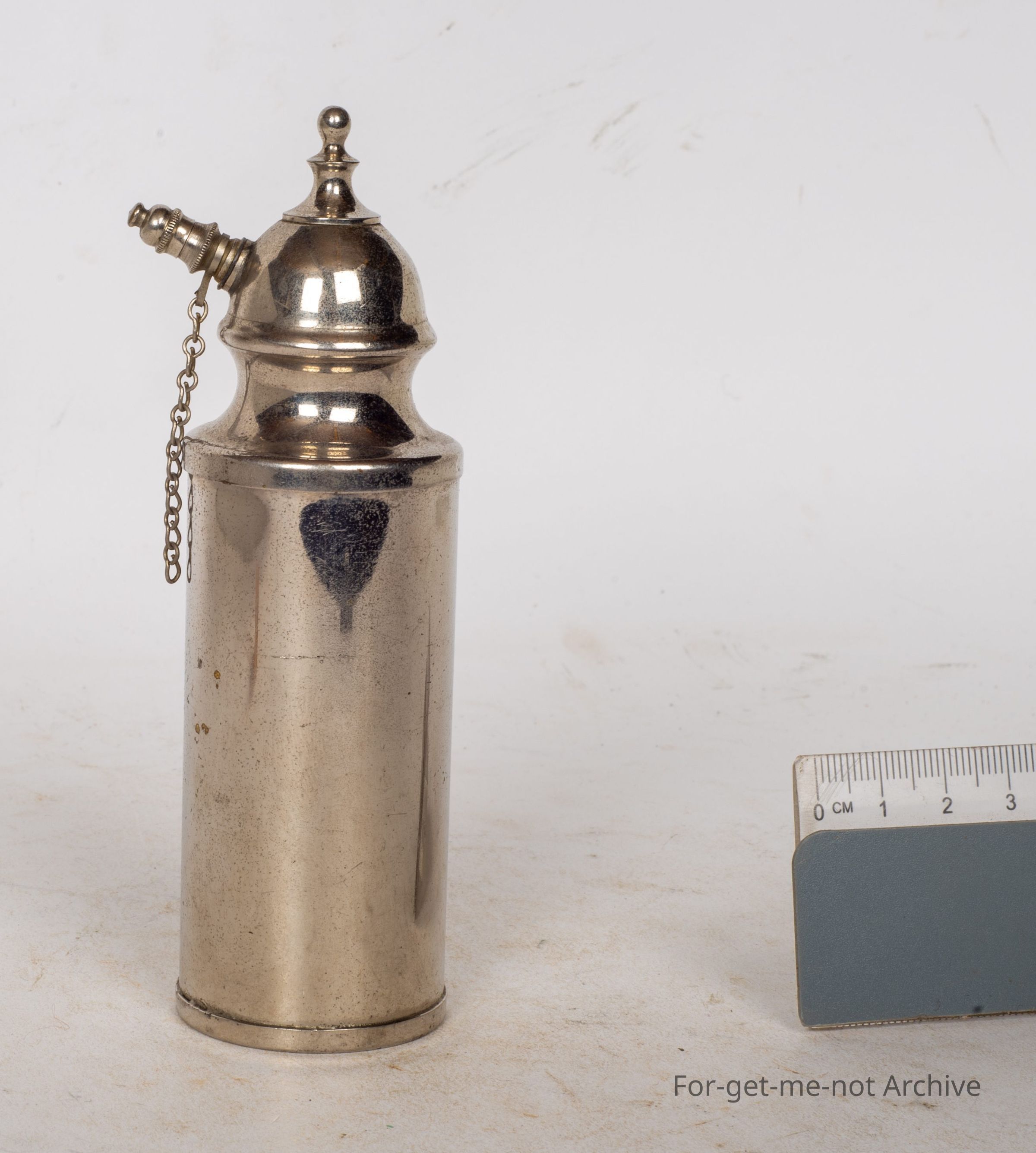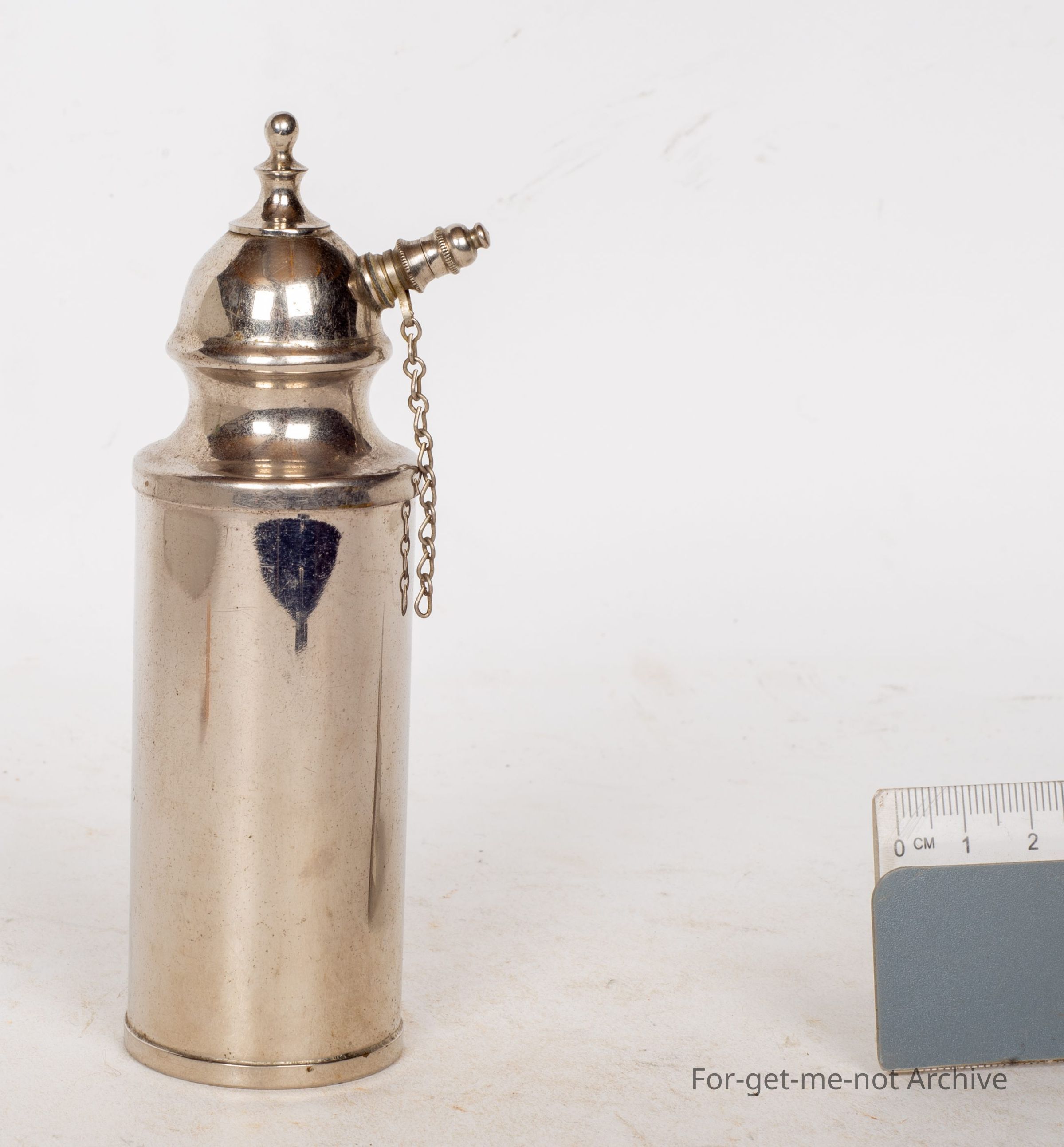 A cylinder with dome bottom, it usually means pressure, has a pump, a little chain to hold the cap on, very, very fine hole, Maybe perfume, hair spray