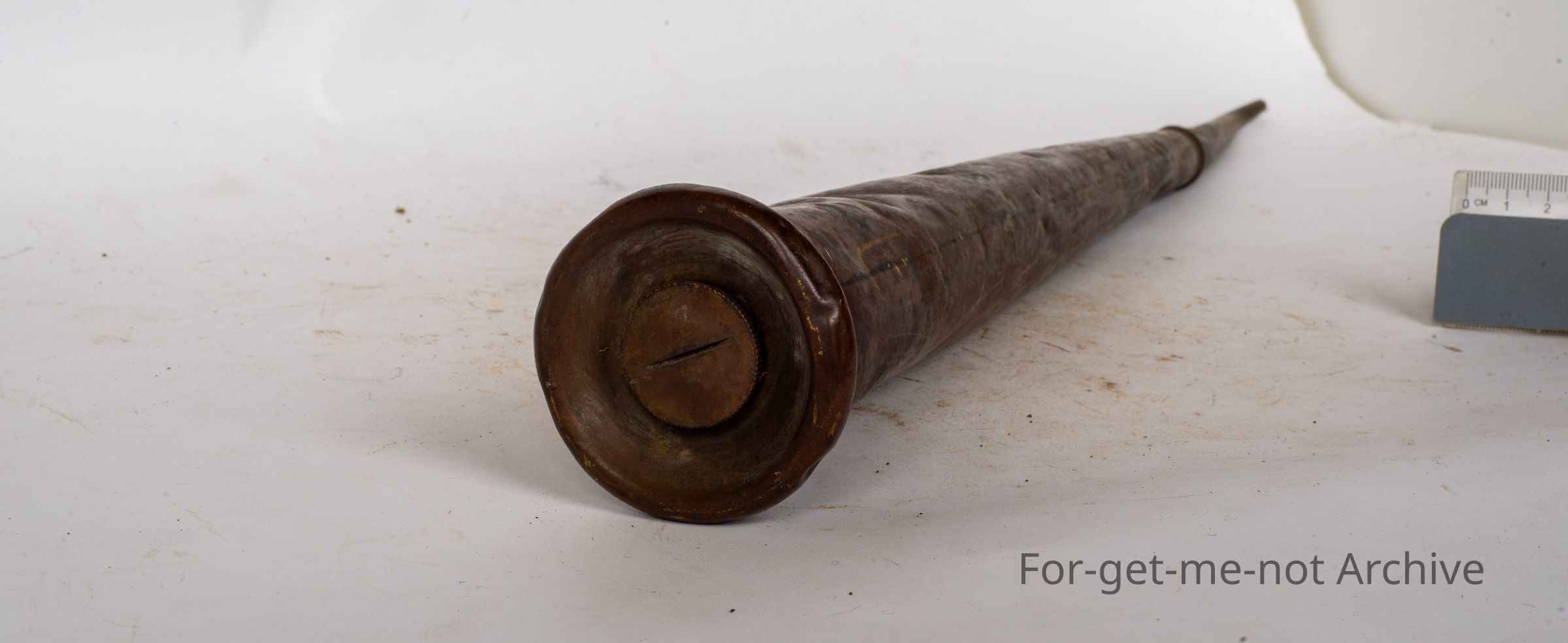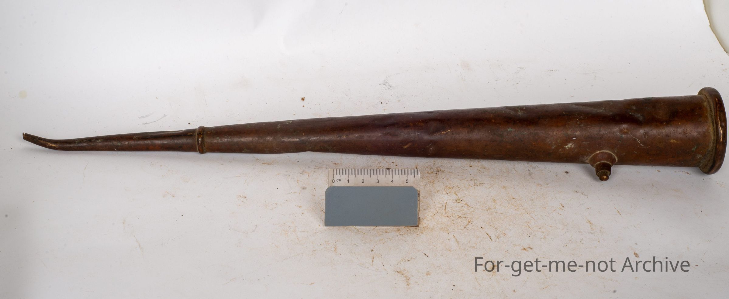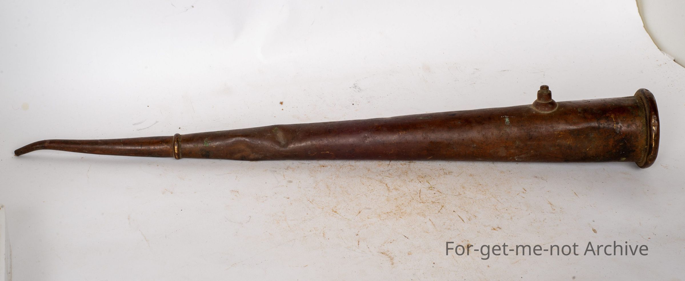 This is a very tall, cylindrical, brass oil can, pumper at the bottom, a long reach for the spout. It has a slight stamping of 32, believed to be associated with Early Railway.