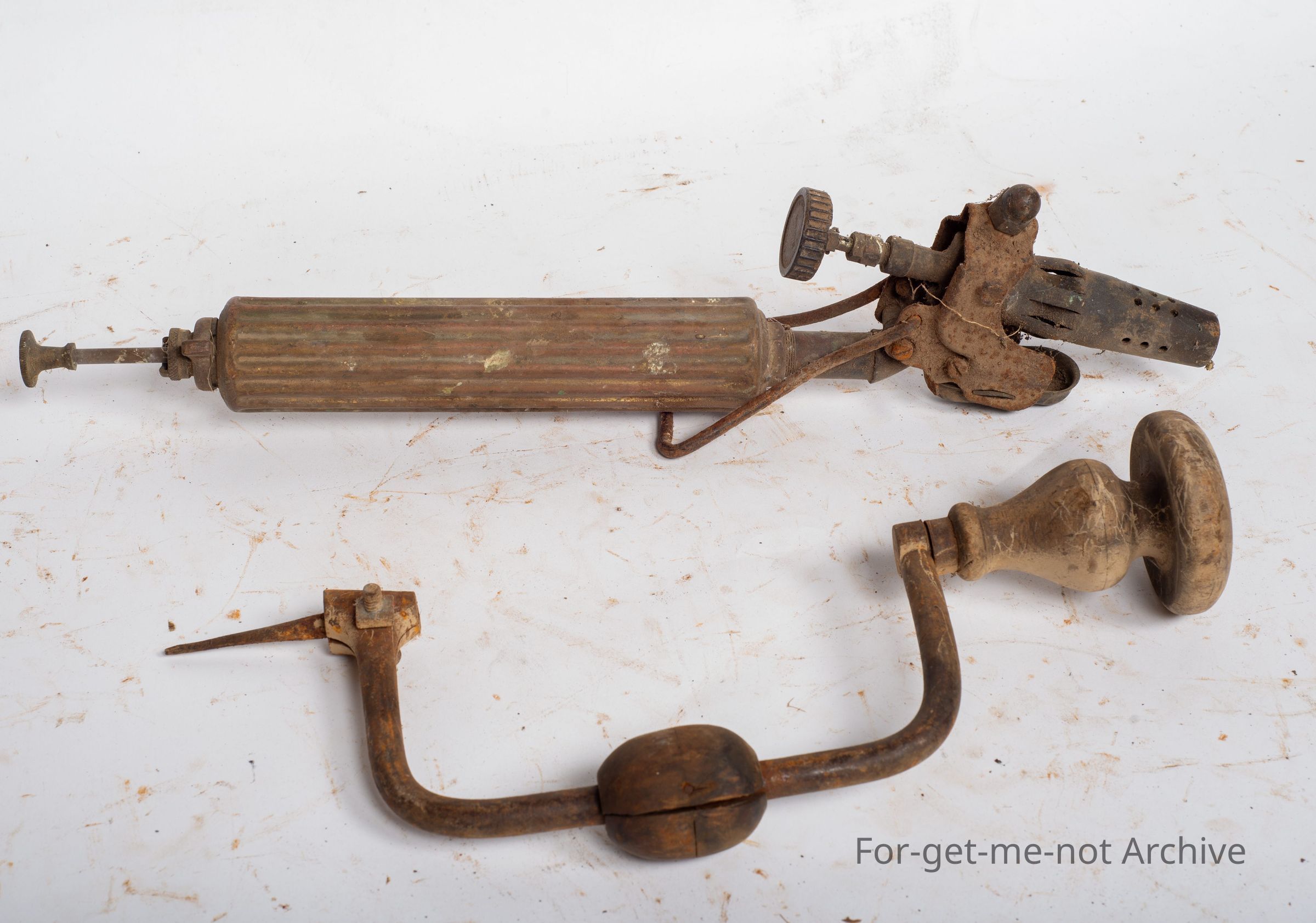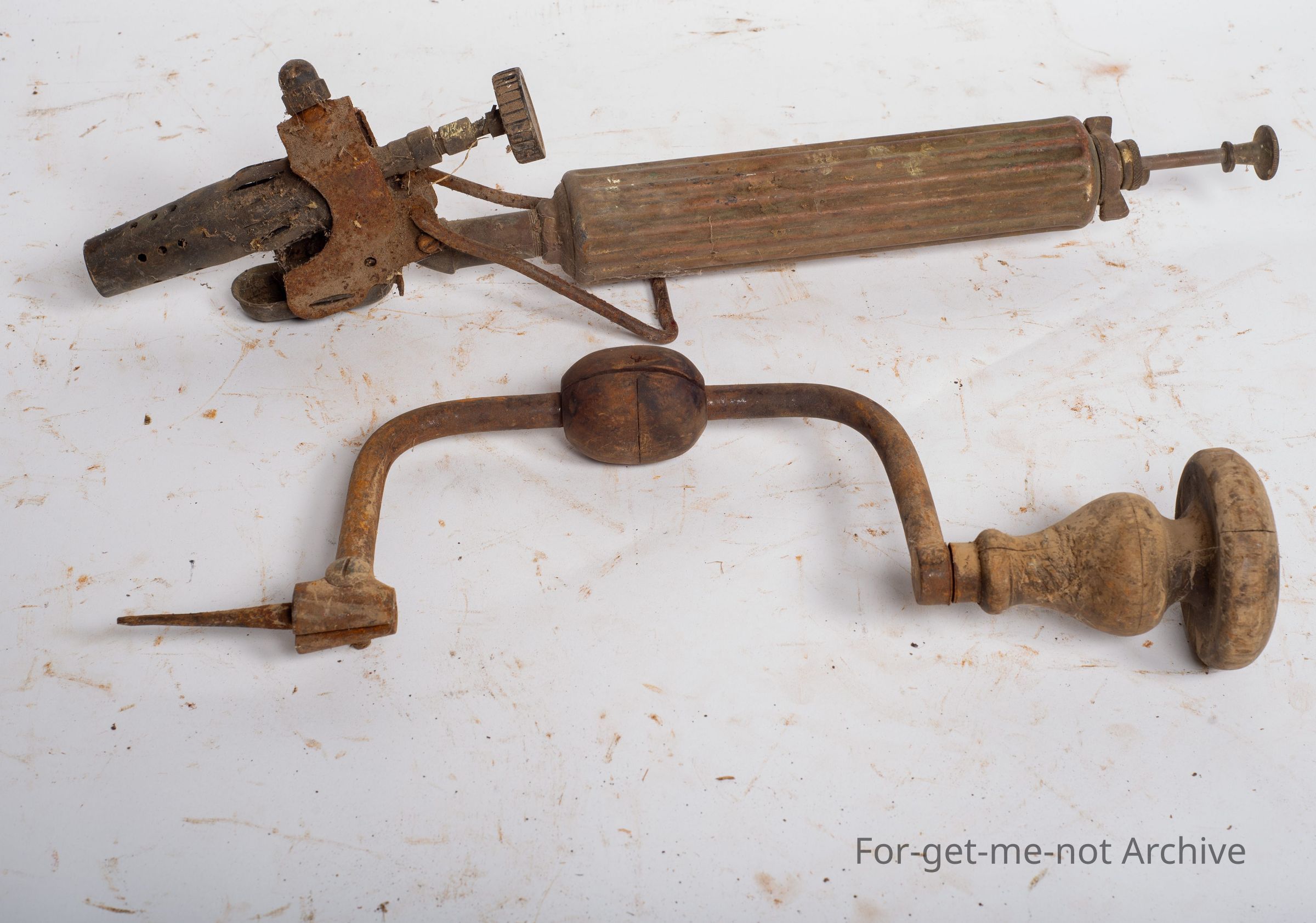 Rural tools. 1 is a cylindrical soldering iron, that stands on a stand. The other one is a very common in garden early brace and bit.