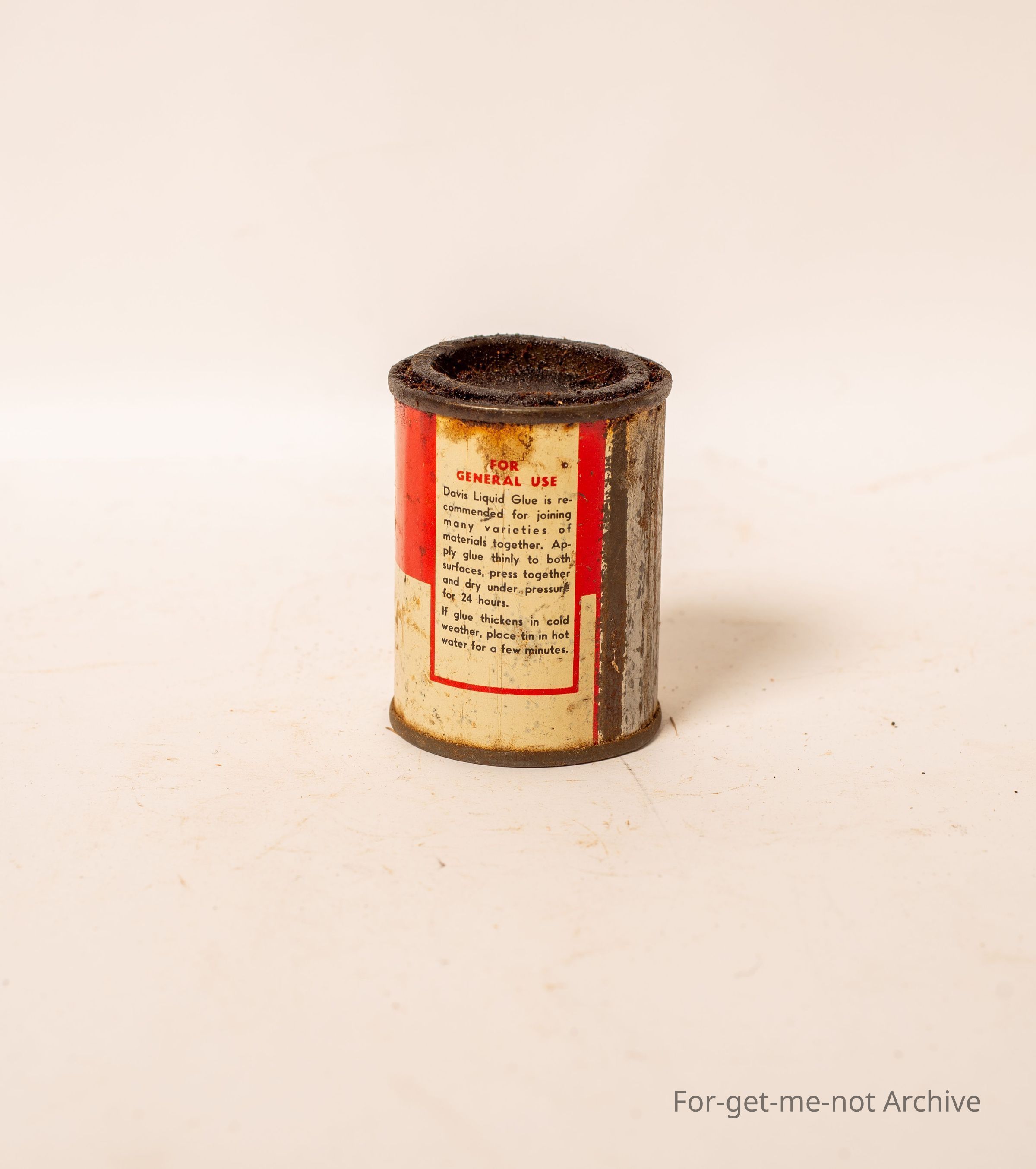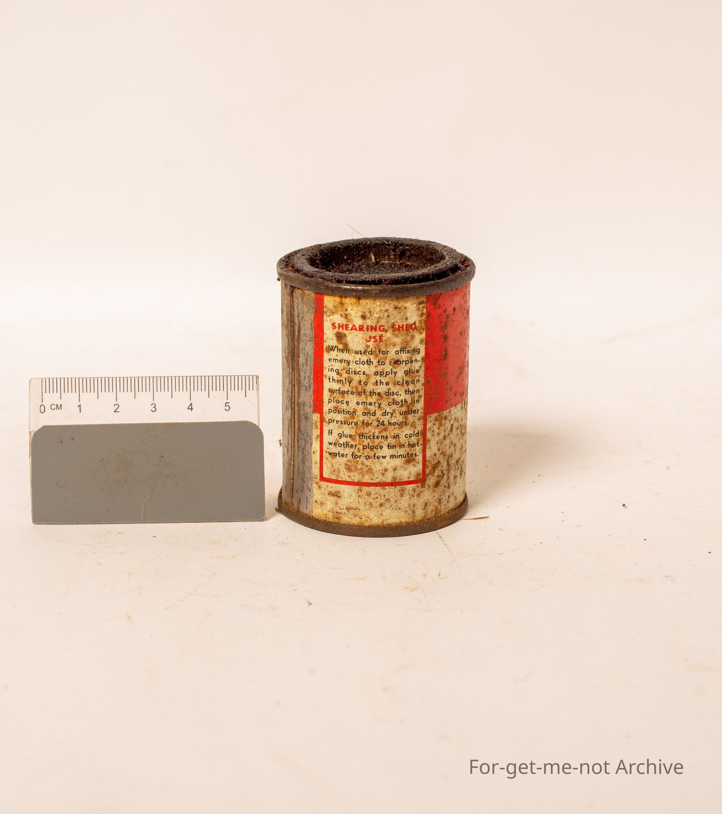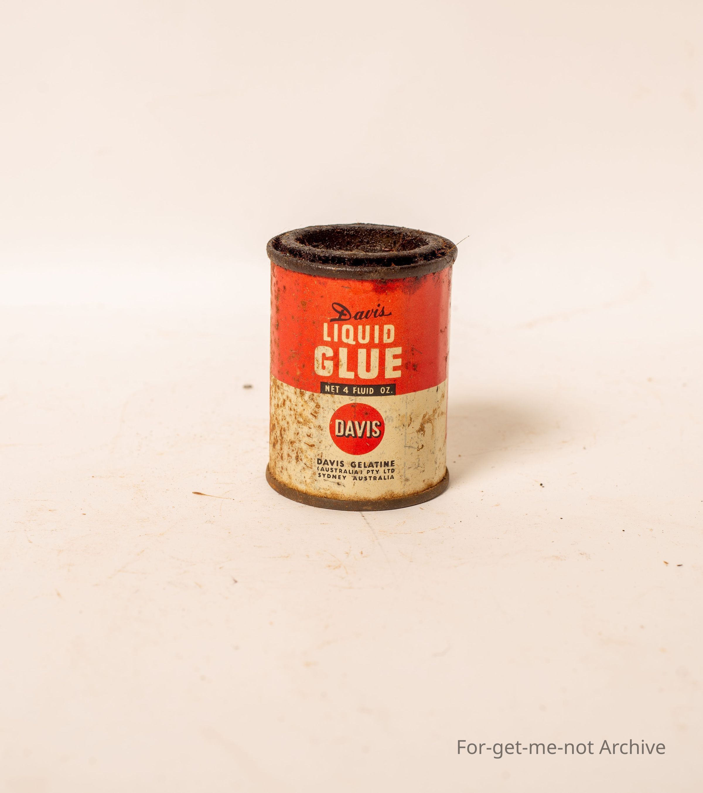 A small tin of Davis liquid glue, 4 fluid ounces for use in the shearing shed for putting abrasive discs on the for the shearers.