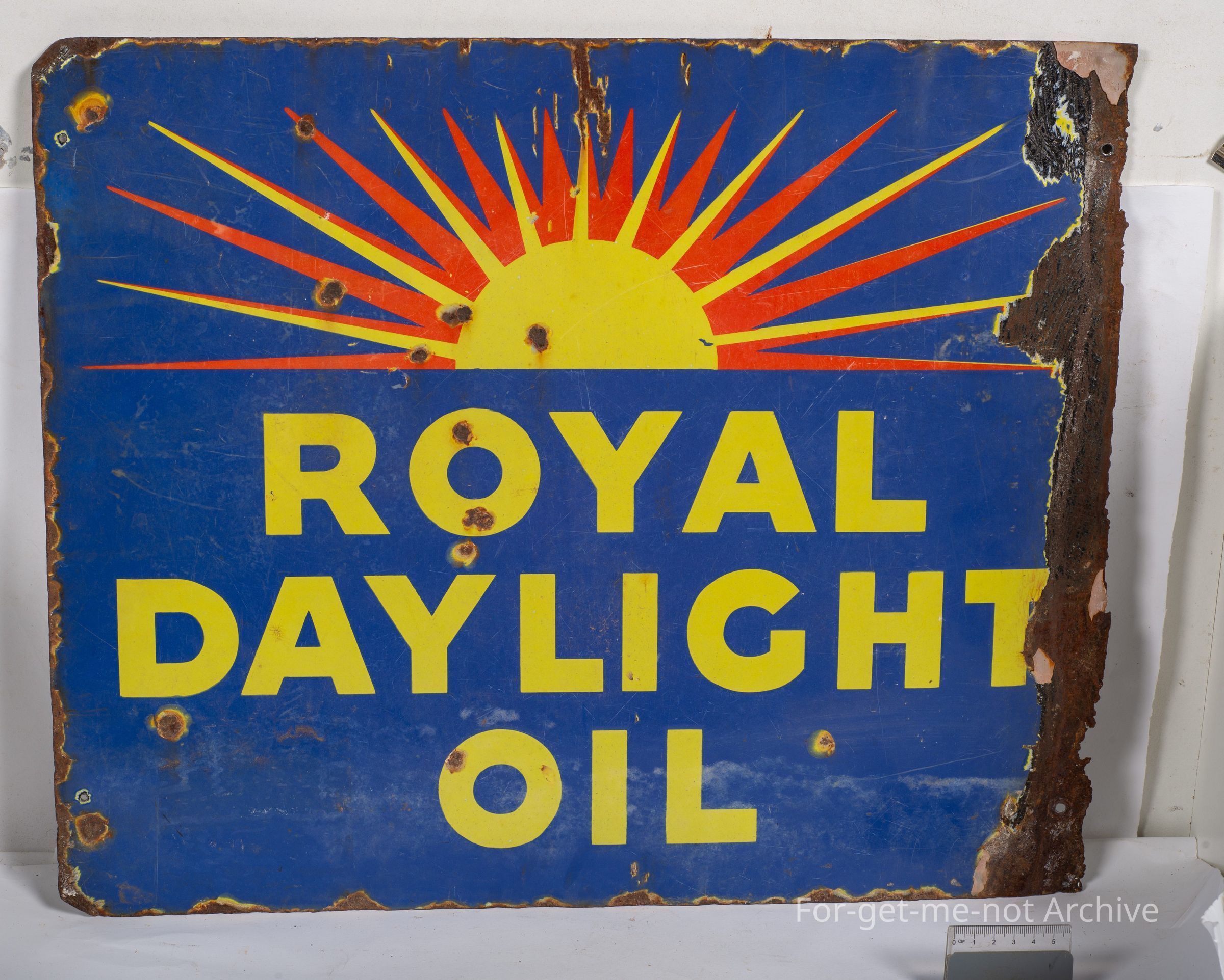 Sangeet Collection, This one is double sided. The 90 degree bend is missing. Bit of damage one side from shotgun pallets. Advertising royal daylight oil with a beautiful sunrise image in the background.Collection