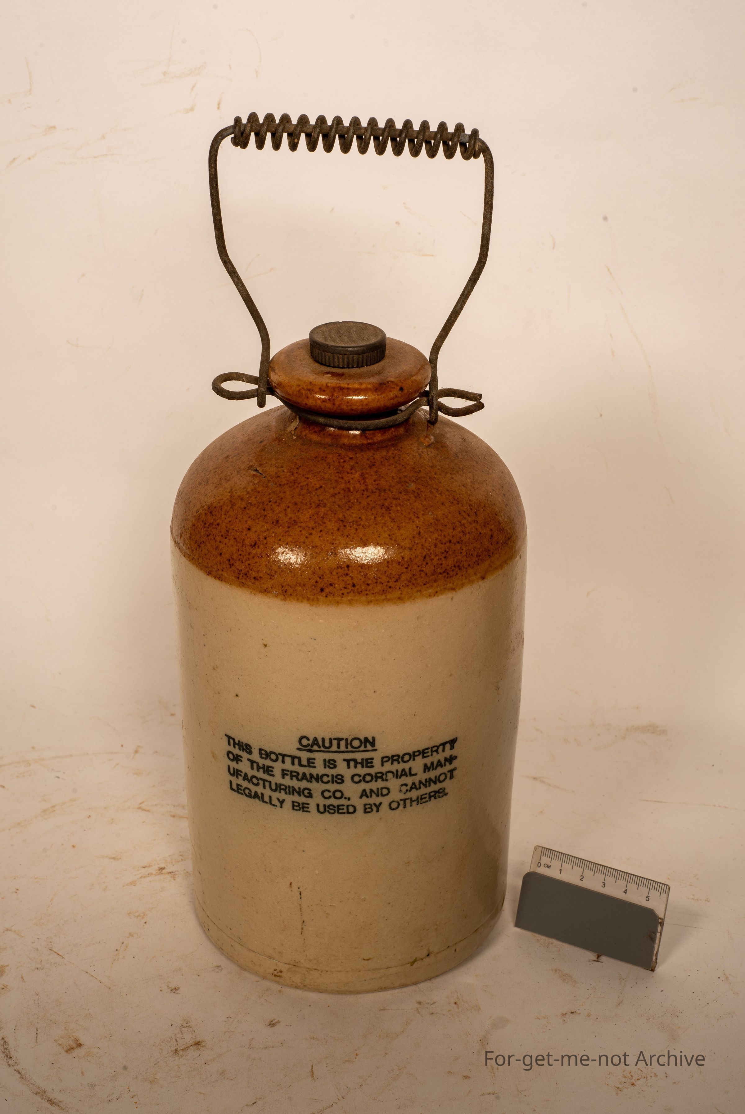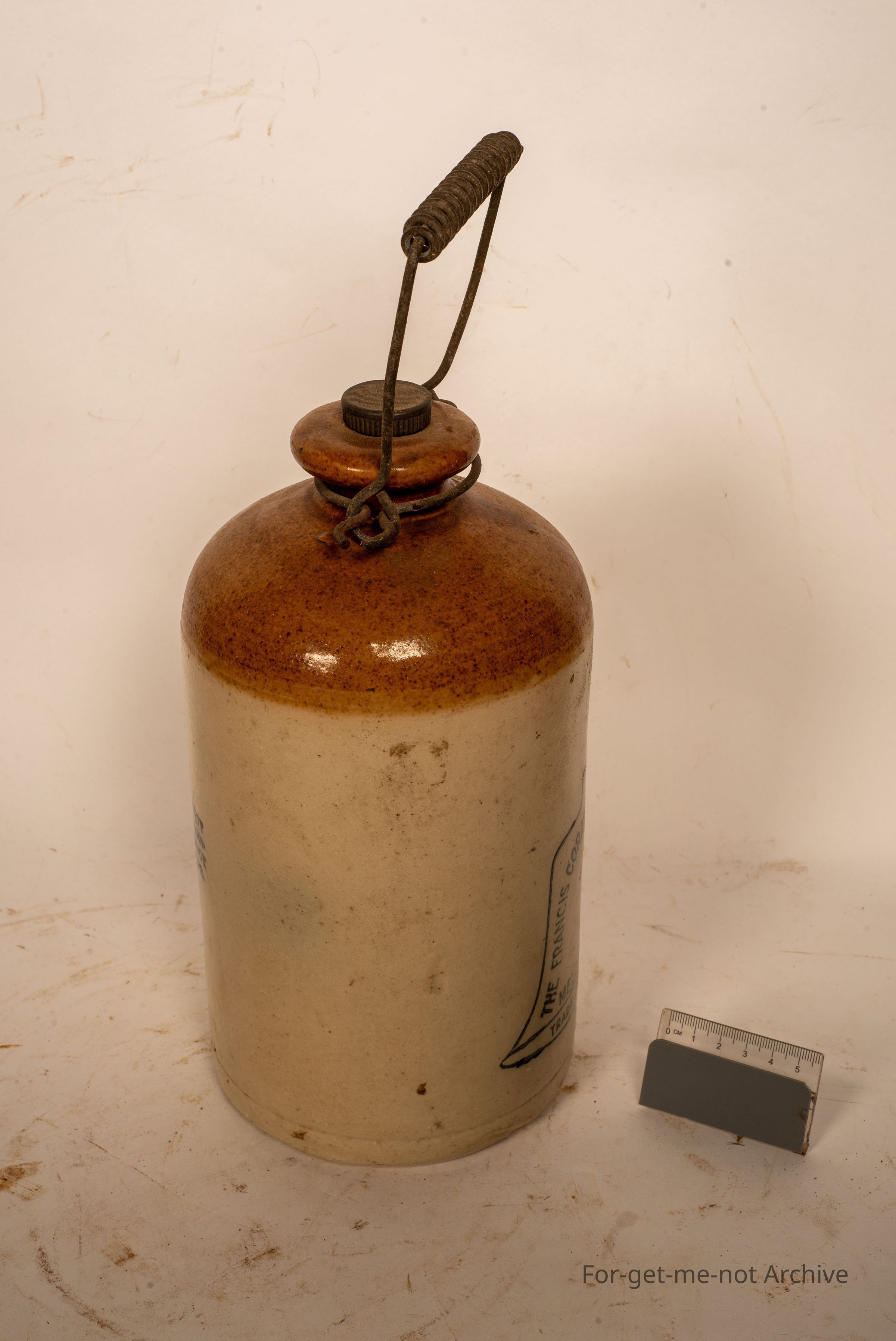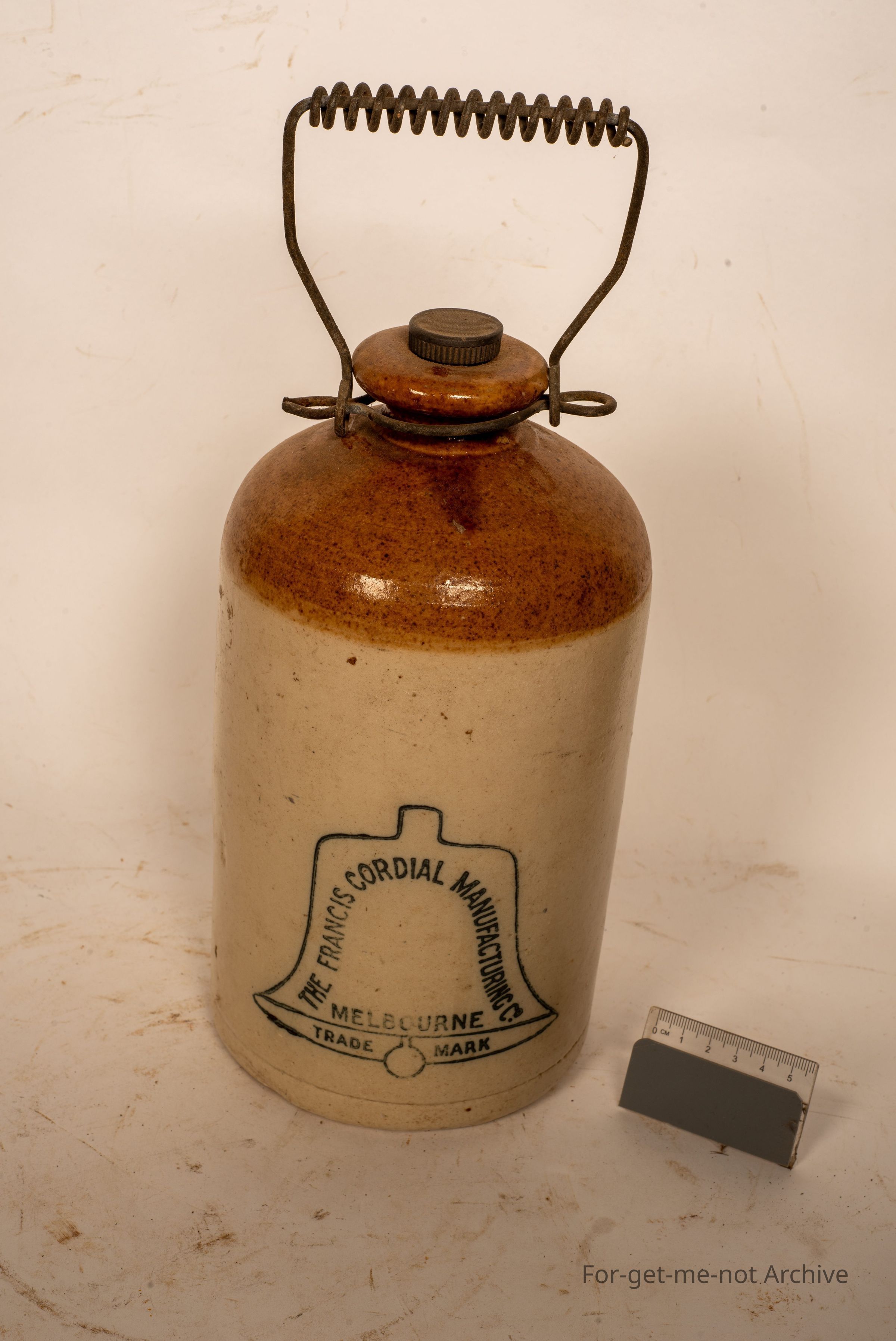 This is a small stoneware jar, wire handle, has a screw in plug lid, ink stamped in the shape of a bell that says the Francis Cordial Manufacturing Melbourne trademark. In flawless condition, nice clear ink stampCollection