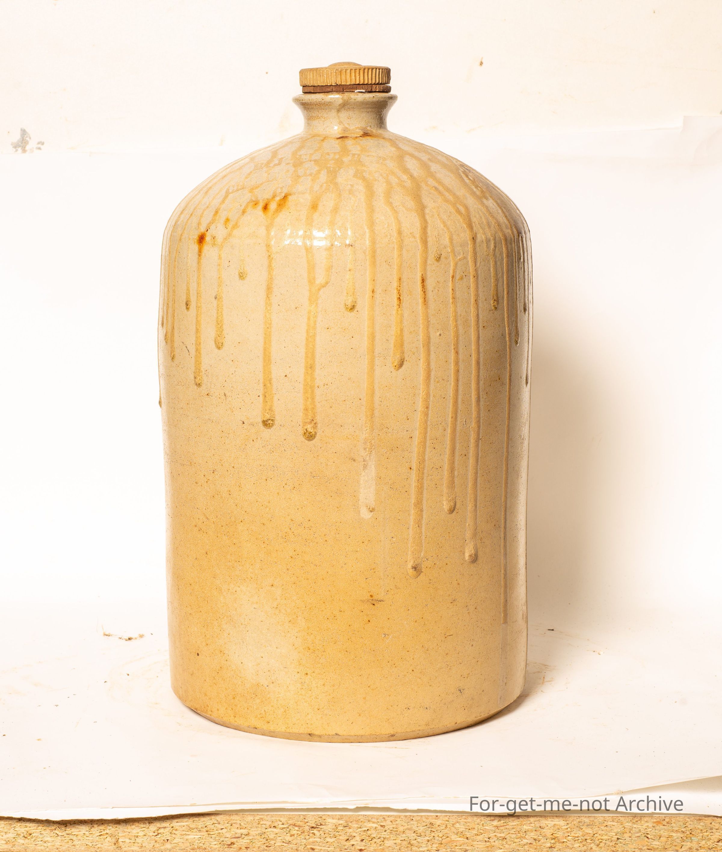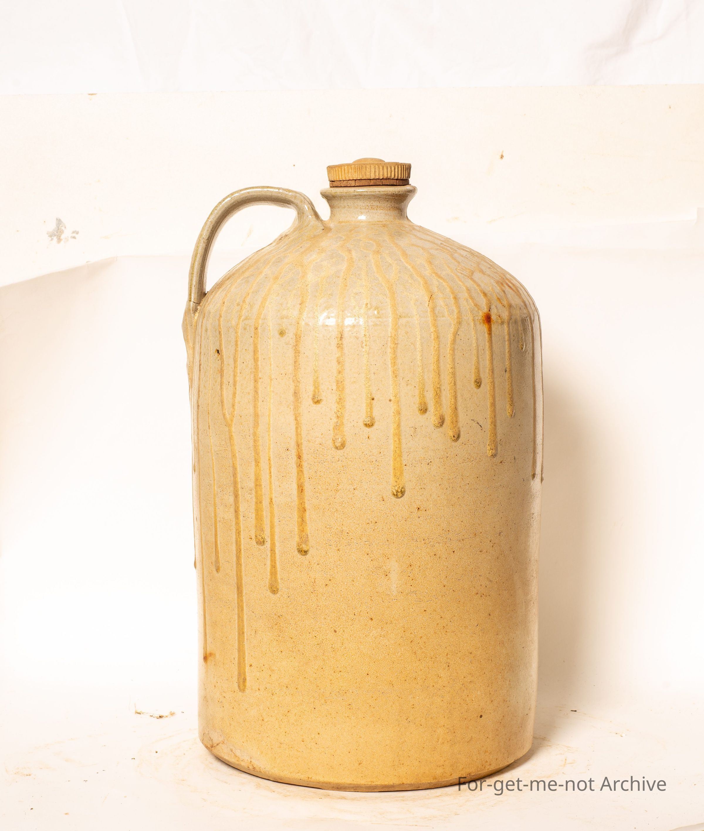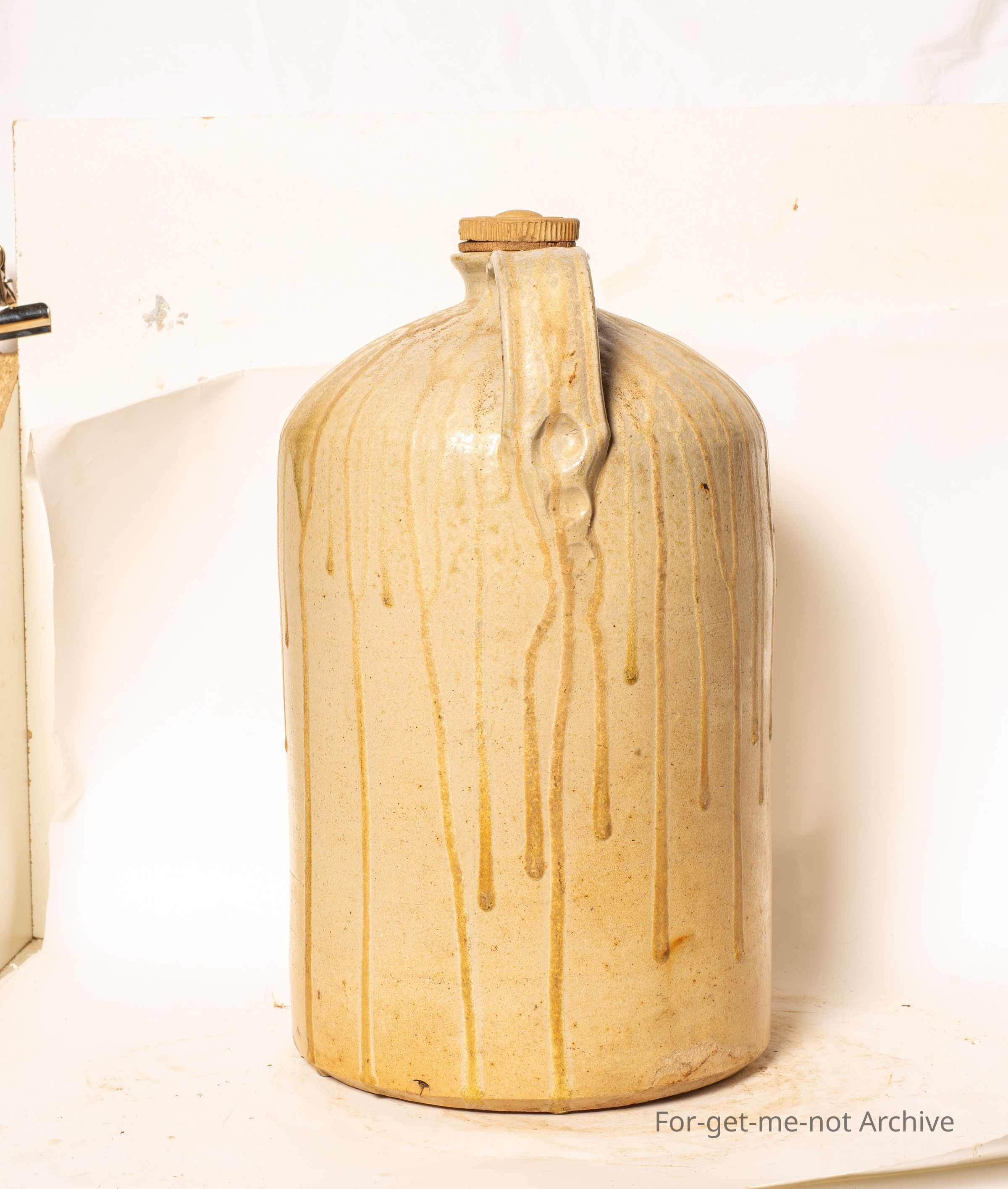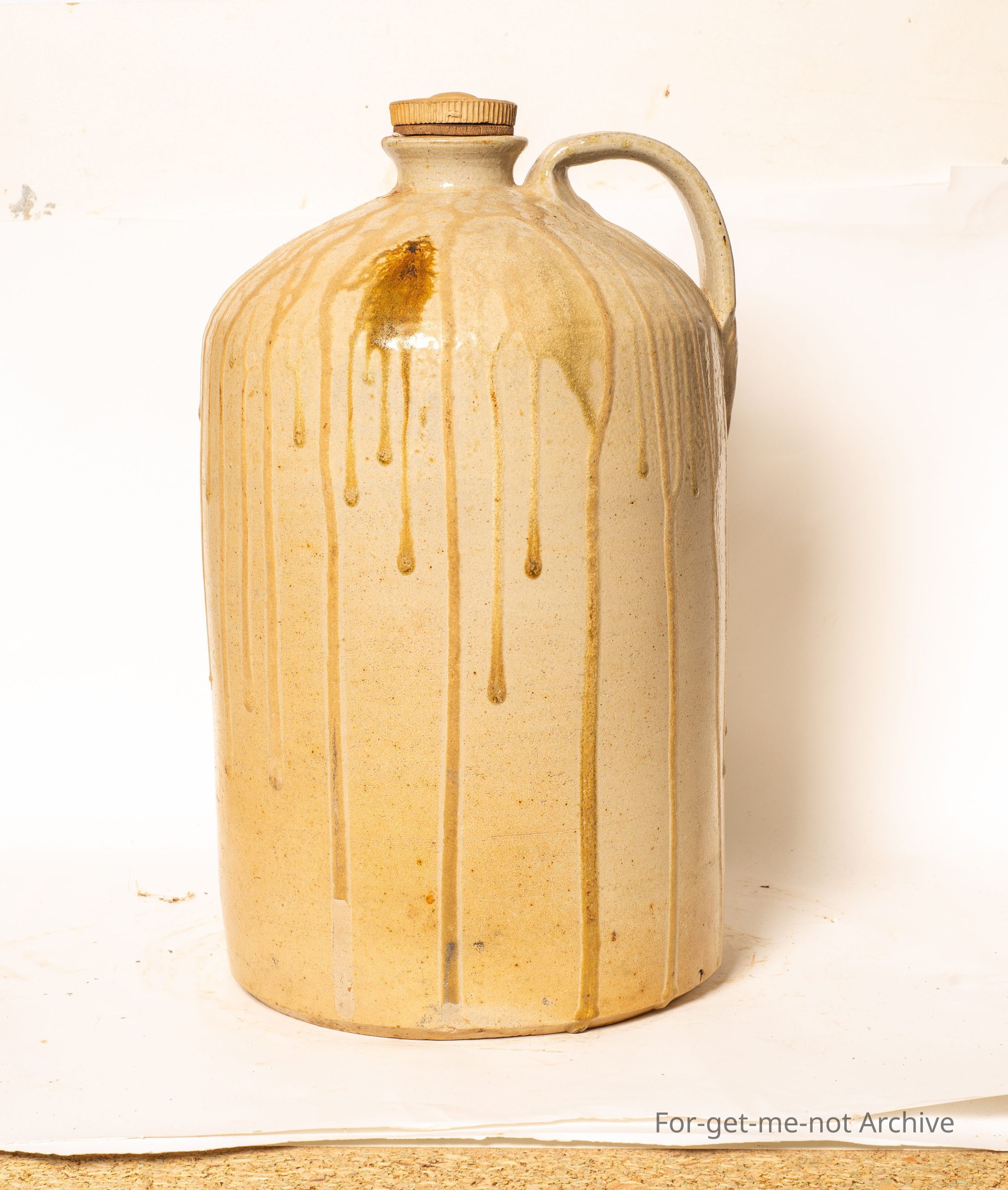 This is a large demijohn handle intact, stamping of Fletcher's, Geelong, quite possibly an acid jar. The feature of this is the runs of glaze that come from the shoulder all the way around the body. The complete neck, nice handle, quite an interesting piece. This would almost certainly have been made by Bendigo Pottery.Collection