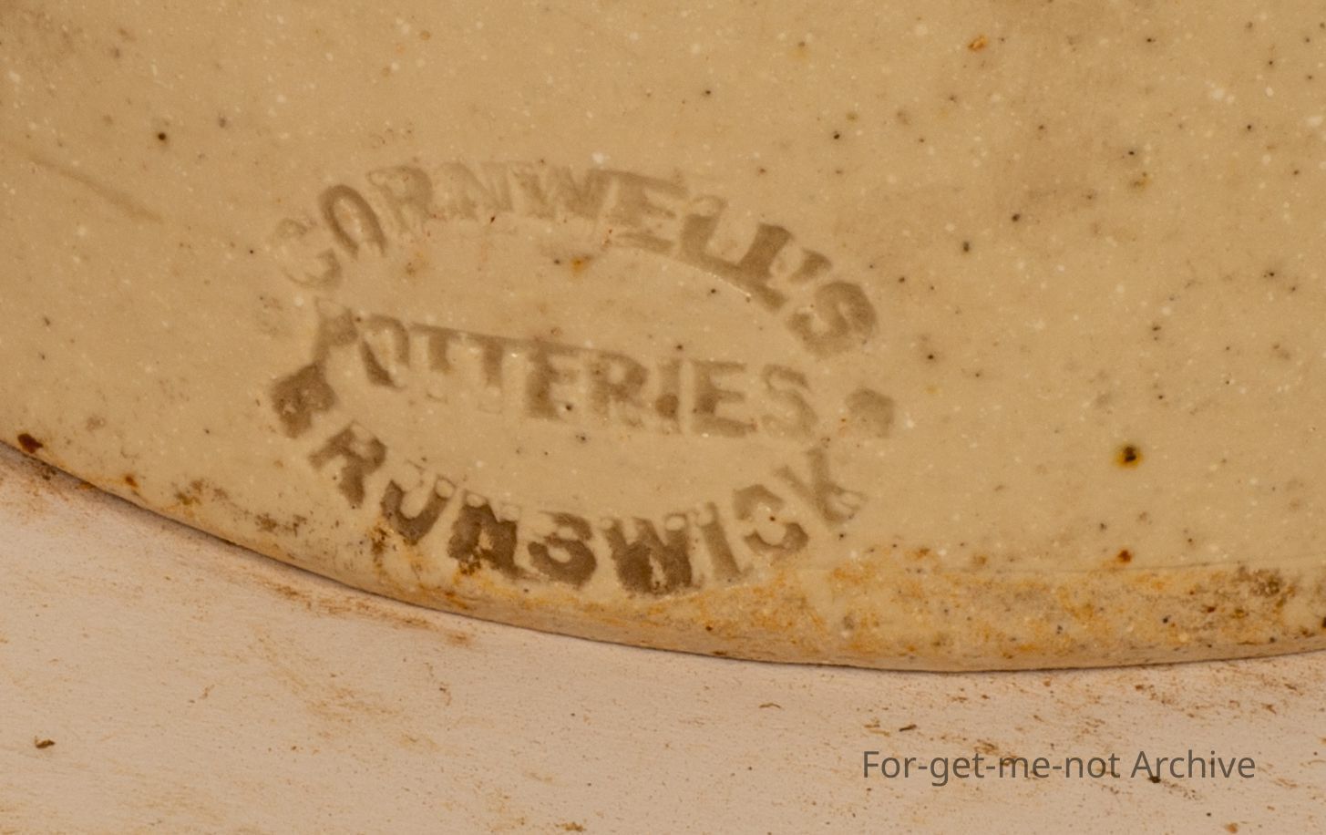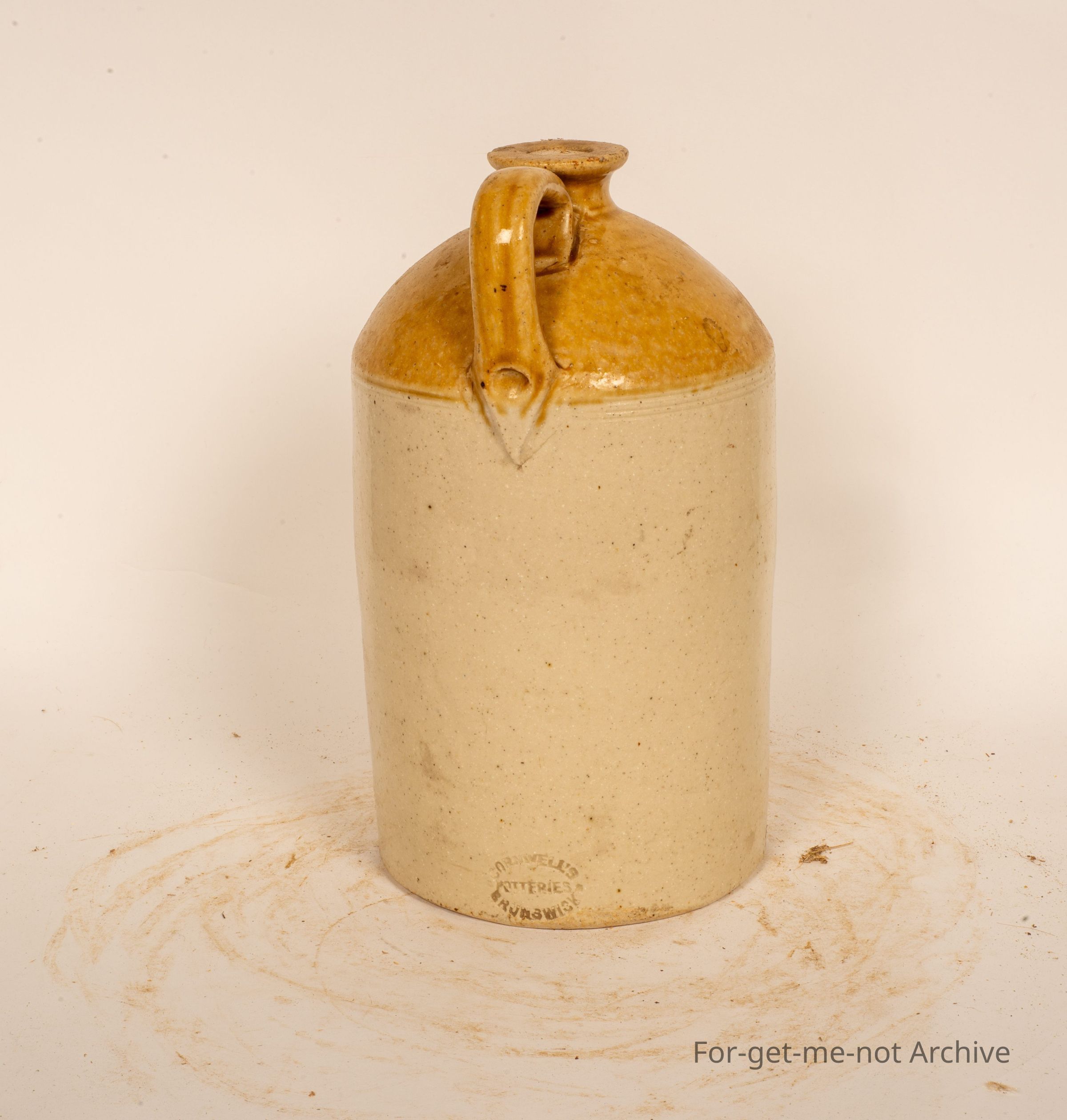 Still stoneware pottery. This one is small demijohn, perhaps a 1 gallon capacity, nice handle, lip intact. This is well stamped Cornwall's Brunswick Pottery. Lovely condition.