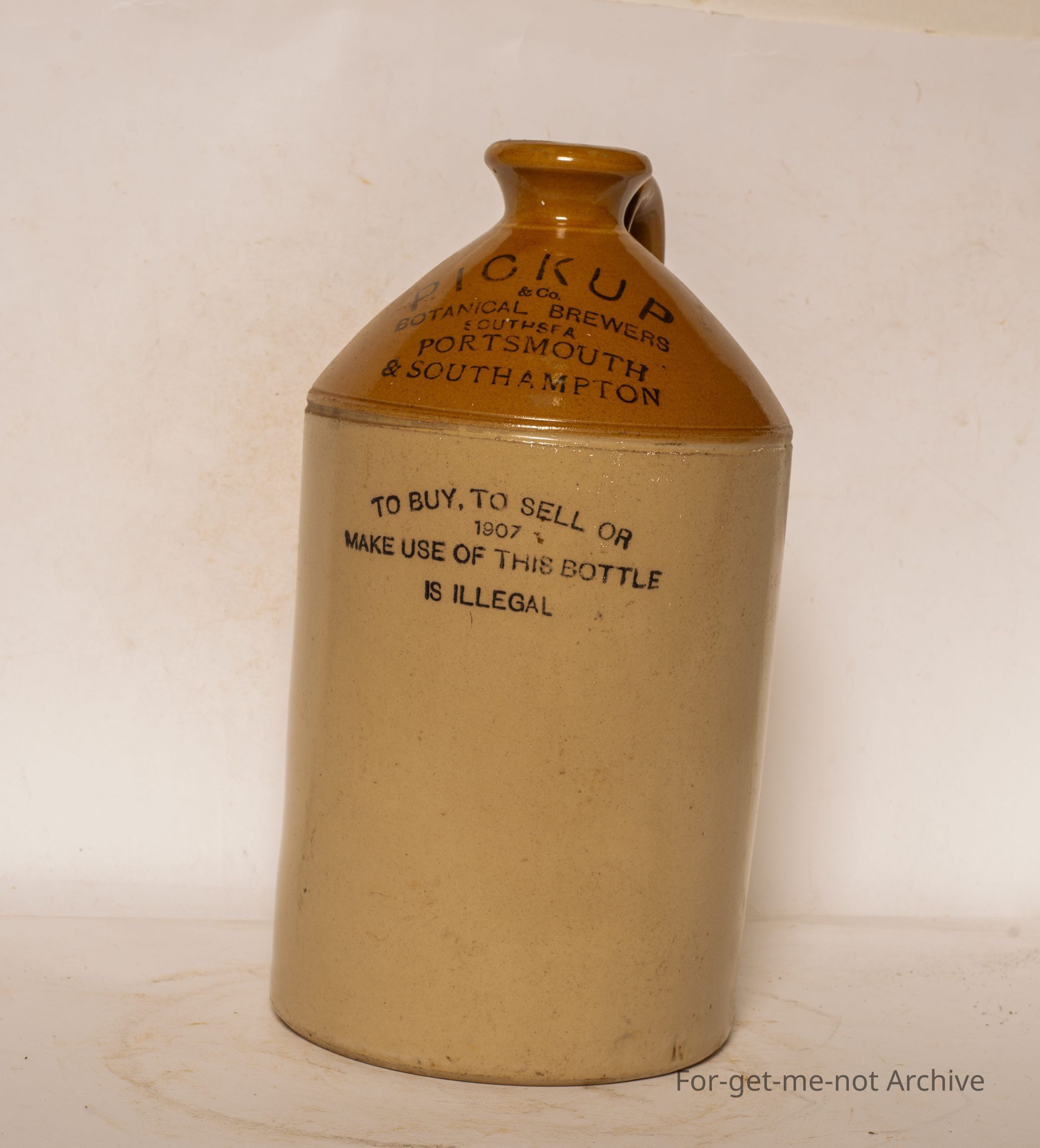 Stoneware jar, Kimi John, this handle, this is of English origin called Pickup and Co. Botanical Brewers Southsea Portsmouth and Southampton. To buy or sell or make use of this bottle is illegal. This is an English bottle, so not a great deal of interest in Australia.Collection