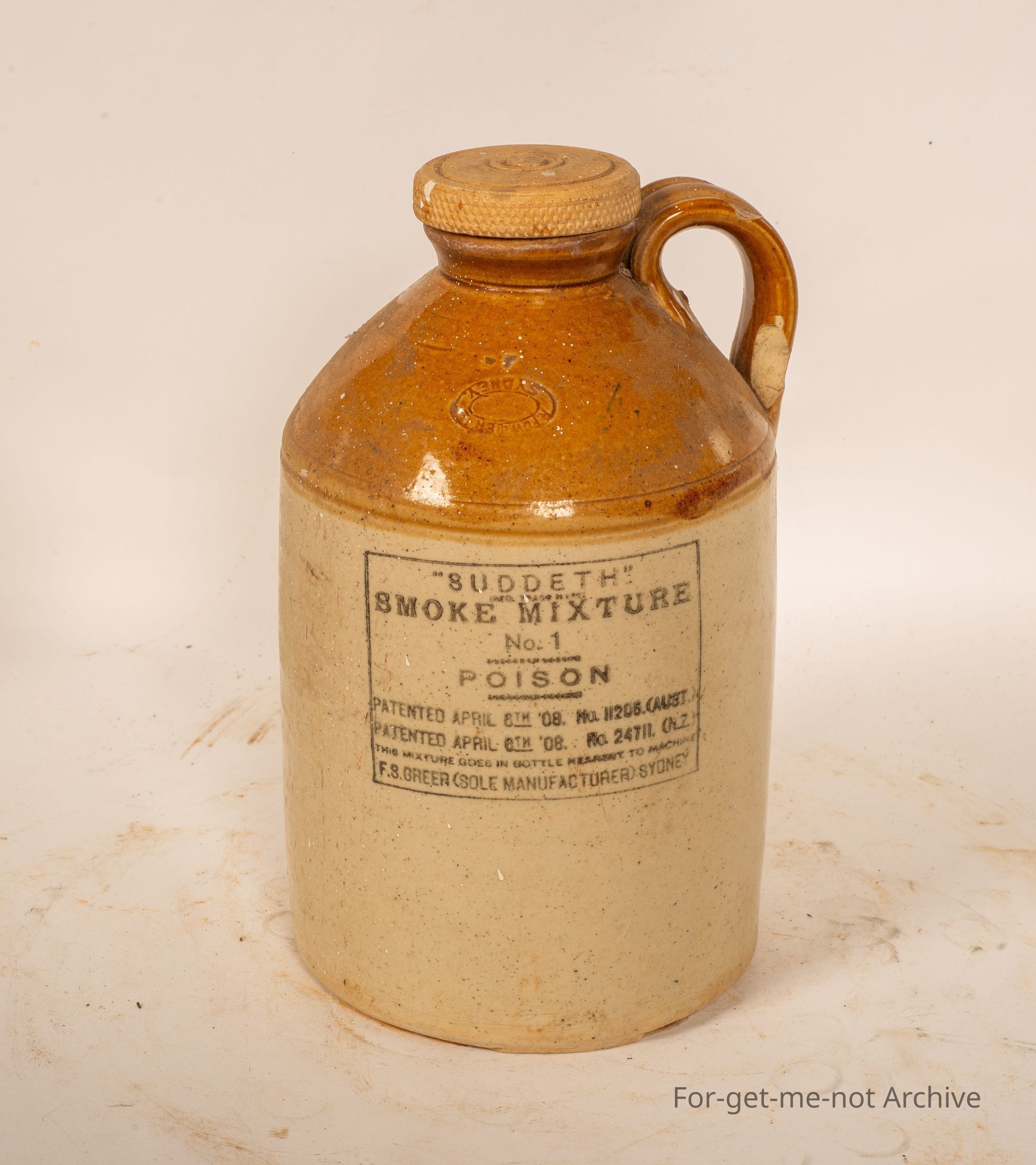 Stoneware, this is a small demijohn, from the product has been Suddath Smoke Mixture number 1 Poison for poisoning rabbits. This Demi John has been made by, Fowler Sydney with a stamping on the shoulder. This is the smaller size of these Suddath Demi Johns. Has original lid, no cracks, in very good order.Collection
