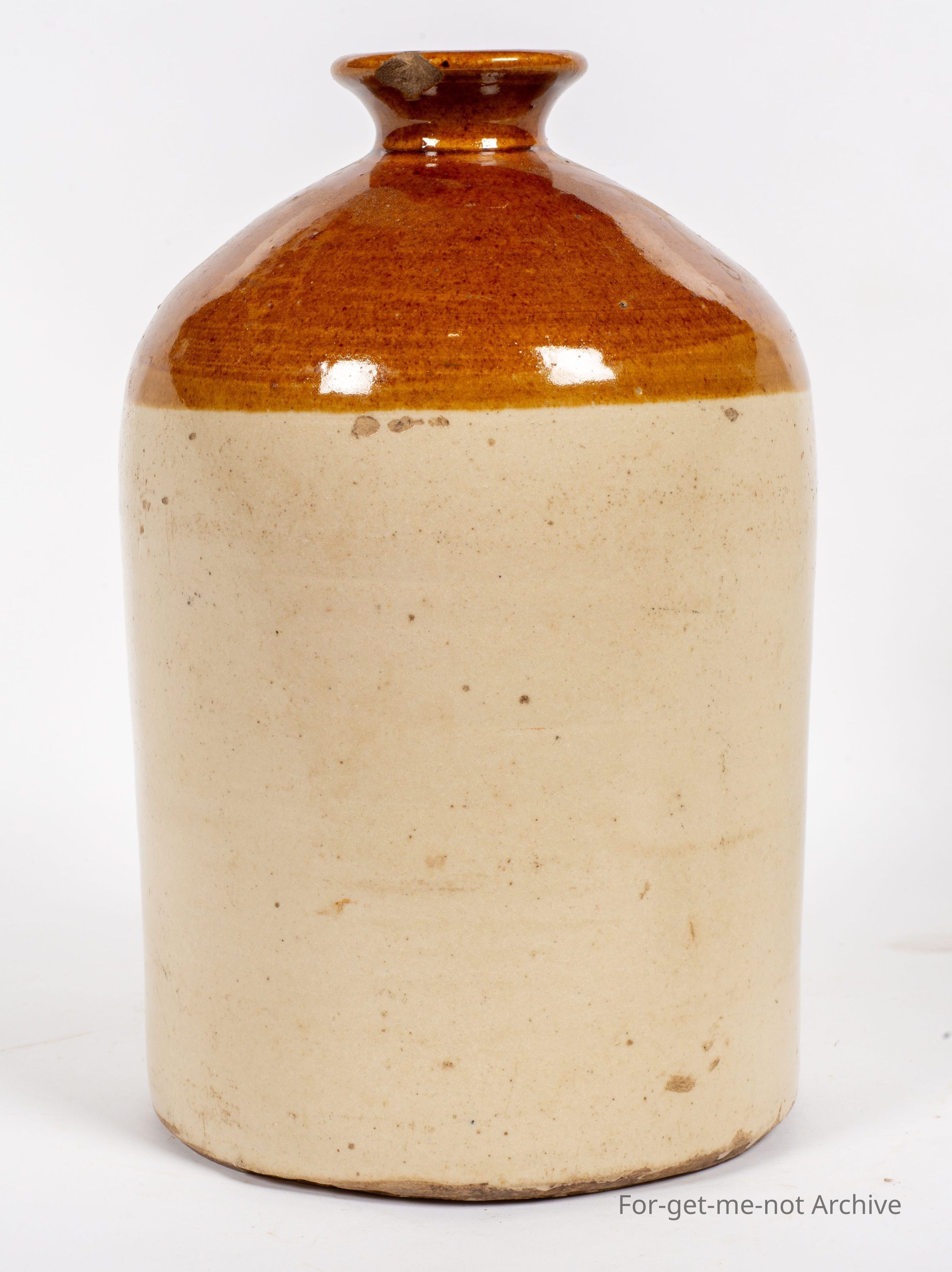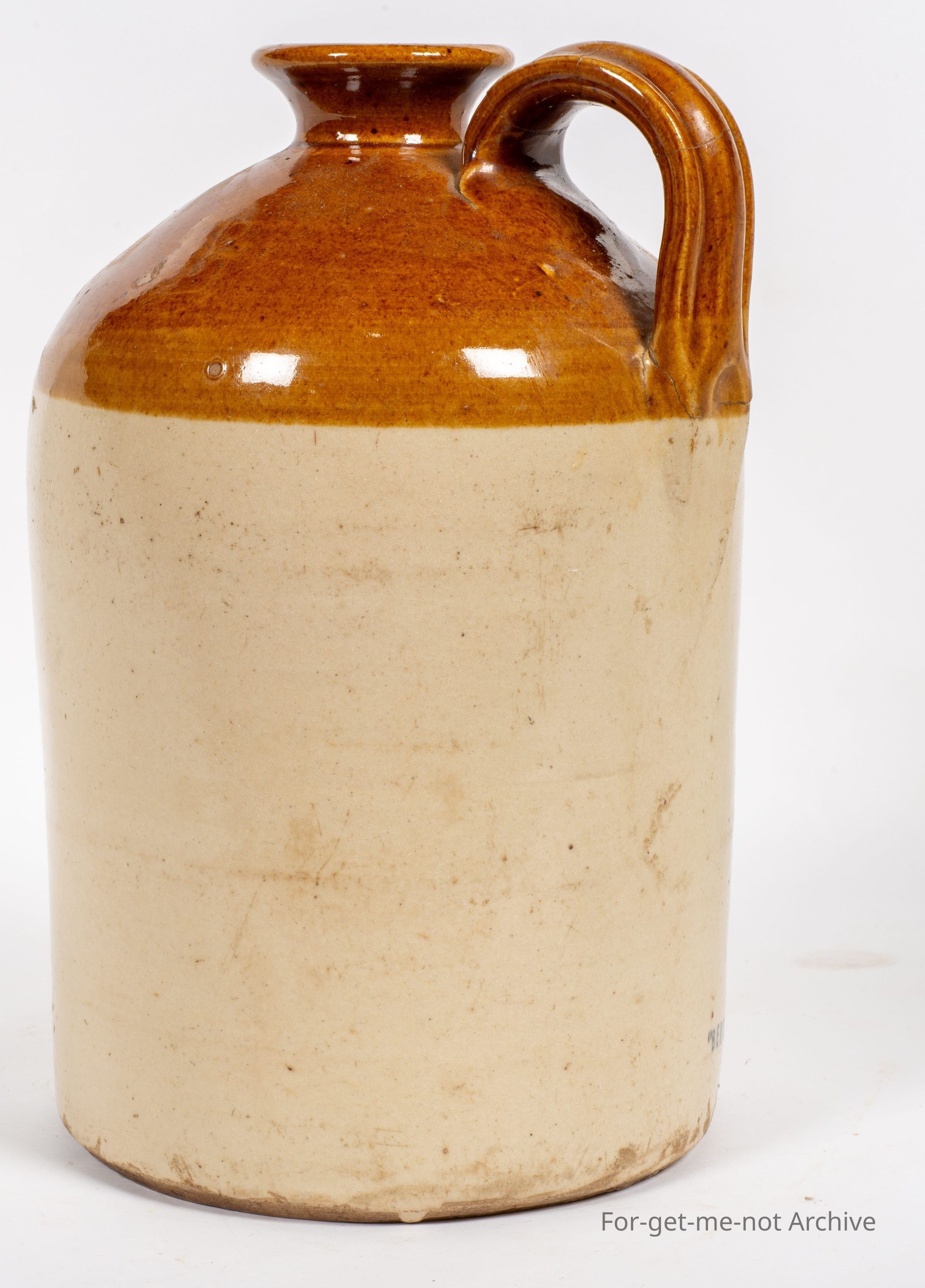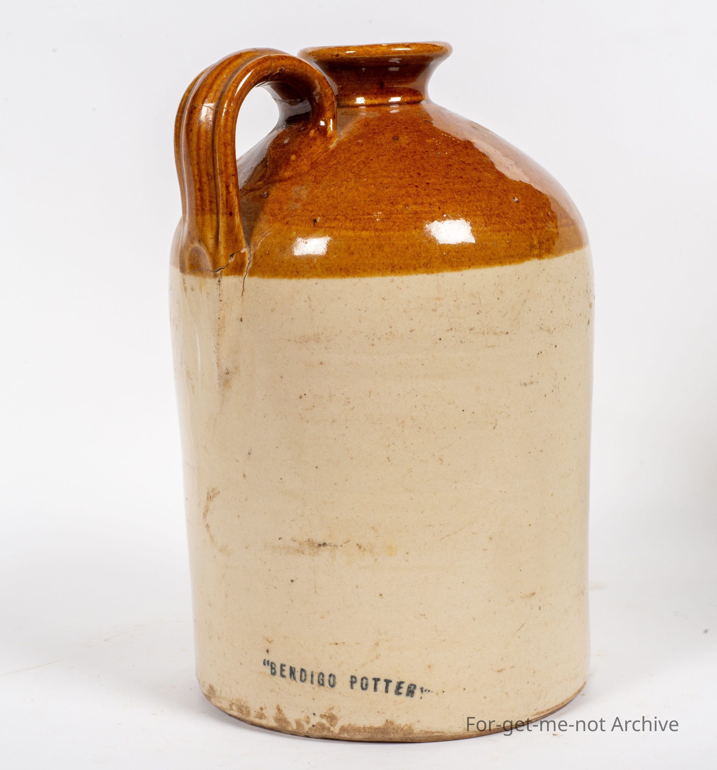Stoneware pottery. This one, a demijohn, this is ink stamped Bendigo Pottery from GD Guthrie, cracked to the bottom part of the handle, but the handle's still there. Quite a good neck. A nice piece.Collection