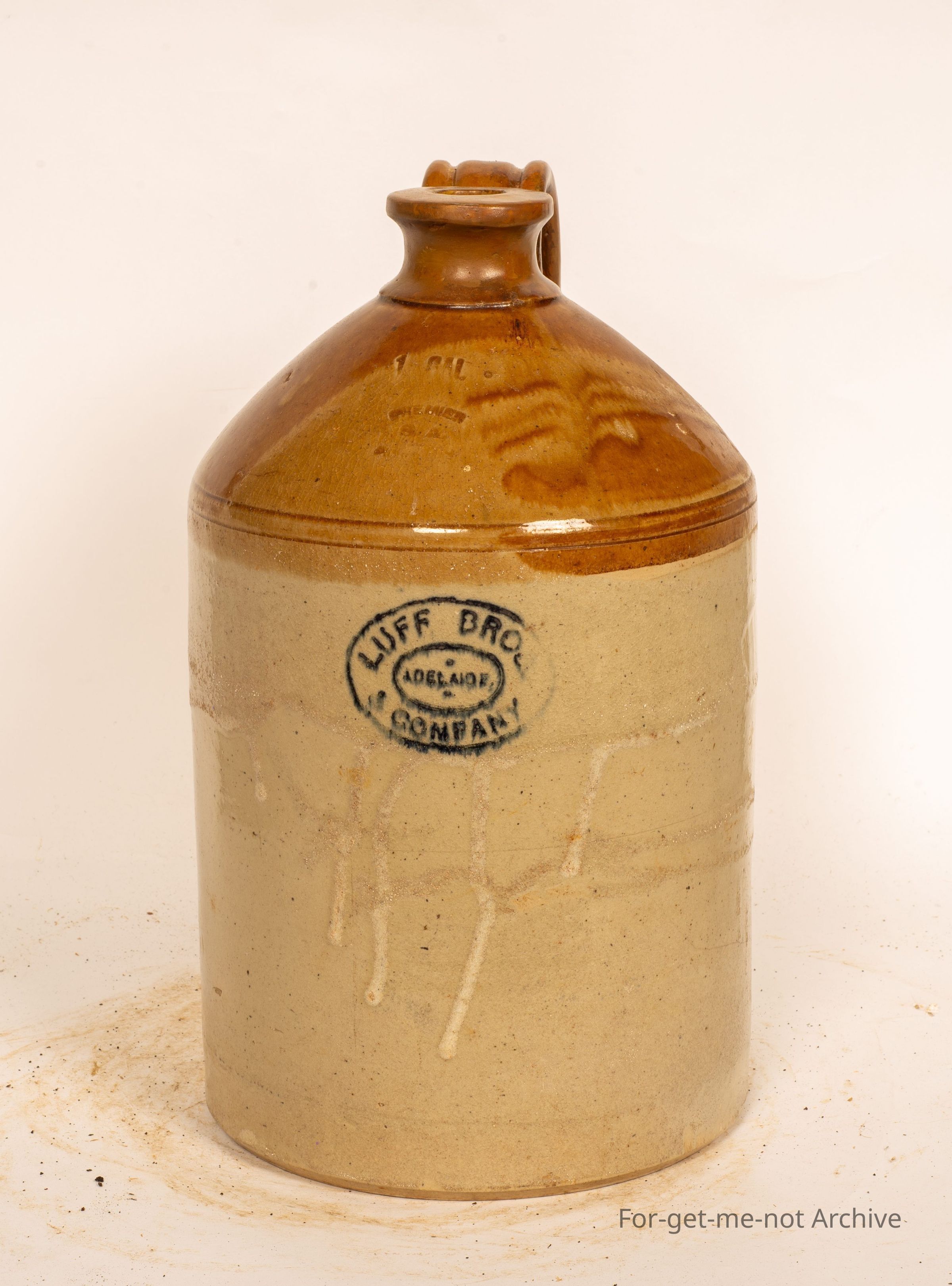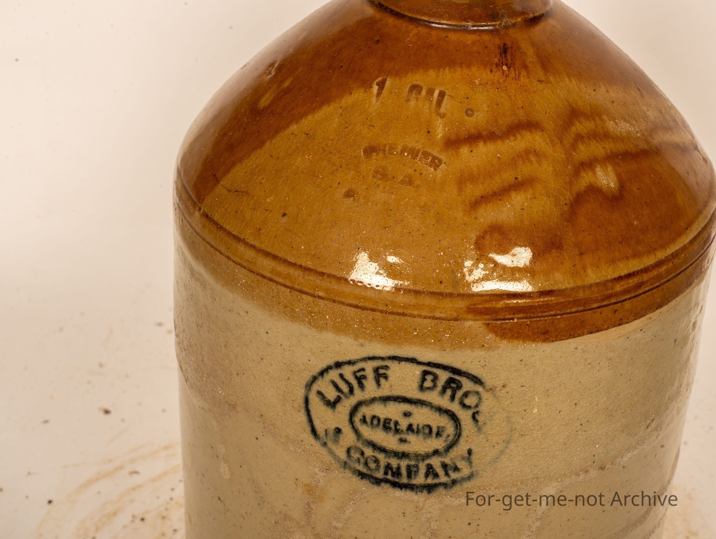 Is back to Stoneware Pottery. This one, a Demijohn stamp with an ink stamp of Luff Brothers and Company, Adelaide. Luff Brothers started off in Jeparit, went to Carnivar, then to Adelaide. The pottery stamp is Costa's Premier Pottery. So South Australian. Considered a very rare piece, this has had a handle repair and repairs to the neck.Collection