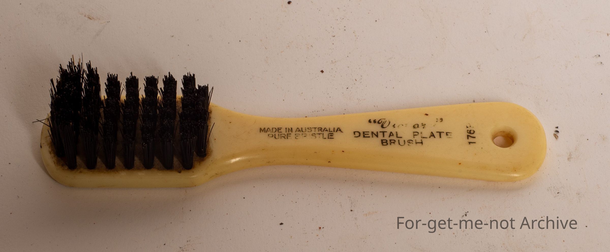 This is an unusual dental brush, the purpose being dental plate brush for false teeth, made in Australia. Pure bristle. Good condition.