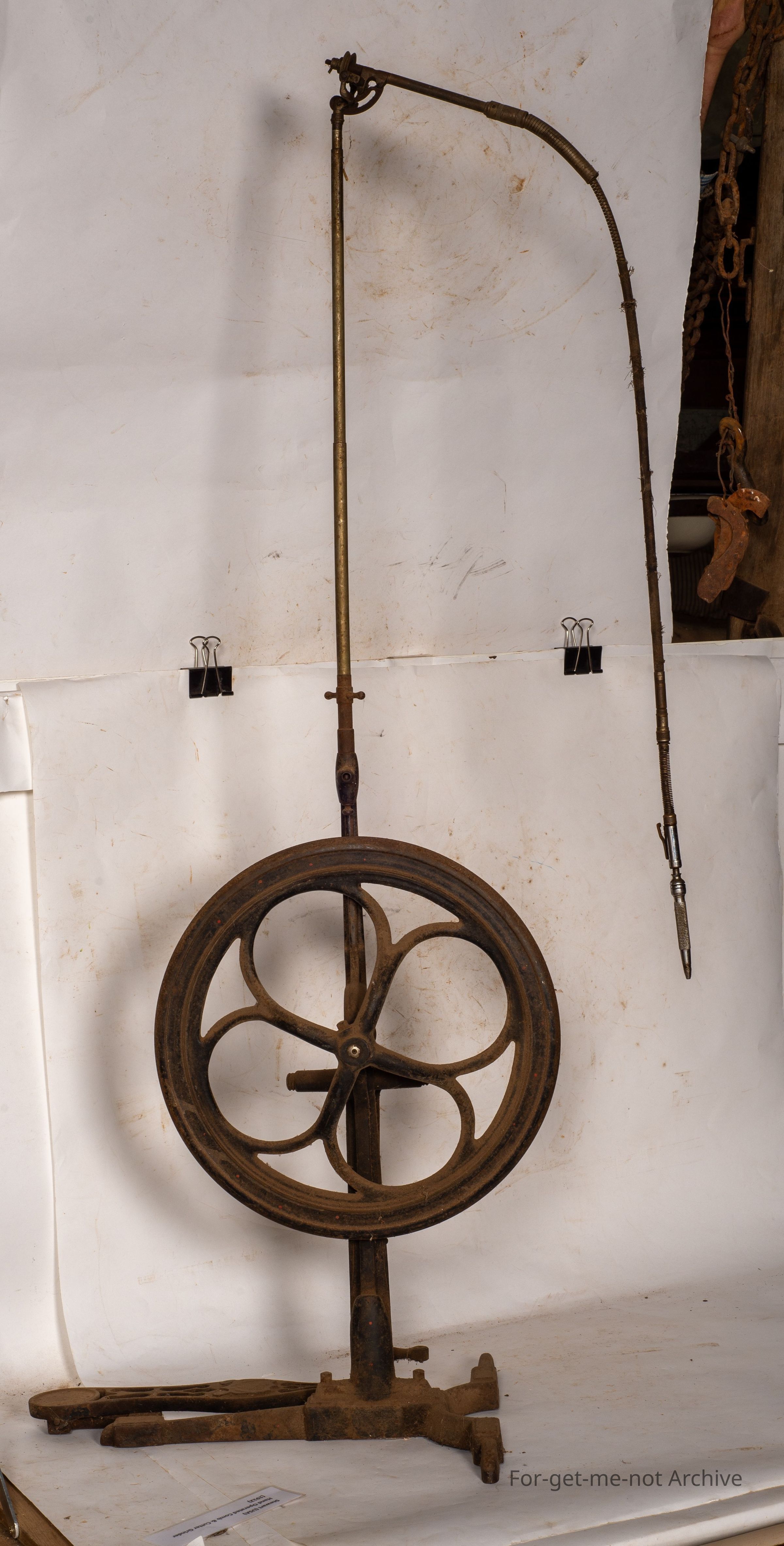 This is a foot operated dental drill that works on a thin rope, from gearing at the bottom to a little wheel at the top with a flexible, drill piece that operates for the fillings. Once upon a time in all the rural areas, a travelling dentist used these drills to do all the dental work. Thank goodness those times have gone.Collection