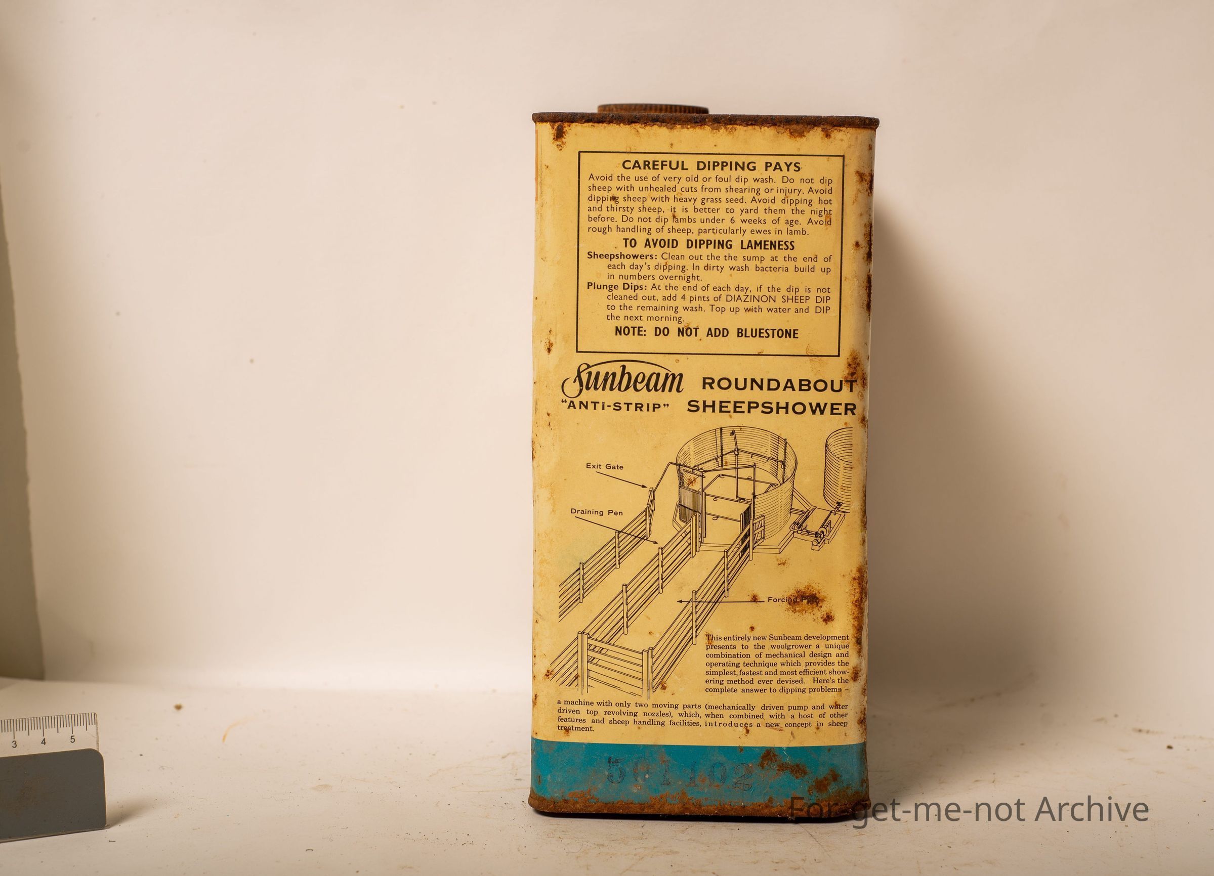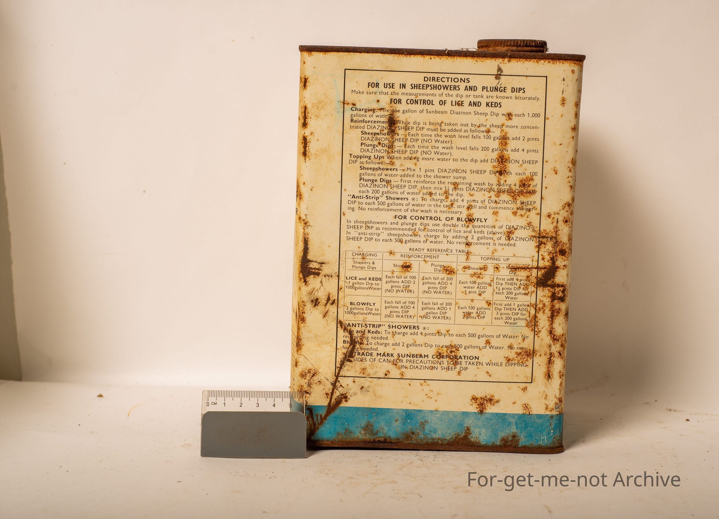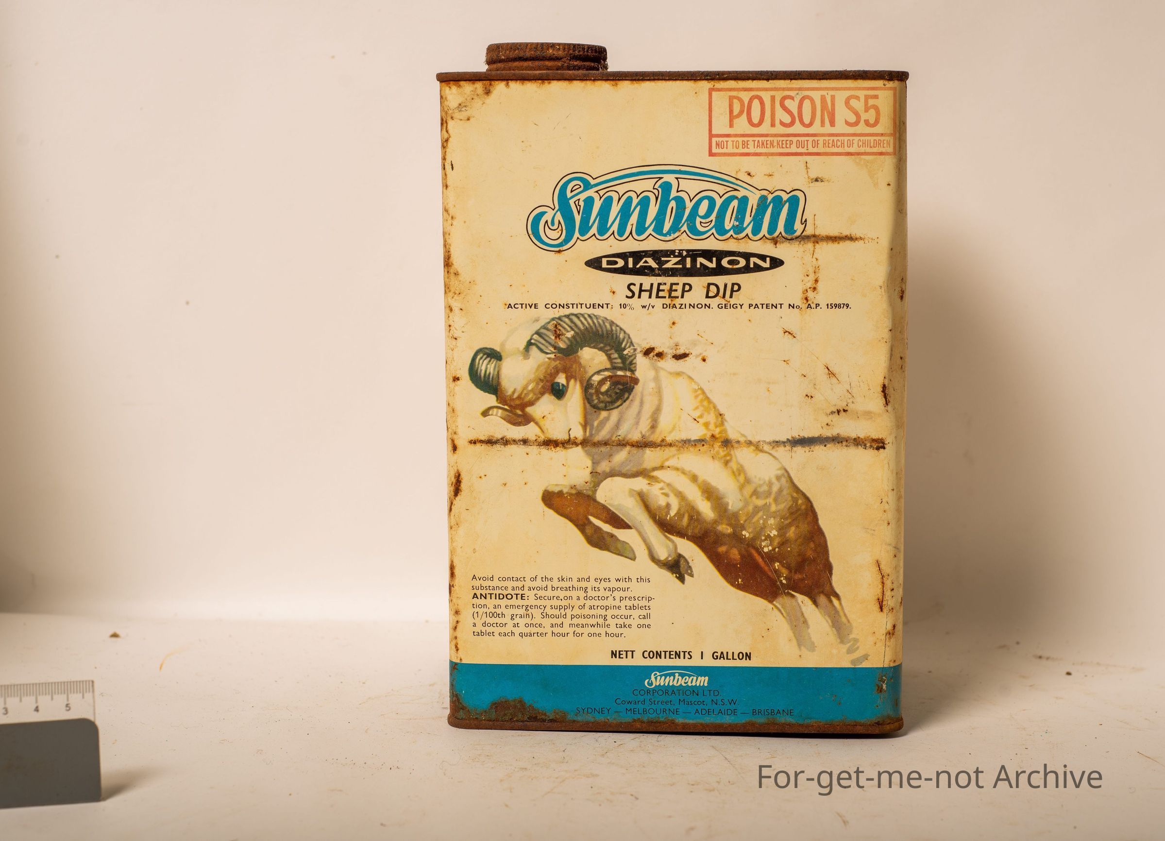 Sunbeam Diazinon Sheep Dip. Active constituent, Diazinon. Contents, 1 gallon, with a jumping Merino ram image on the front. tin, just in reasonable condition. Tin come with antidote instructionsCollection