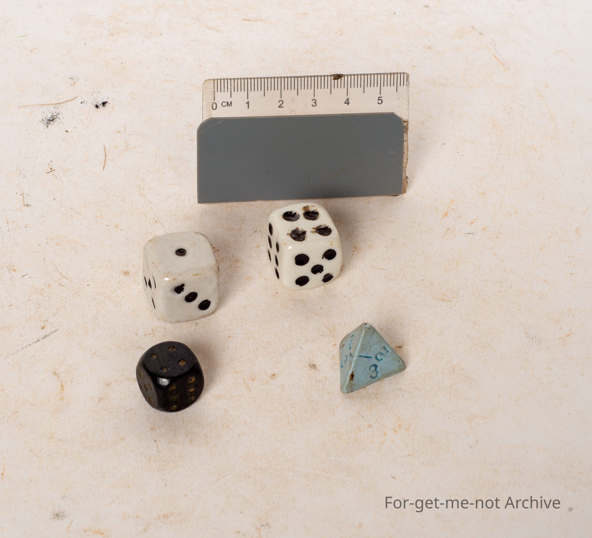 These, a group of 4 different, dices. 2 of them quite big ceramic ones, one little black one, and then an unusual triangular one, know what away which way you throw it. It's still in a triangleCollection