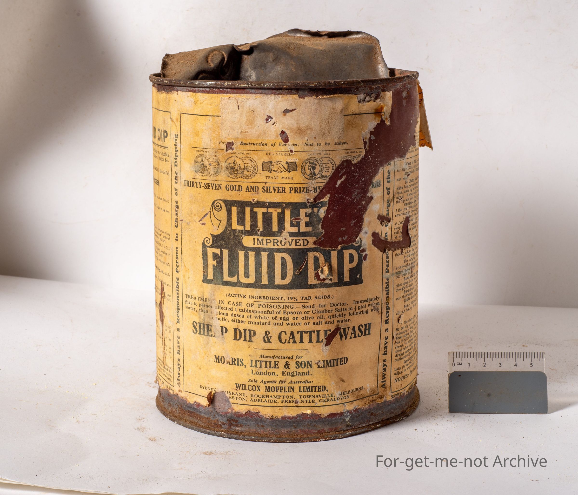 This is a later version of the Littles powder dip. This is Littles improved fluid dip, Sheep and Cattle Wash, Morris Little England, Sole Agents, Wilcox Mofflin. Once again, pretty poor condition,Collection