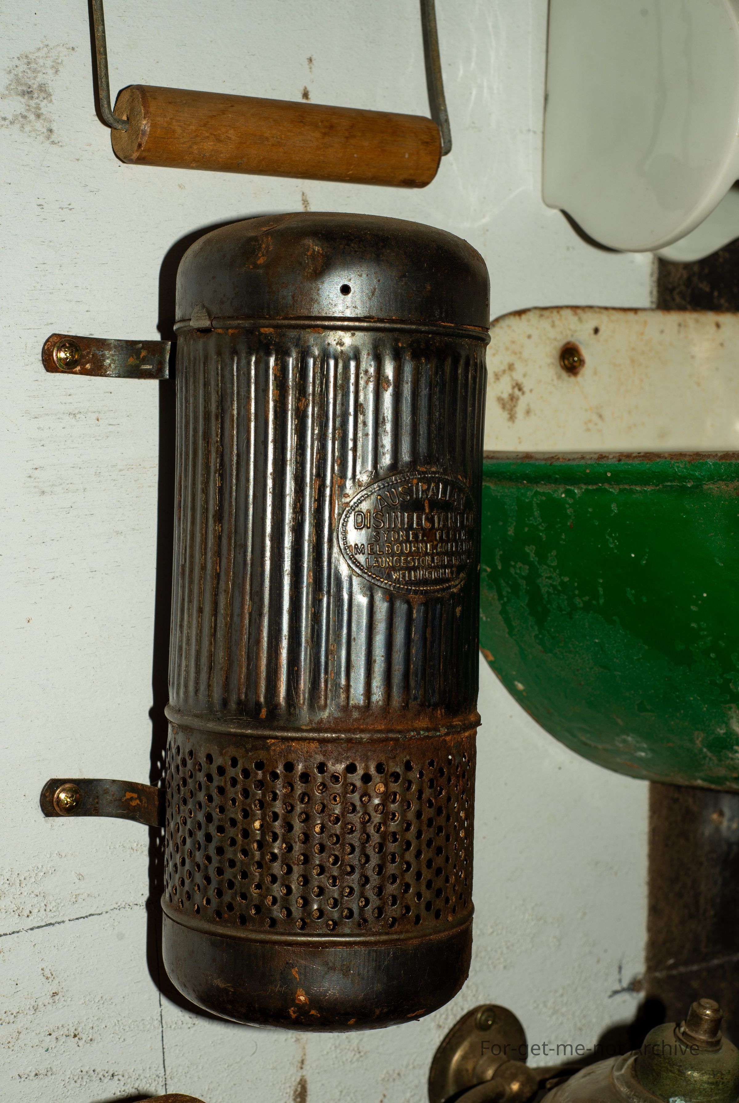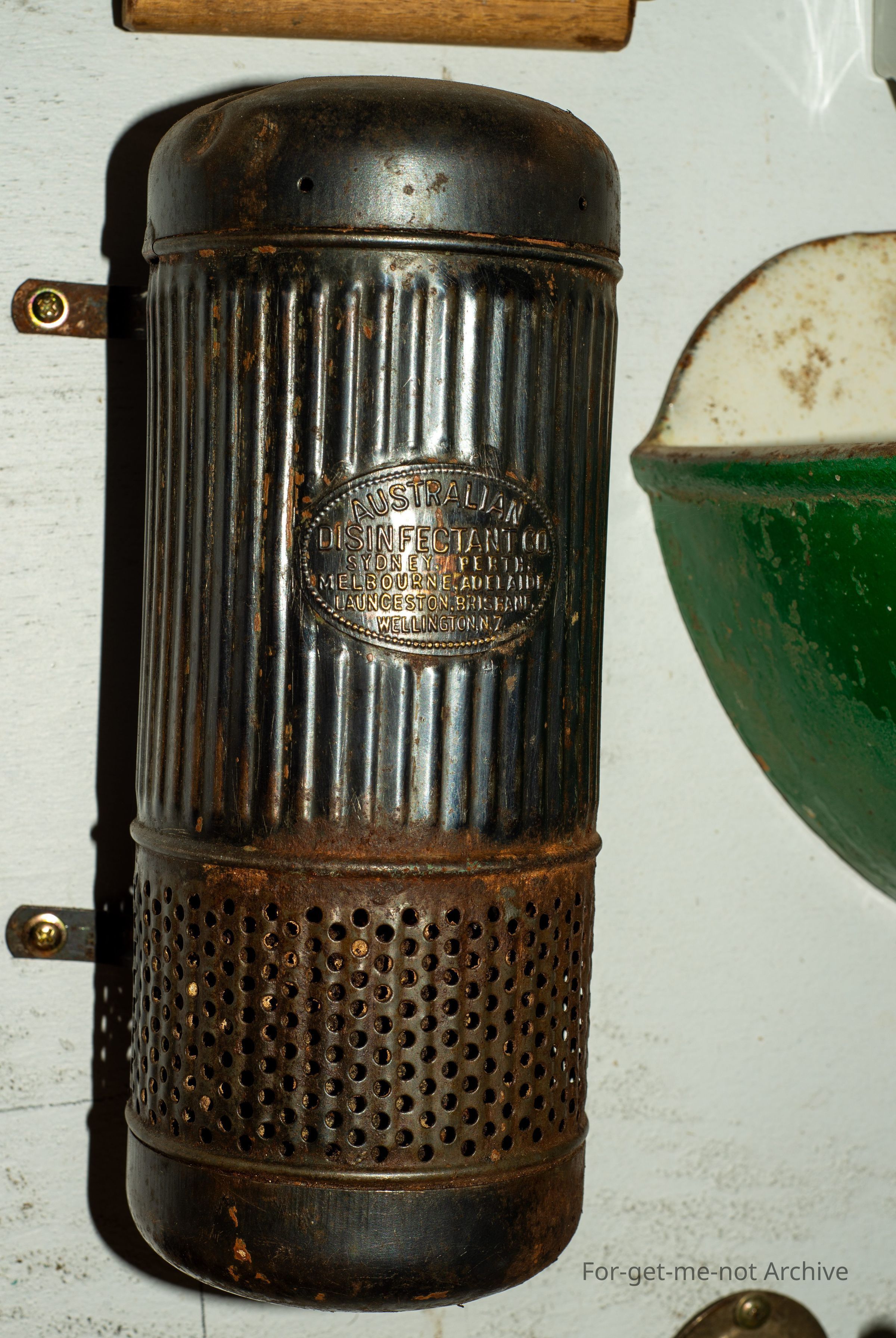 Metal disinfectant ,this was, screwed to laboratory walls or anywhere else where there was odours. Has a manufacturer's plaque of the Australian Disinfectant Company, Sydney, Perth, Melbourne, Launceston, Wellington, New Zealand. This one is in remarkable condition. Quite a rare item.Collection