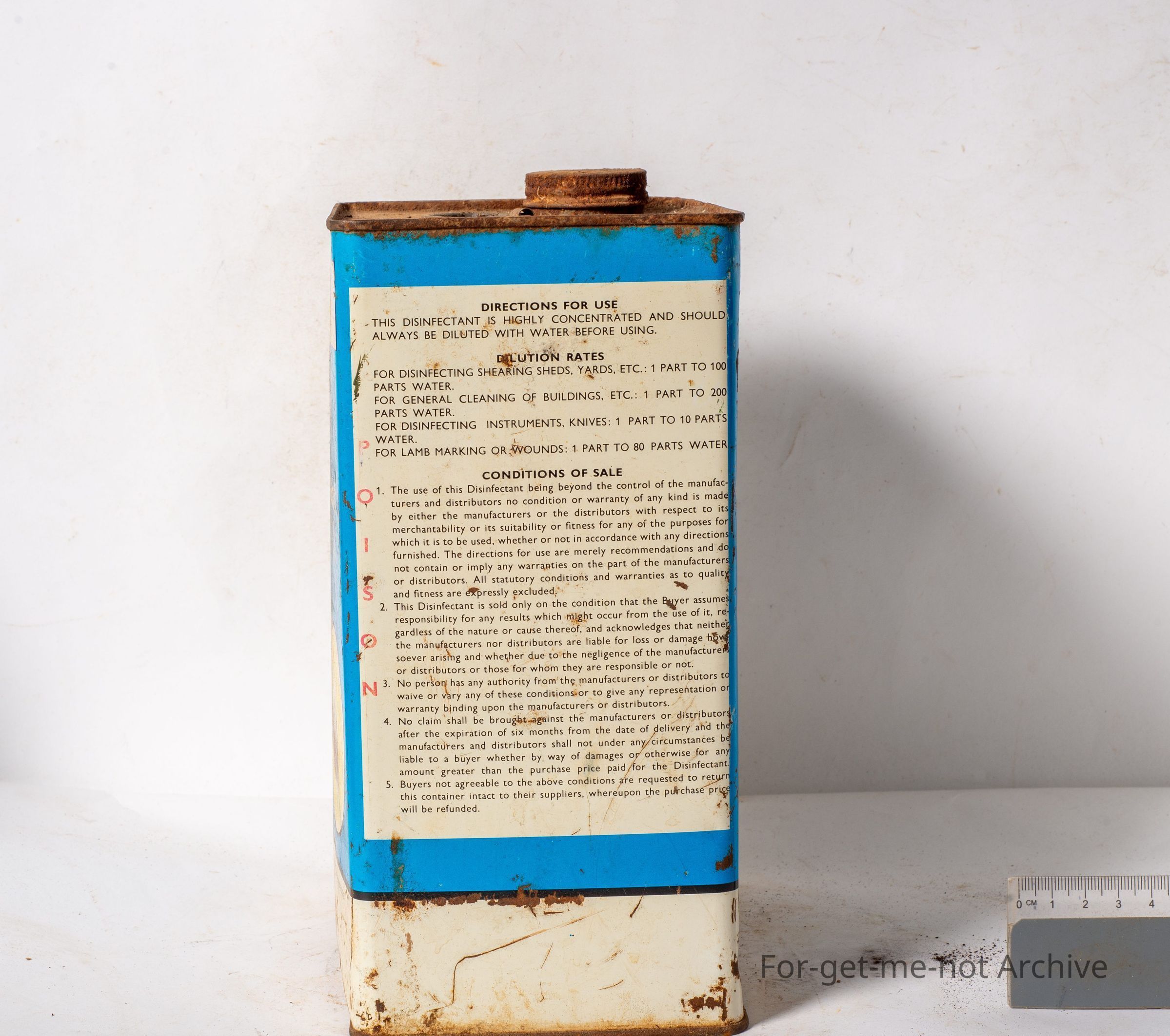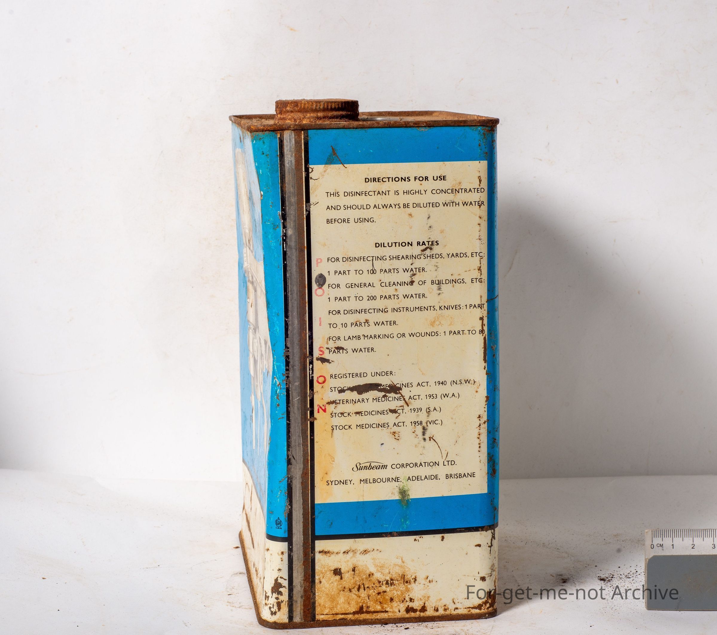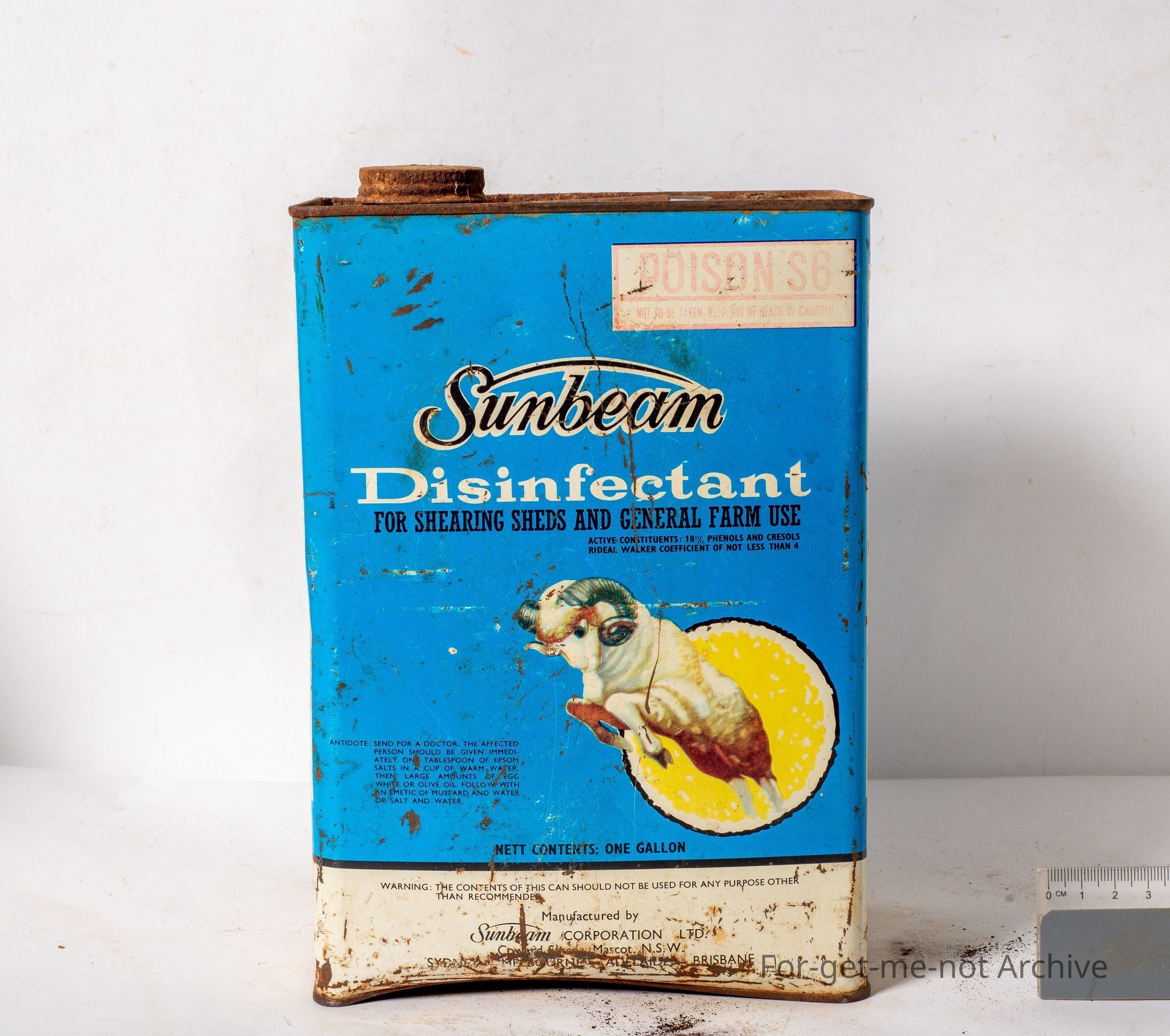 Sunbeam disinfectant for shearing sheds, etcetera. Image of a shearing machine on the back,