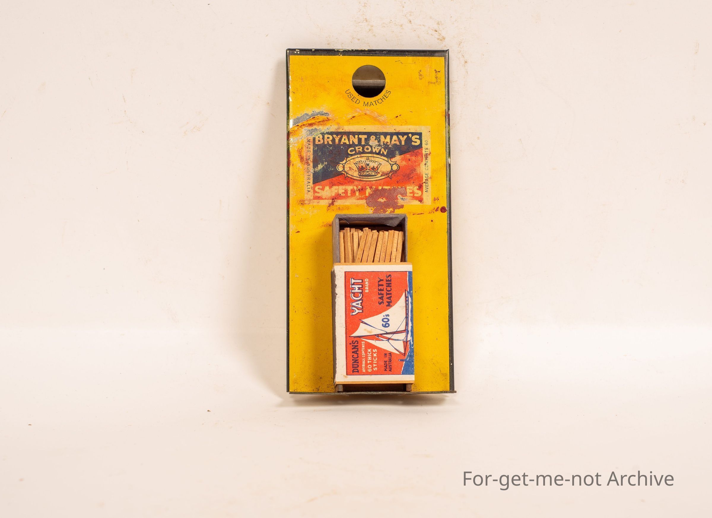 A dispenser for Brighton May matches with a little hole to put spent matches with a matchbox on the holder. Made of tin.