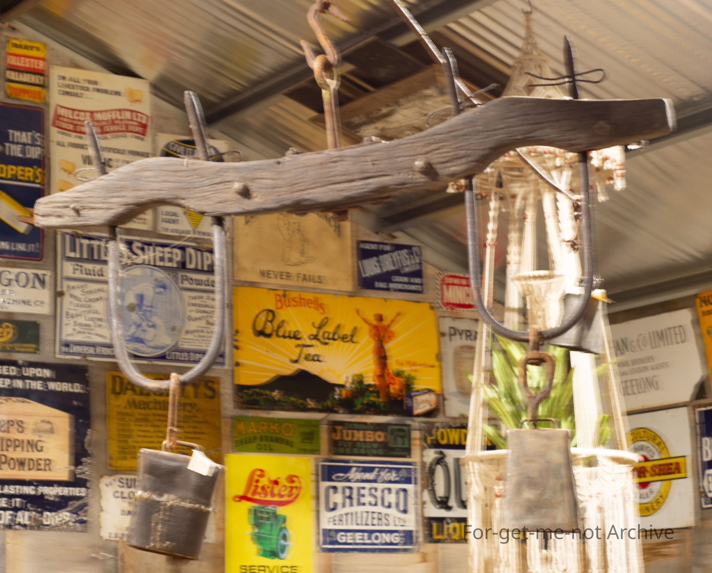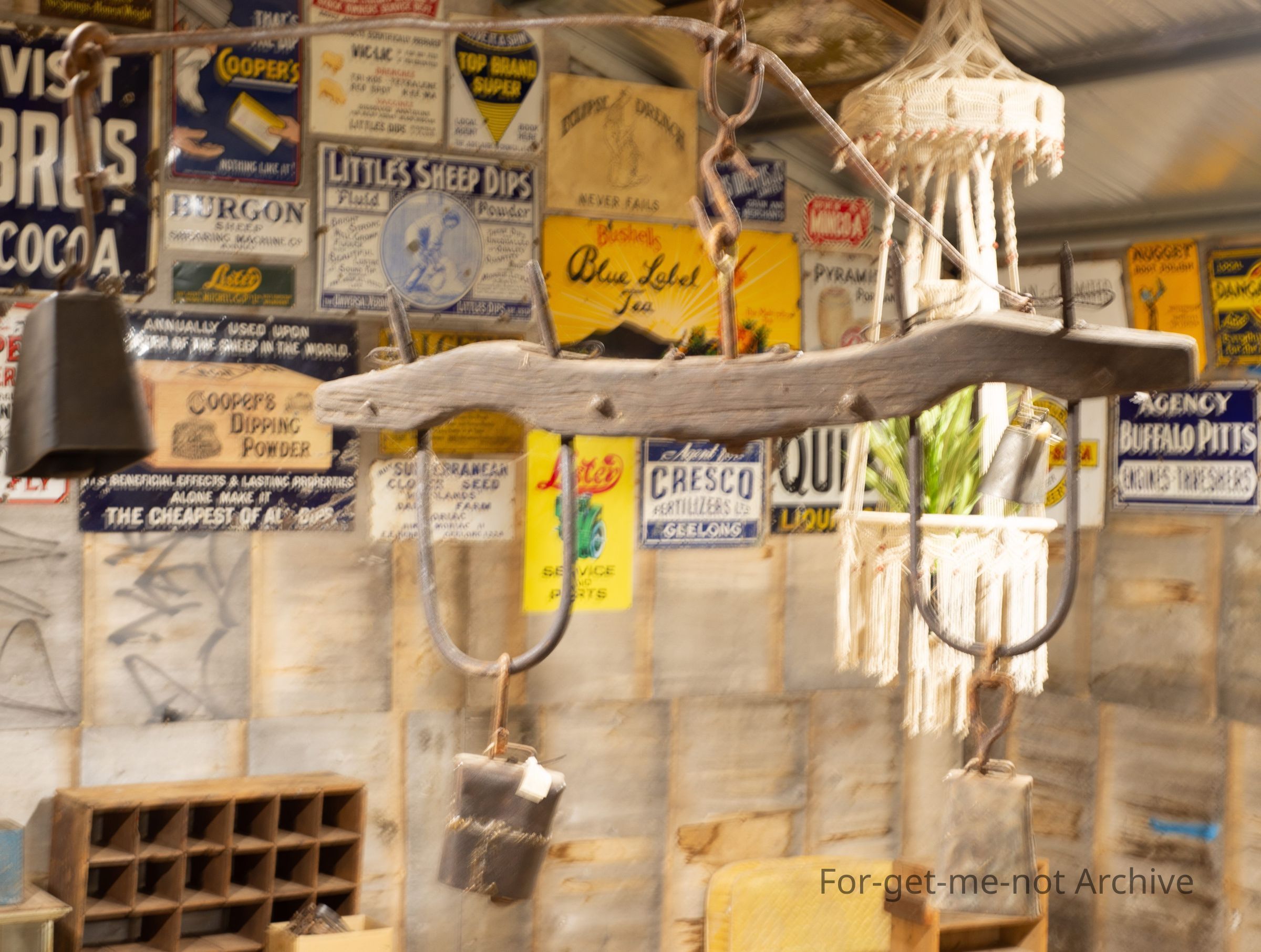 display unit hanging from roof featuring Bullock yoke and four bullock bells