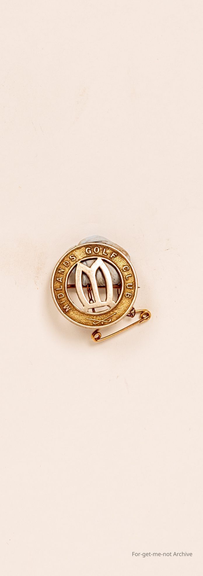 Metal badge of Midlands Golf Club, golf sticks crossed at the bottom with a large m.