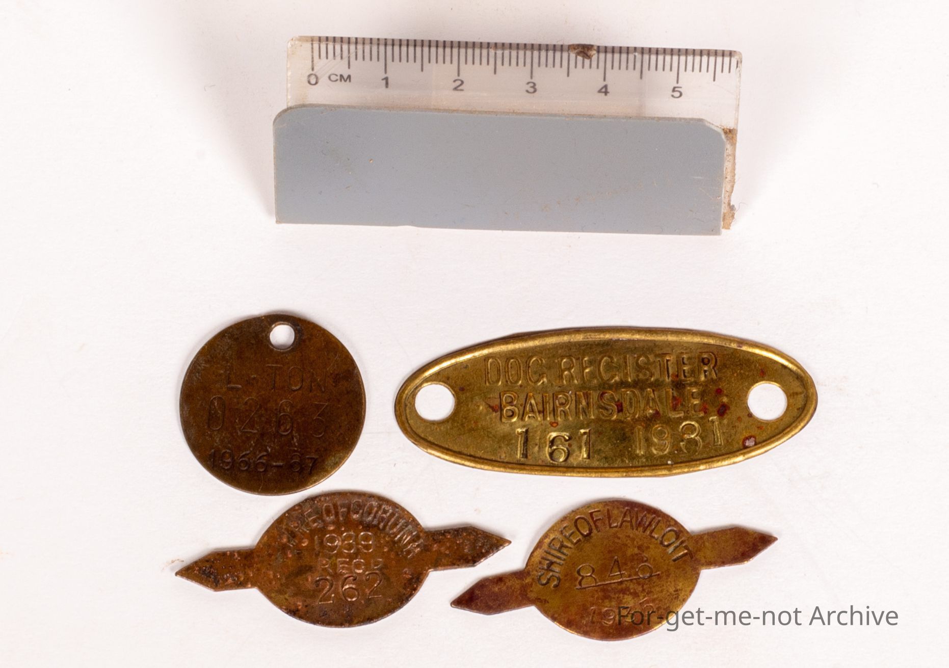 Group of 4 dog registration tags. First one, fold over tab, Shire of Lawlot 1935. Next one, dog register, Bairnsdale 1931. Followed by Shire of Cohuna 1939. Next one. This is a Tasmanian one Launceston, 1966.Collection