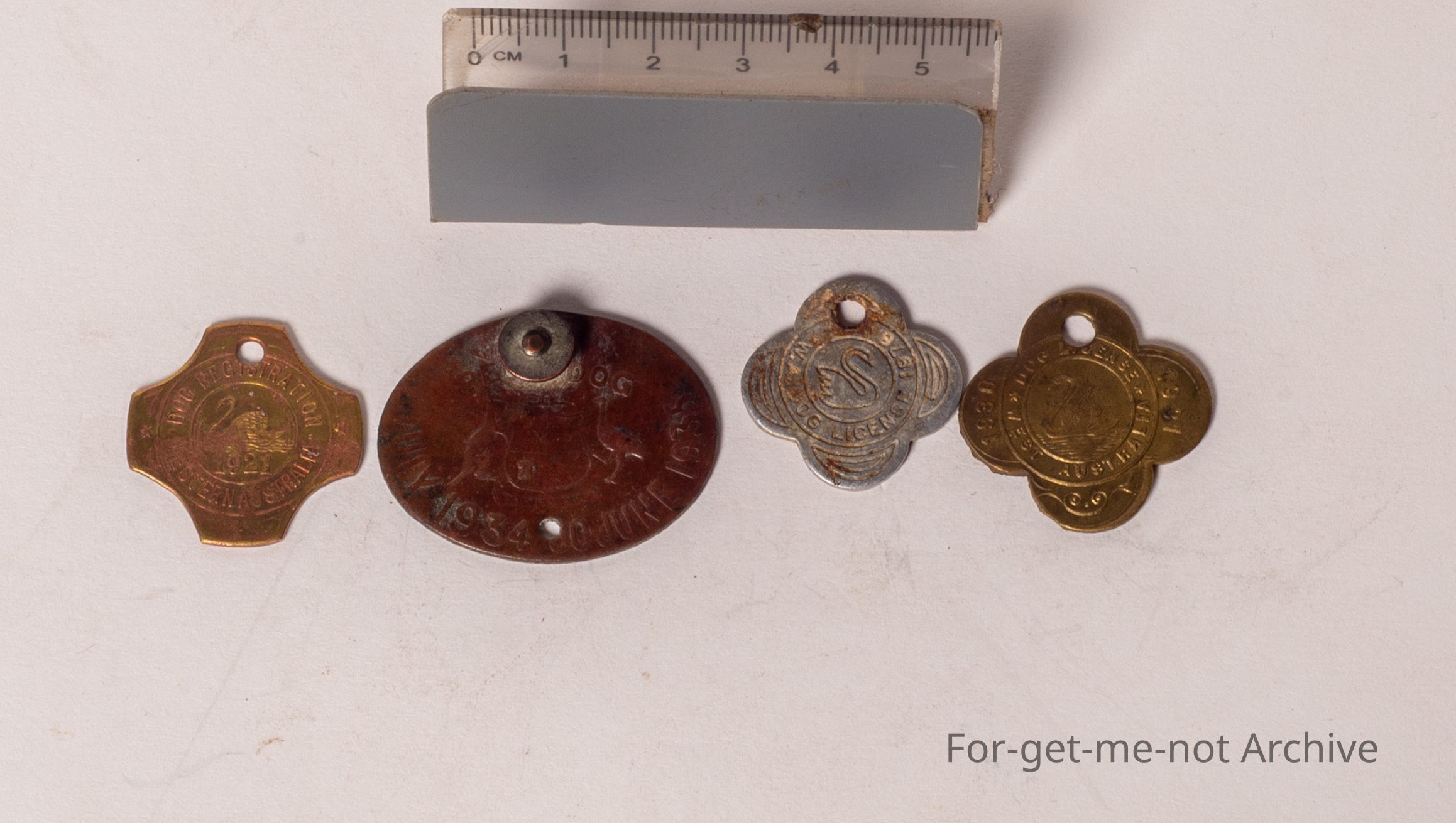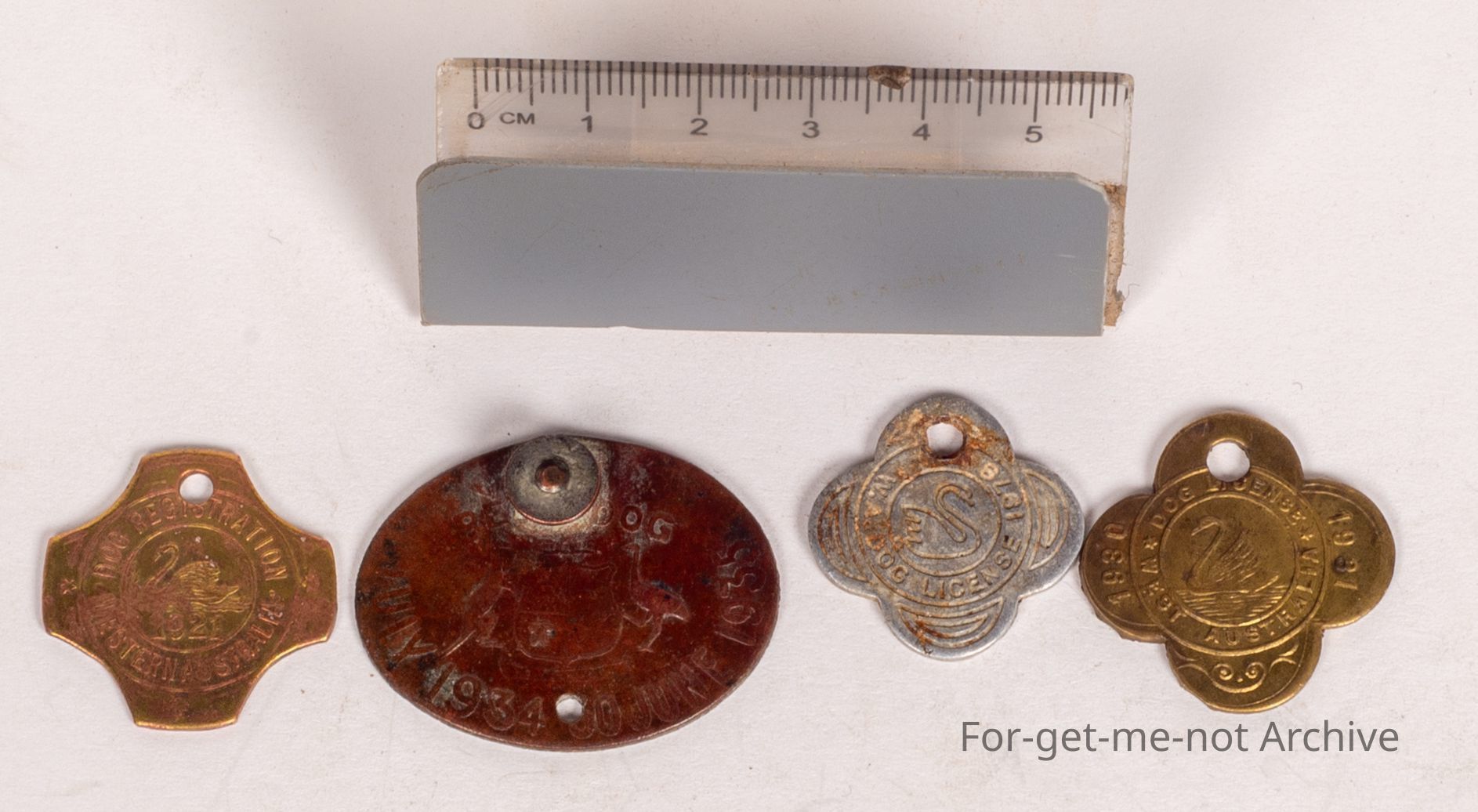 This is a group of 4 dog registration tags. First one from South Australia 1934. Next one, Western Australia, oh, well, Sandstone, 1975, I think. Next one, Menzies, Western Australia, 1931, Wiluna 1921.Collection