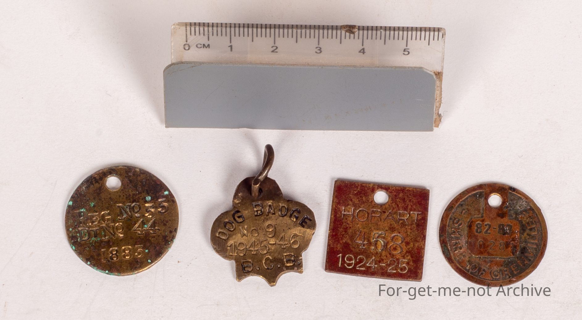 First one, Shire of Grenville, Victoria 1982. The next one, a very interesting piece. This is, registration number 55. District number 44, 1885. This was the provisional first issue of a dog tag in South Australia. No coat of arms. Extremely rare. The following one, a very hard one to find. This is from the Brisbane Council Borough, BCB 1945, and the last one is, from Hobart, Tasmania, 1924.Collection