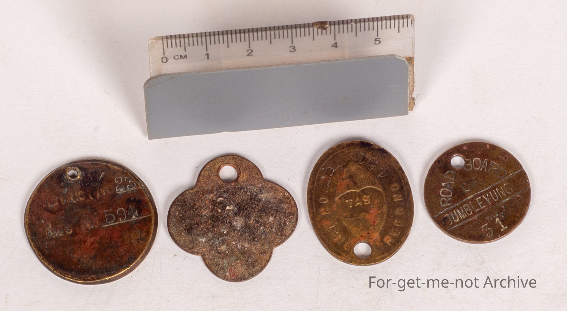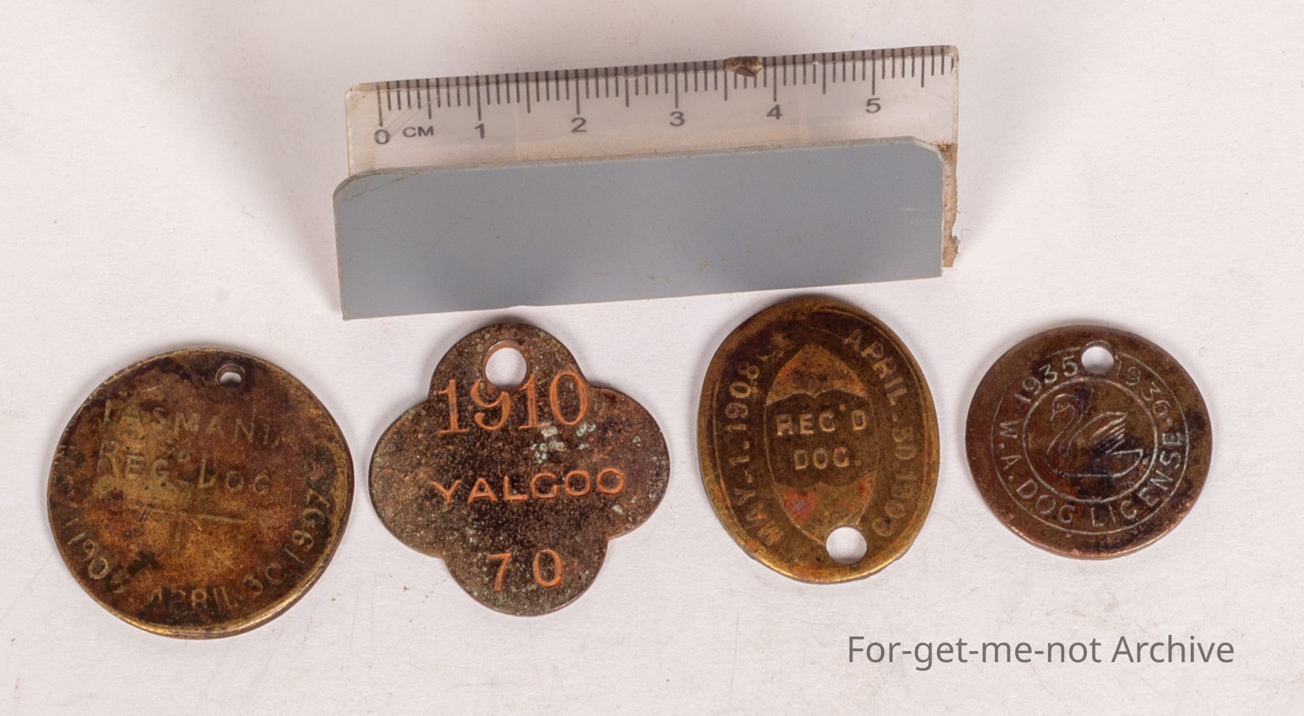 Group of 4, grass dog rego tags. 1st one, Tasmania, 19 7.Followed by Yalgoo, Western Australia, 19 10. 3rd one, Tasmania, 1908. 4th one, Western Australia Road Board . Dumbleyung 1936