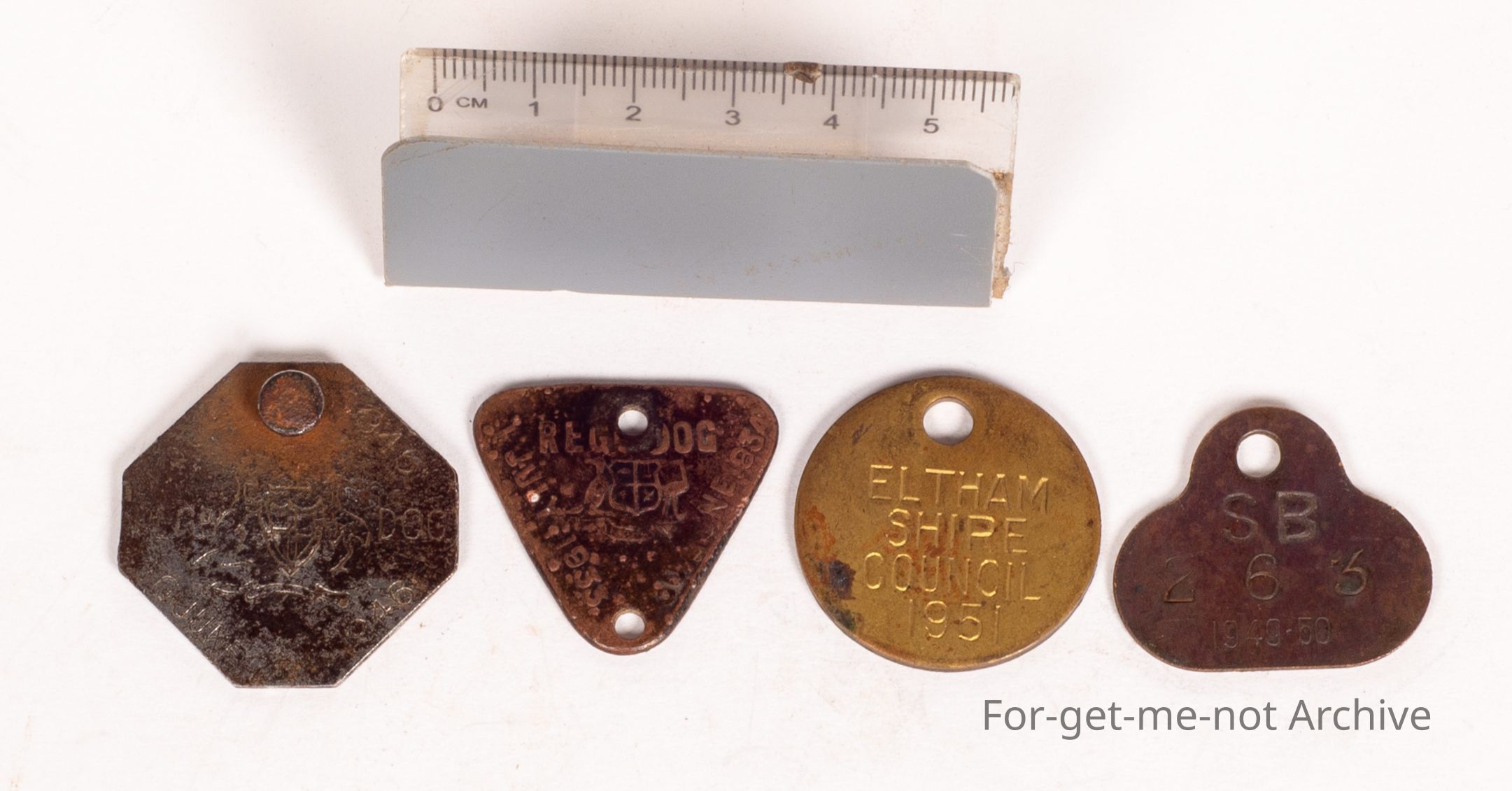 Another group of 4 dog rego tags, this one, Eltham Shire Council 1951, Victoria, followed by, this will be South Australia, 1933, tag for a bitch, another South Australian, This one, the war years, these are very hard to get, 1946. This one is, Sandy Bay, Tasmania, 1949.Collection