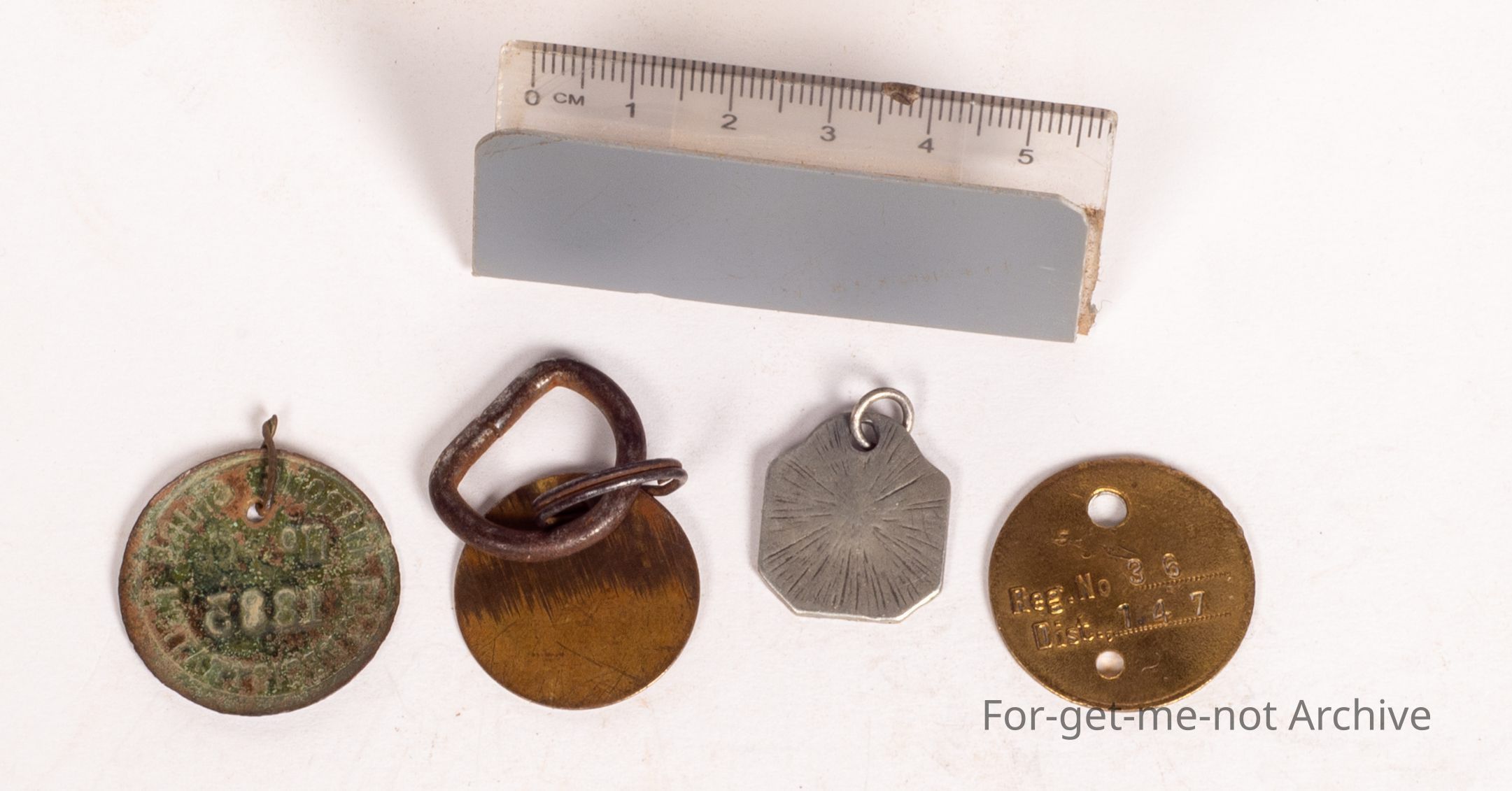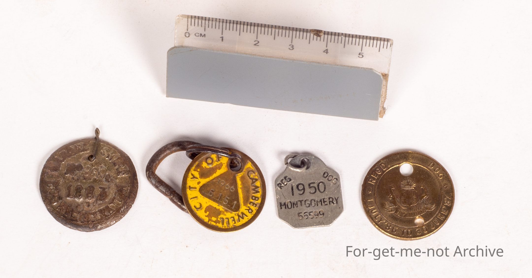 4 dog tags, 1 brass one, South Australia, another one Montgomery 1950 Melbourne, Another brass , City of Camberwell 1960. The last one is Press Tin. It says Morong Shire dog registration 1883/5. That could be 3 or 5.Collection