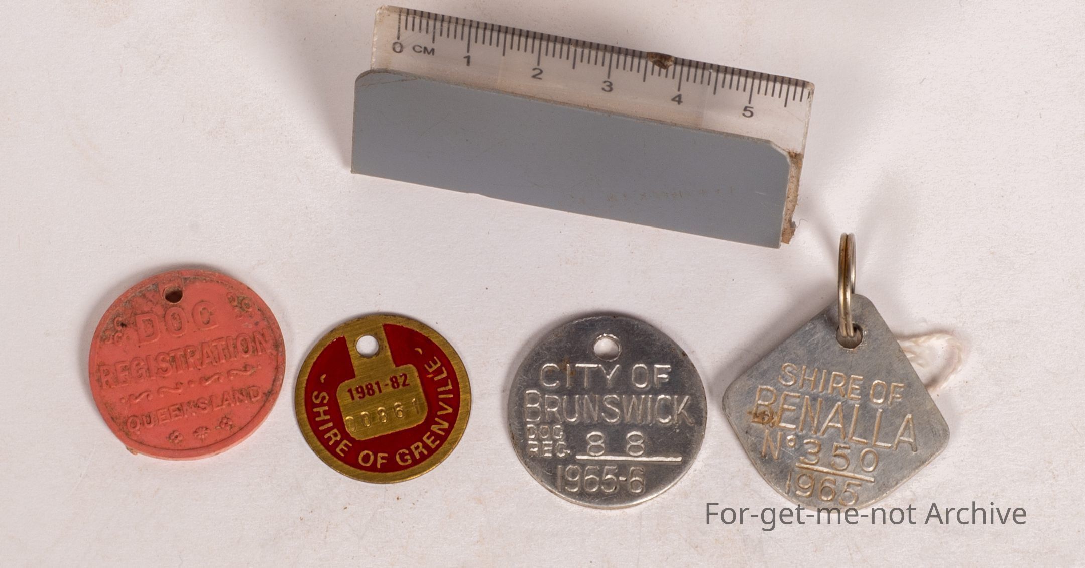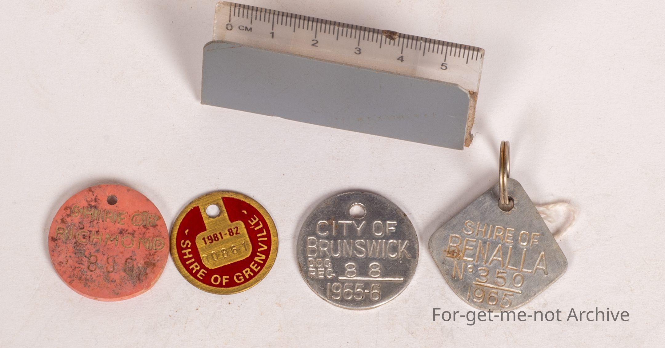A group of 4 dog registration tags. First one, plastic, registration for a dog Queensland, Shire of Richmond. Not certain of the year. Next one, brass, Shire of Grenville, 1981. Next is aluminium. City of Brunswick, 1965. Aluminium. Another aluminium, Shire of Bonella.Collection
