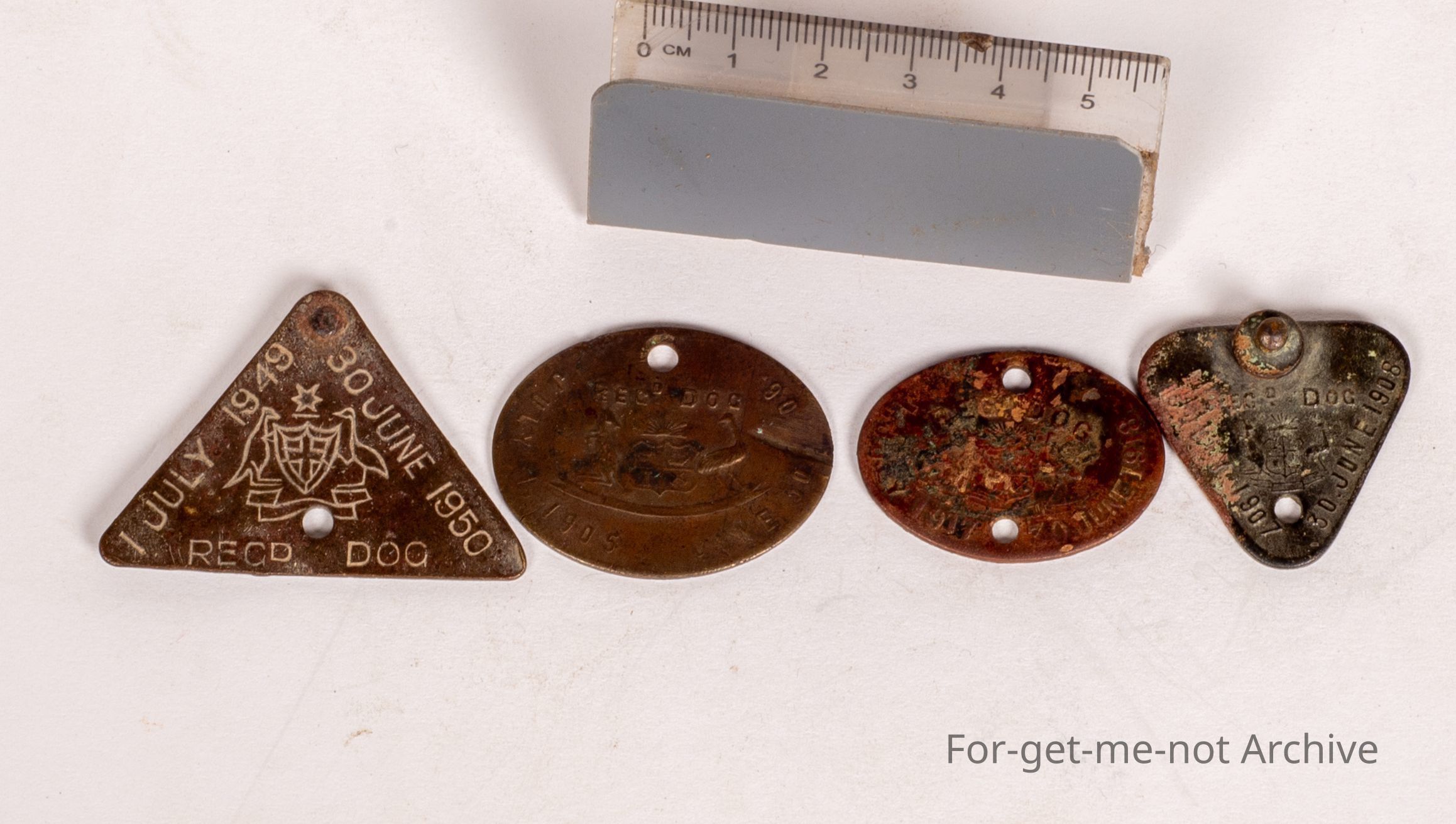 Group of 4. Registration tags for dogs are all brass or copper. First one, 1906. Next one, 1950. Third one, 1907 and followed by the 4th one of 1917