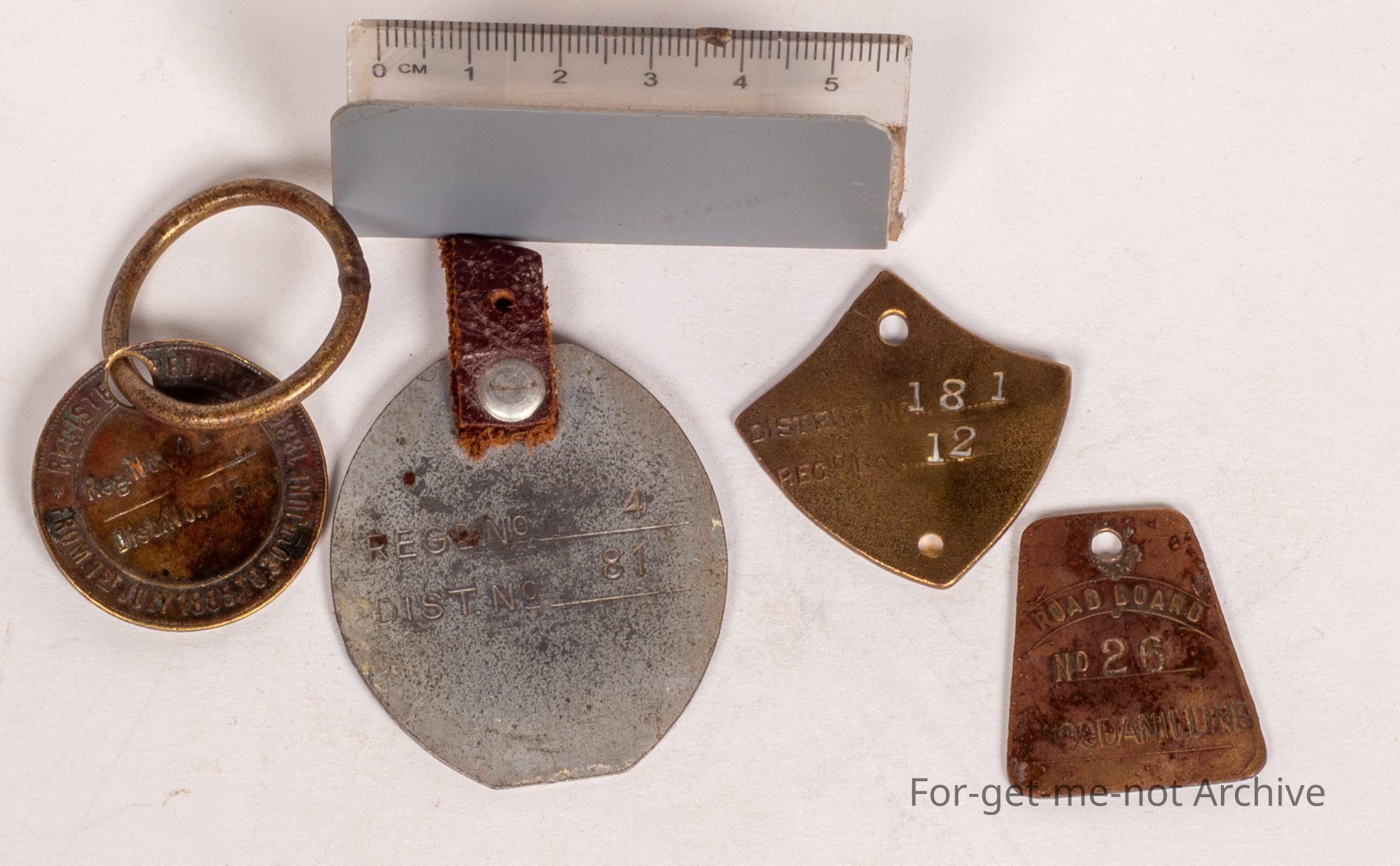 Dog registration plaques, this one, Brass, 1923, Western Australia, followed by, this one is South Australia, 1895. The next one is an aluminium. This was a separate registration for Alsatian dogs in South Australia. Very hard to get, 1959. The last one is the 1st official year of issue for a dog registration tag, 1880, the act was 1884. This will be here 1885/86 in beautiful order, still with the original brass ring that was, part of the original issue from South Australia.Collection