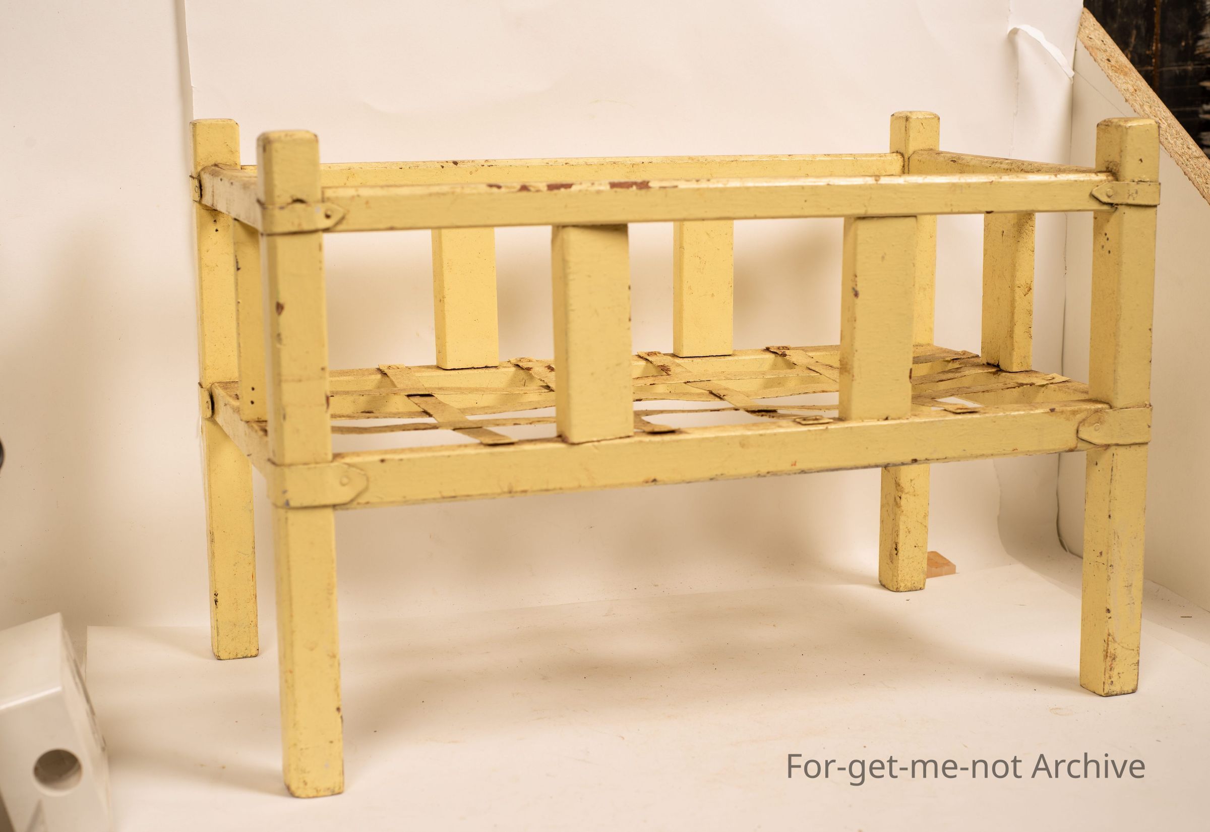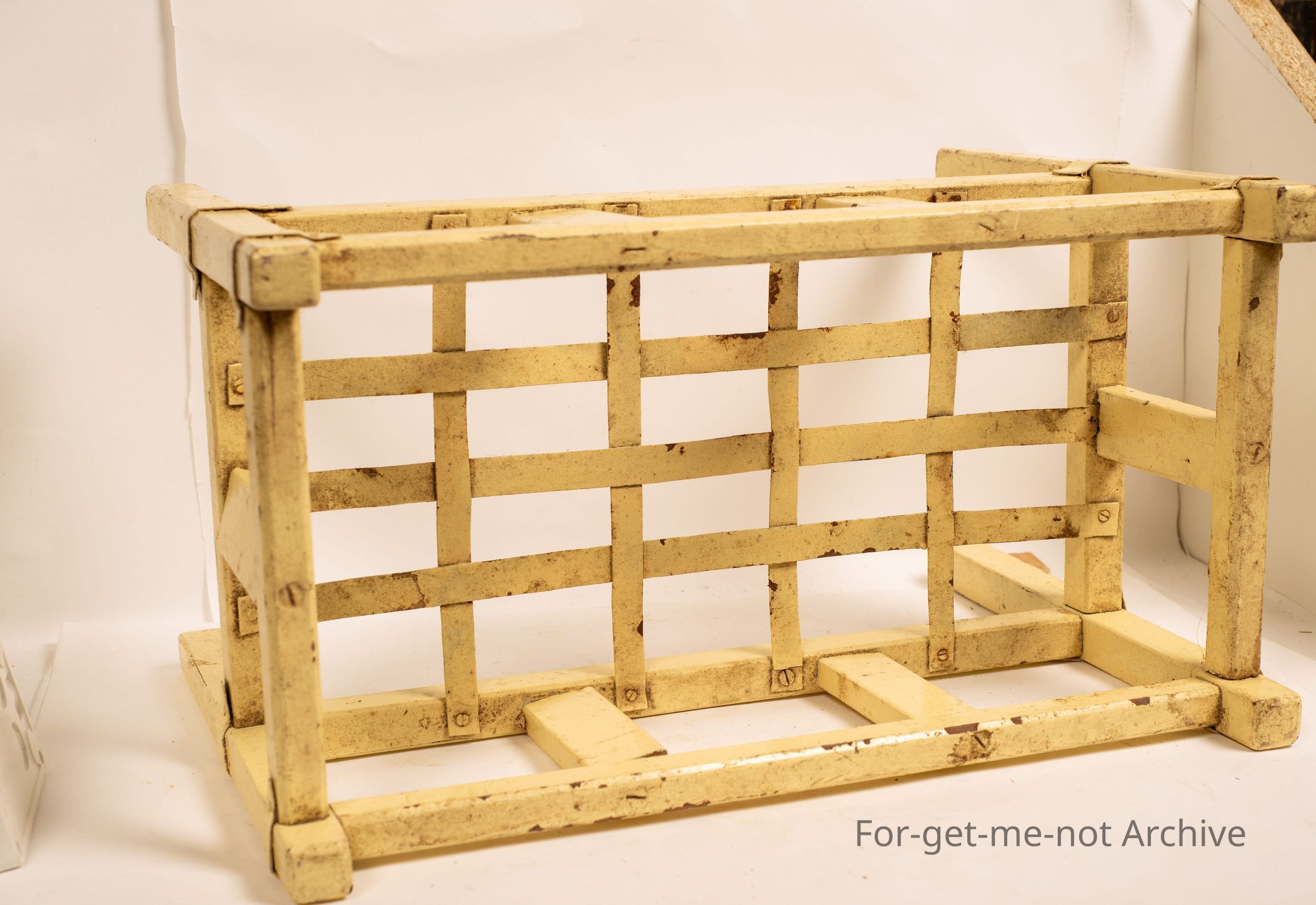 A doll's bed. Looks like a Depression improvisation piece with a wire strap base and wire corners. Quite well made, painted cream